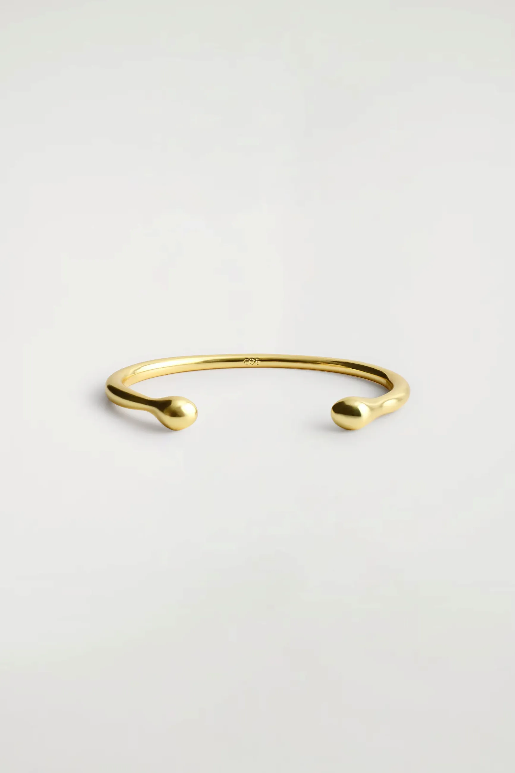 В коллекции аксессуаров COS особое внимание уделяется скульптурным формам. Этот изысканный браслет украшен деталями в форме капель, напоминающими расплавленный металл. Он изготовлен из позолоченного металла.