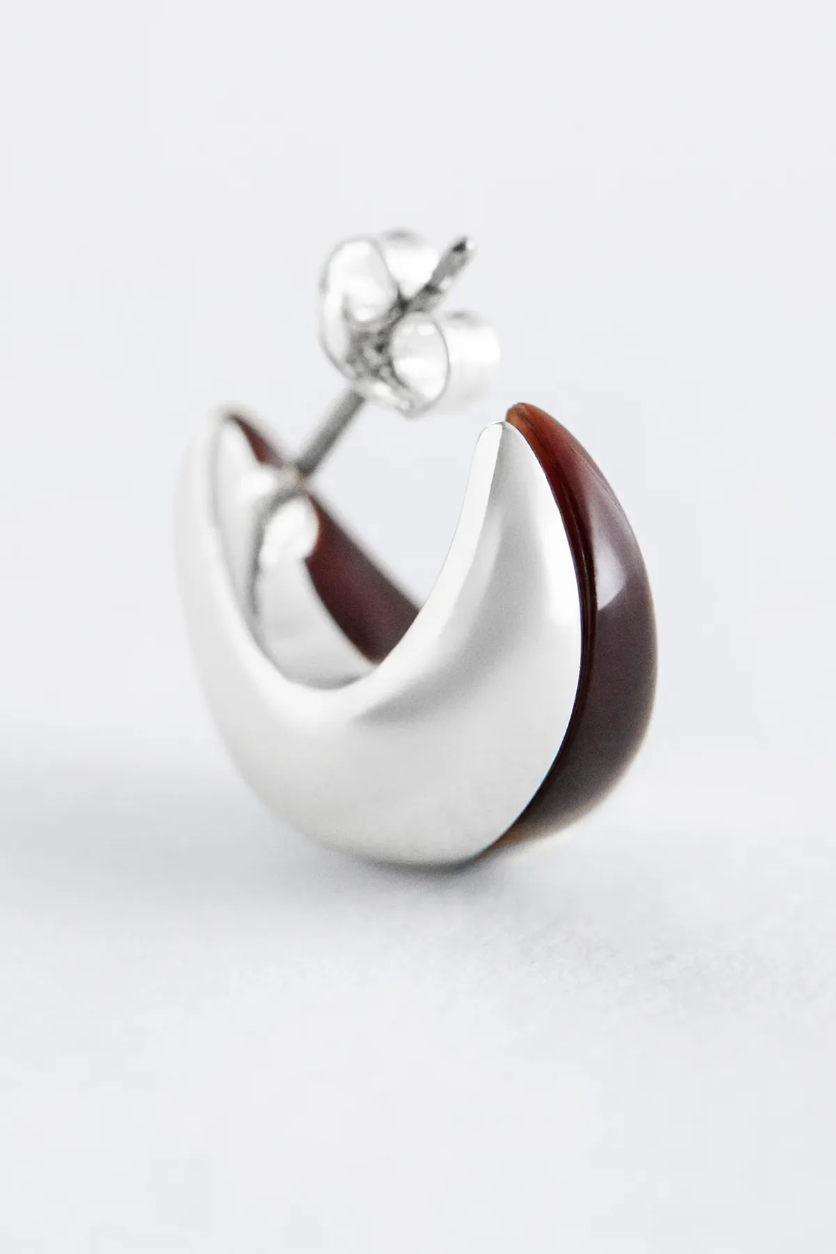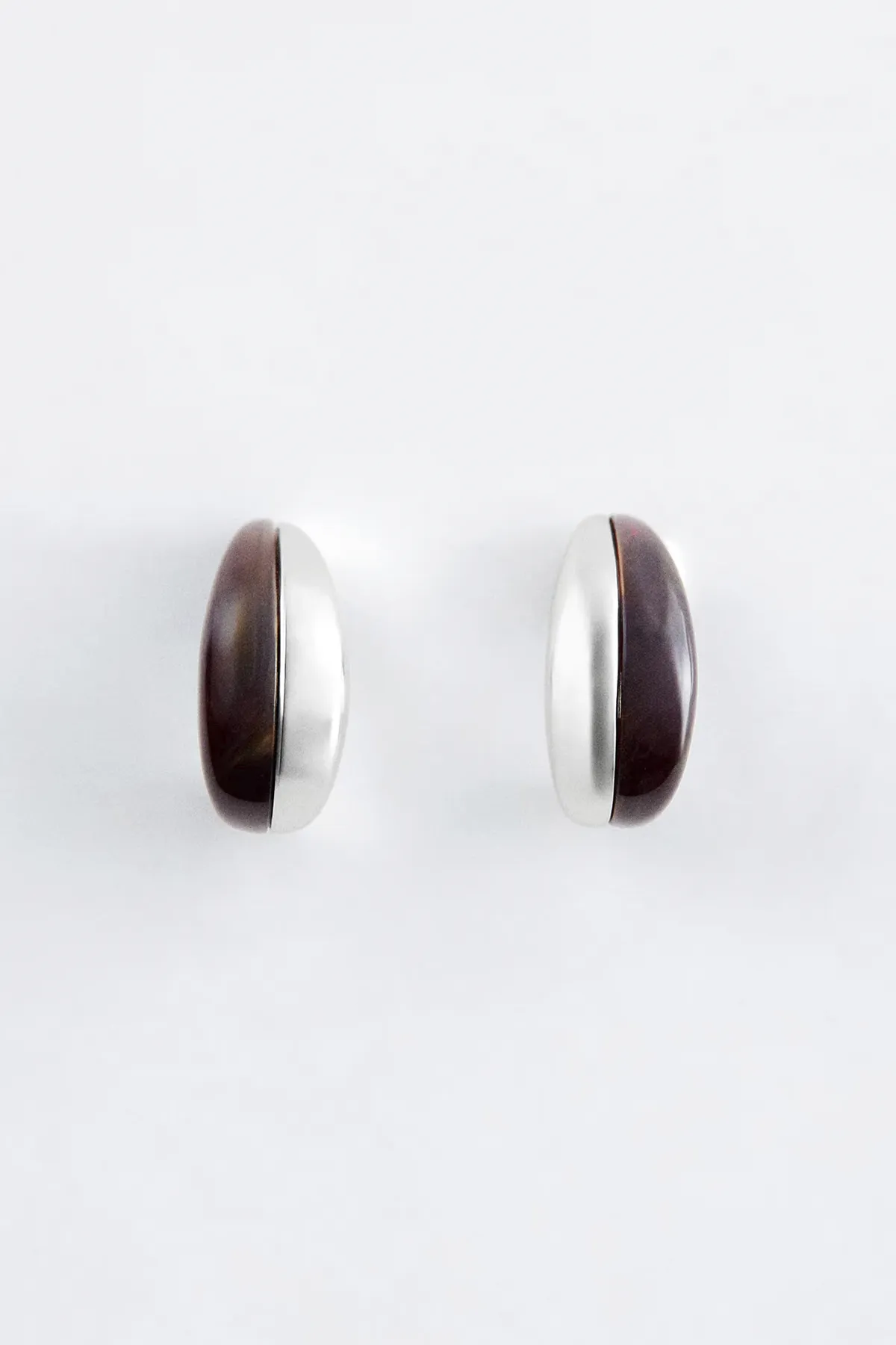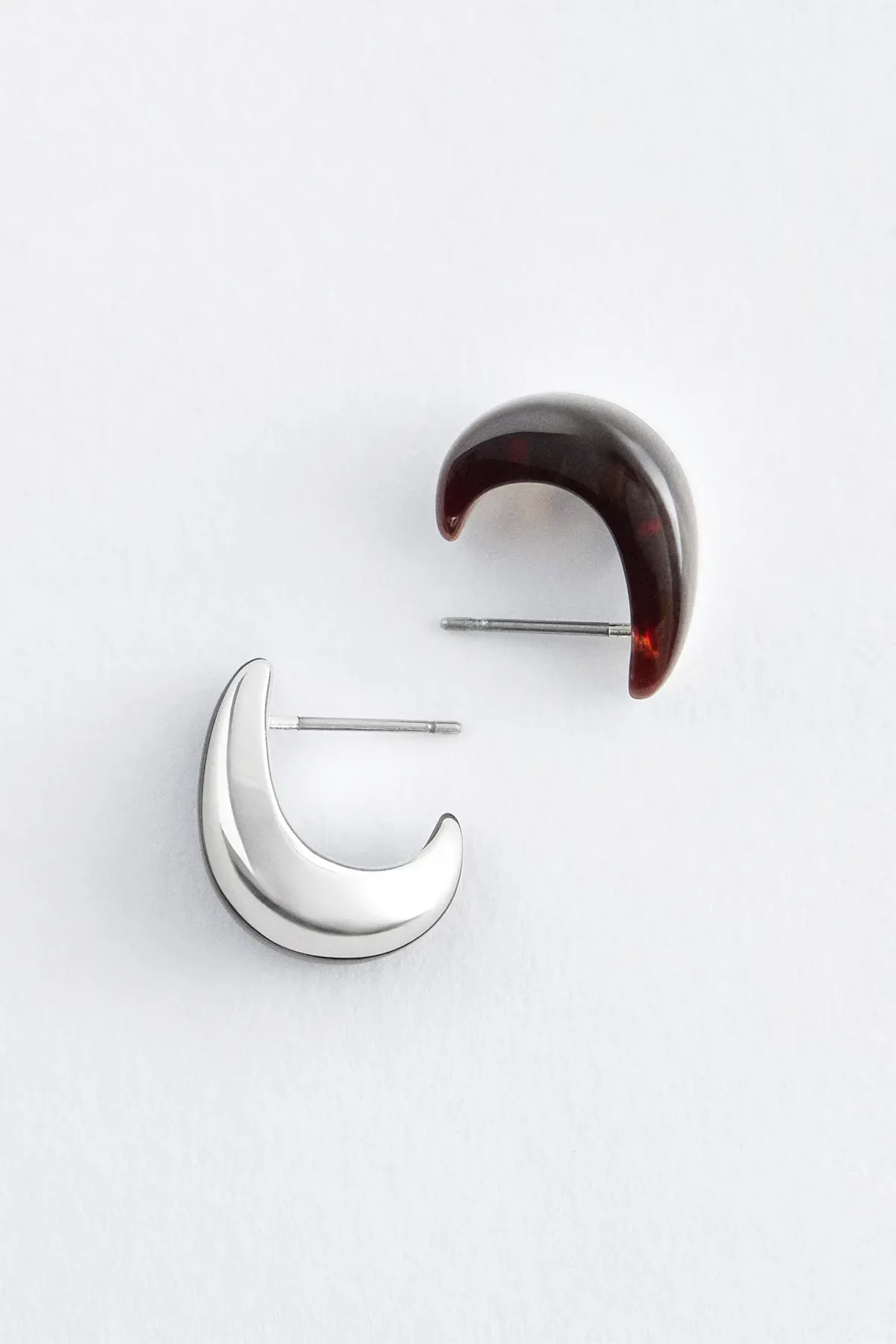 Эти изящные серьги округлой асимметричной формы, изгибающейся под мочкой уха. Одна сторона выполнена из серебристой латуни, а другая - с мраморным покрытием, что создаёт сияющую, контрастную игру текстур.