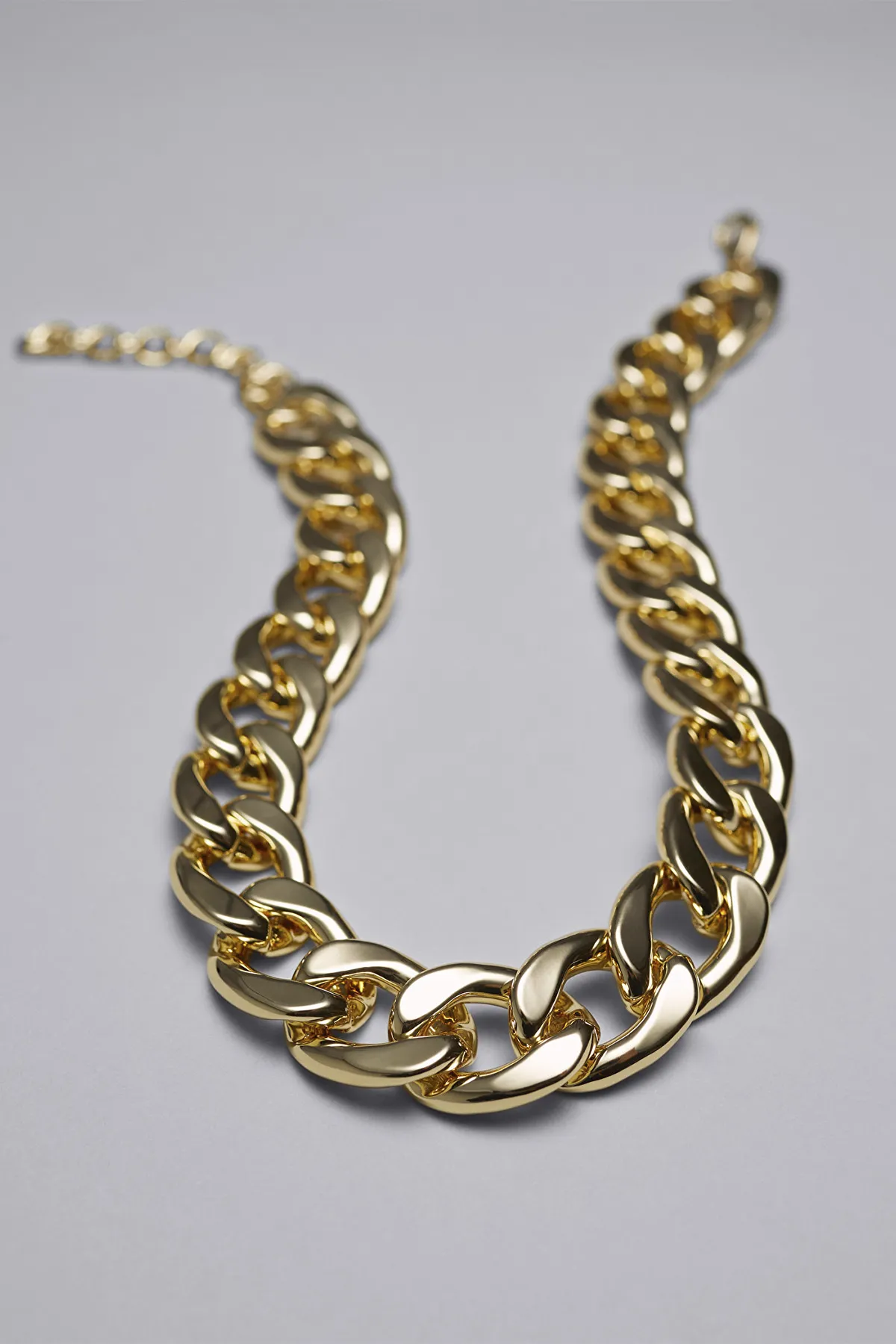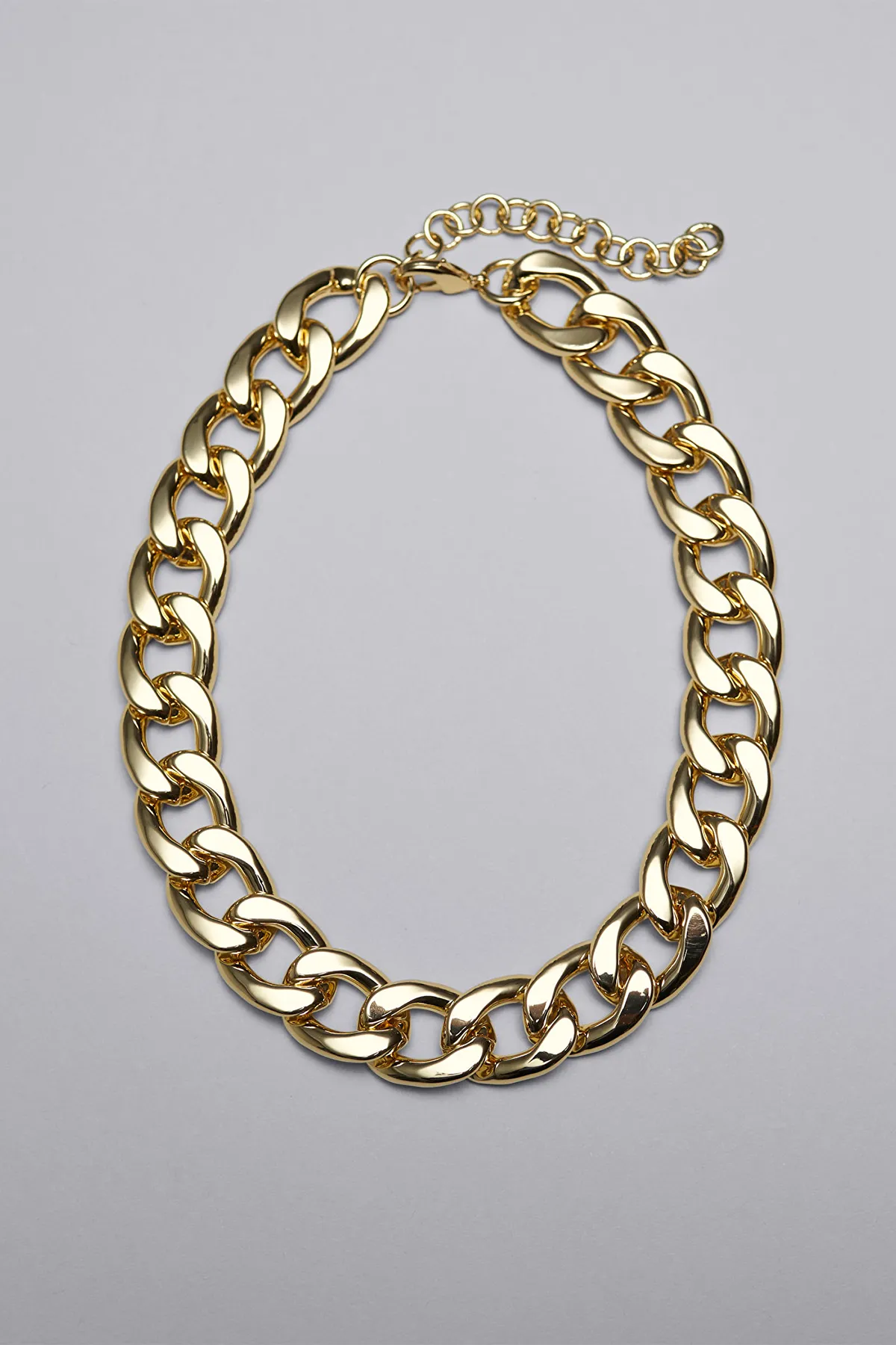Объемная короткая колье-цепочка с застежкой-карабином и удлинительной цепочкой.