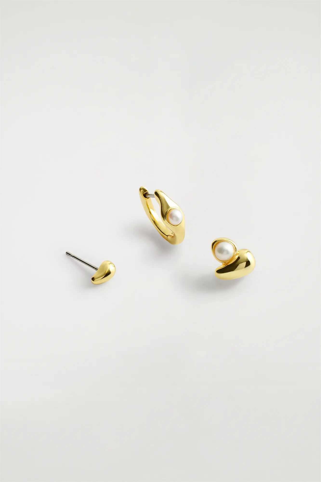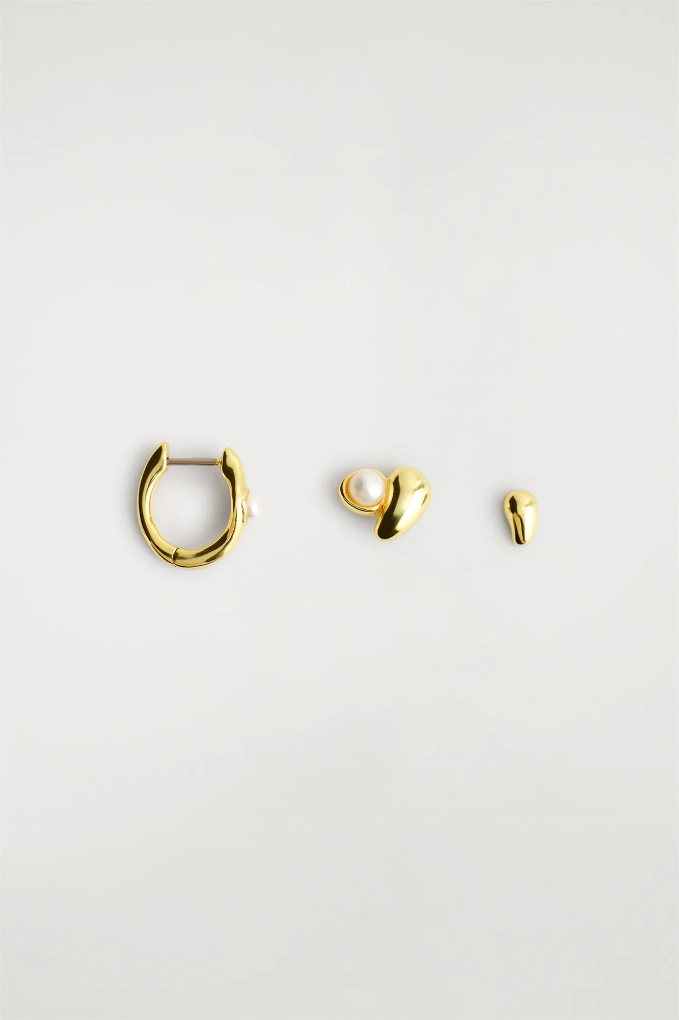 Коллекция аксессуаров COS ориентирована на скульптурные формы. Этот набор из трех разнородных сережек состоит из колец и пусет, две из которых украшены элегантными пресноводными жемчужинами. Все три изготовлены из позолоченного металла, что придает им очень изысканный вид.