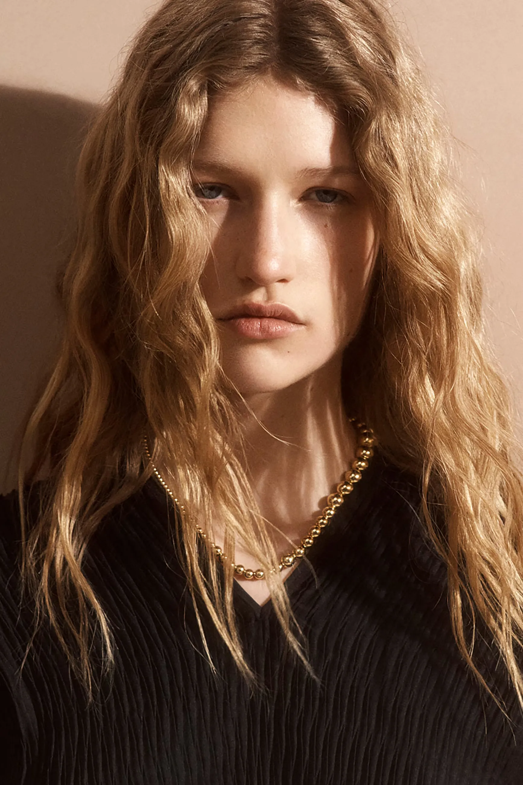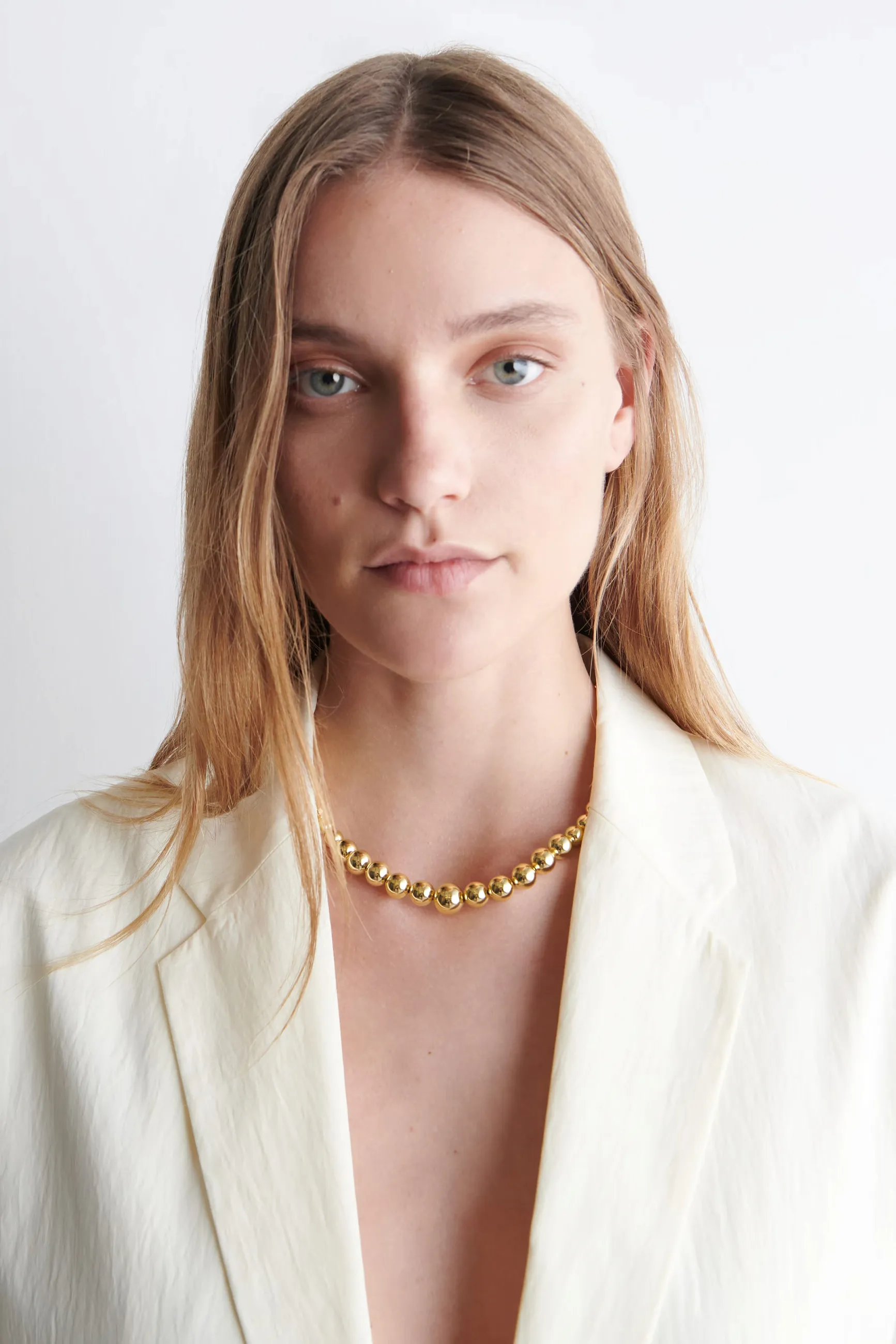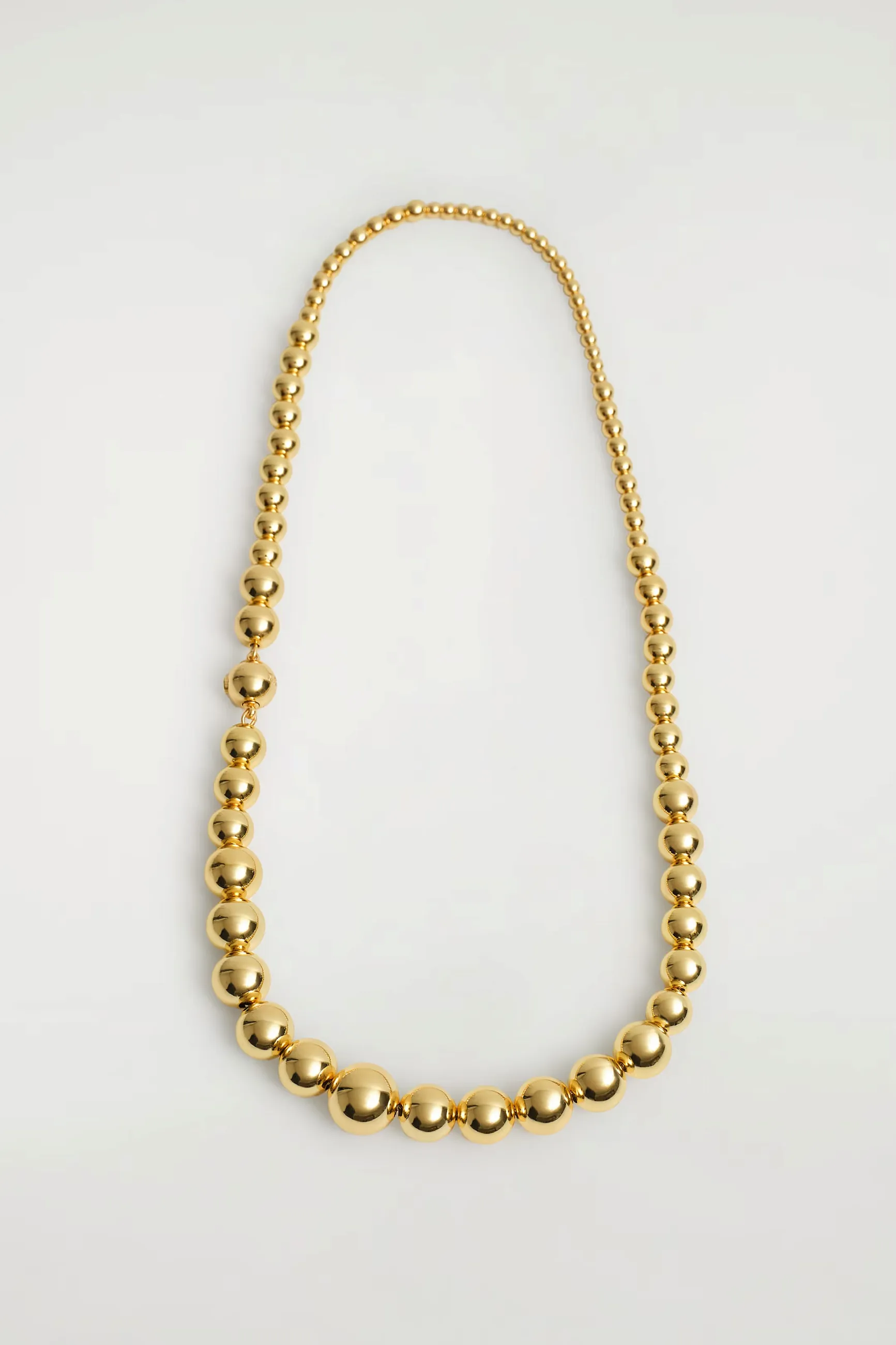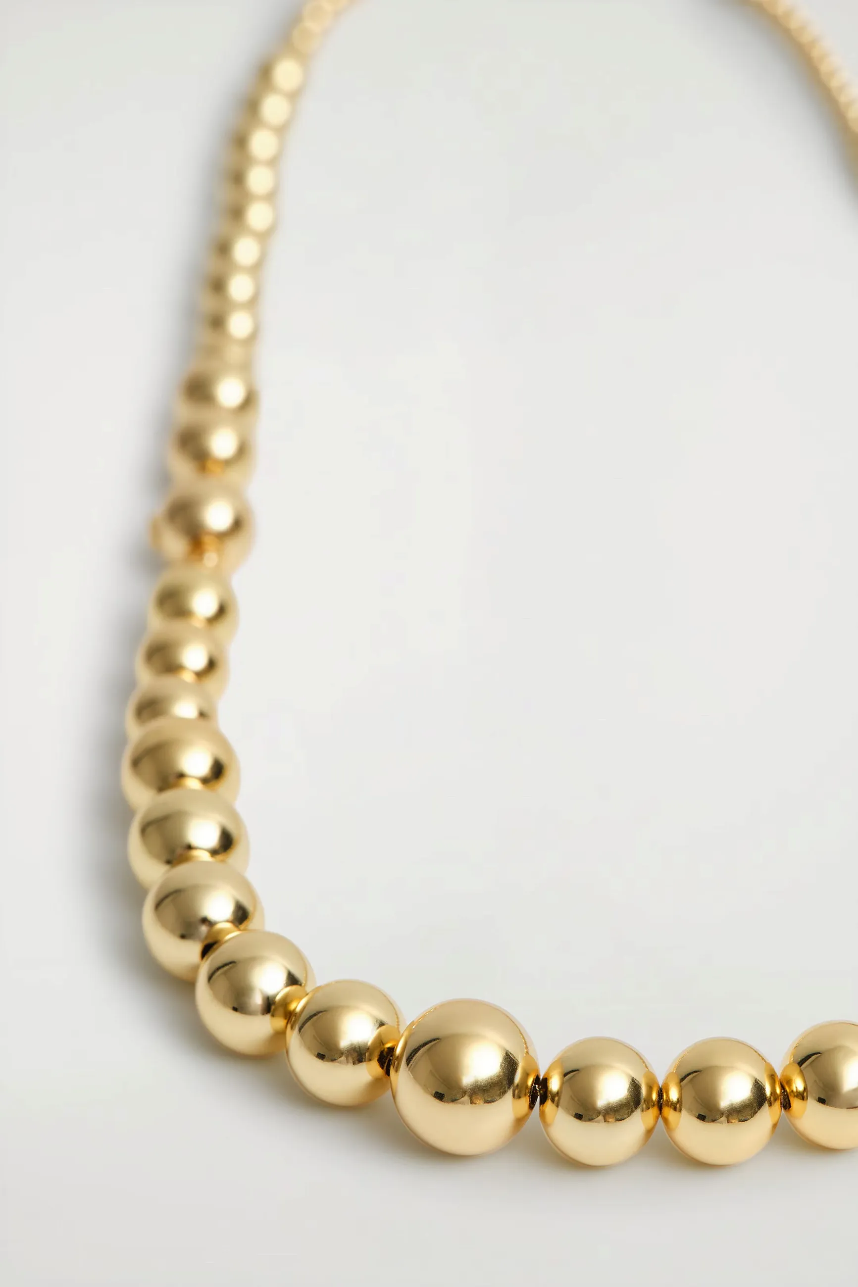 Это поразительное ожерелье напоминает нежные капли икры. Оно изготовлено из позолоченного металла и украшено нерегулярными бусинами и тонкой сферой, которая также служит застежкой. Оно привнесет нотку изысканности в любой ансамбль.