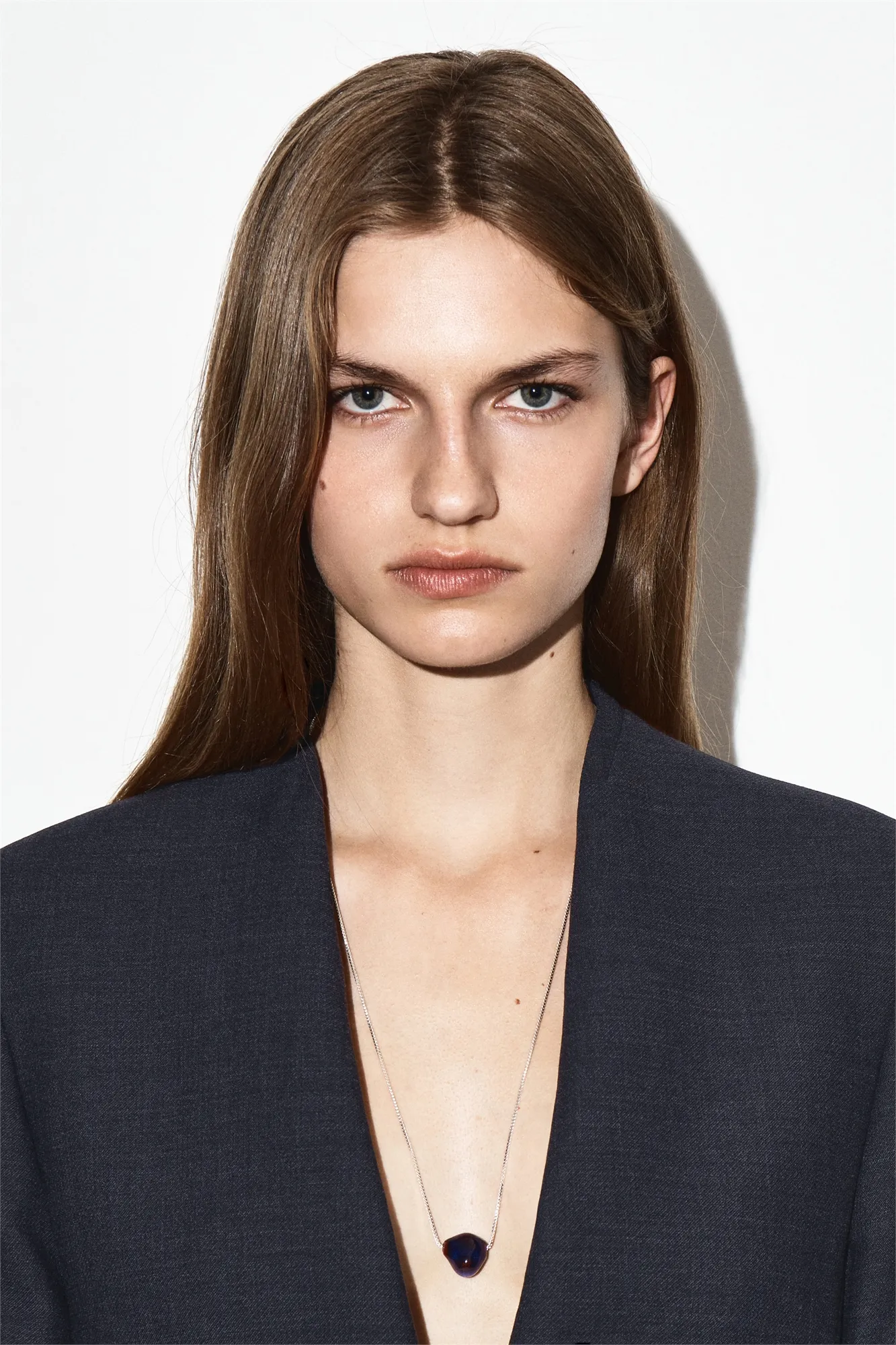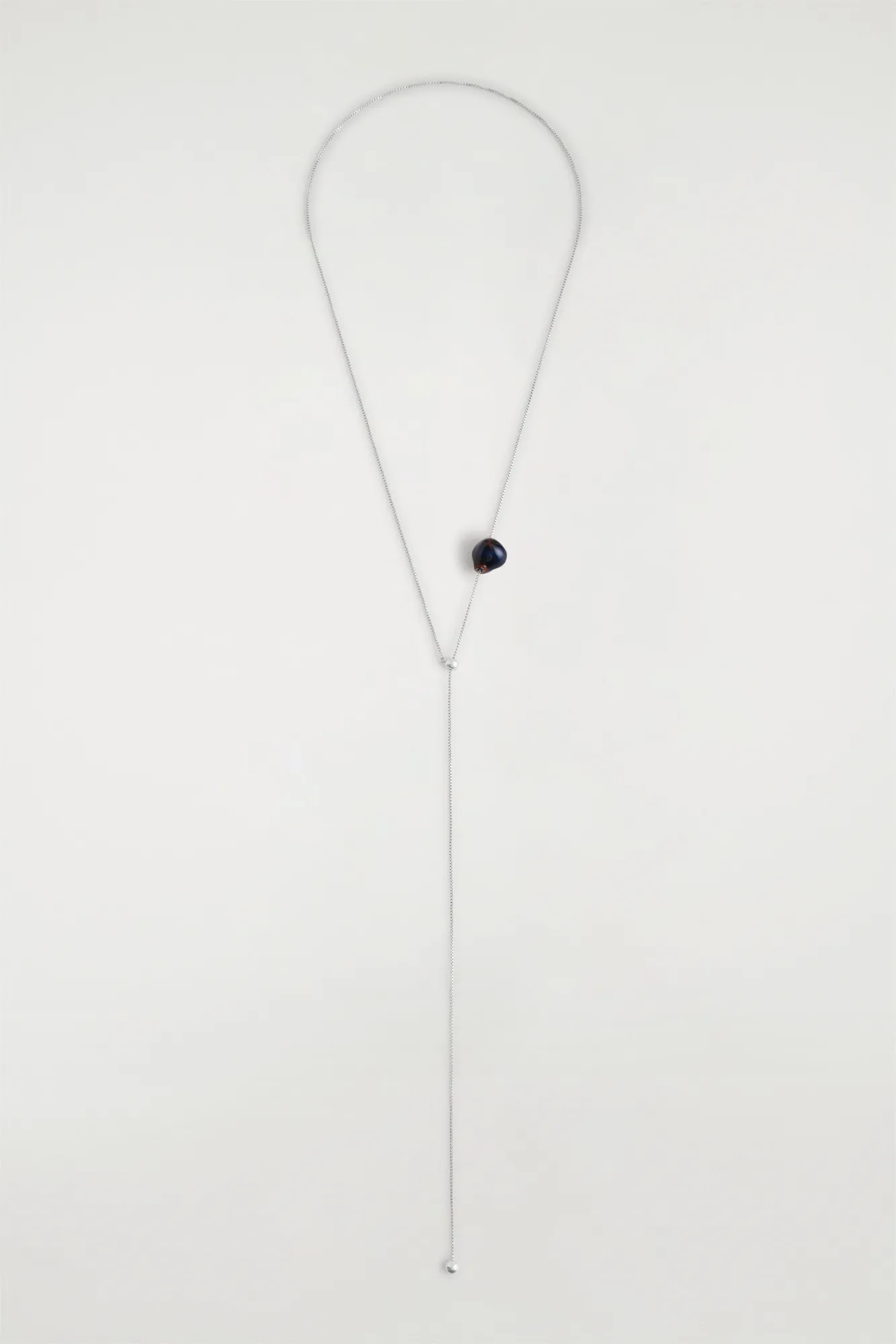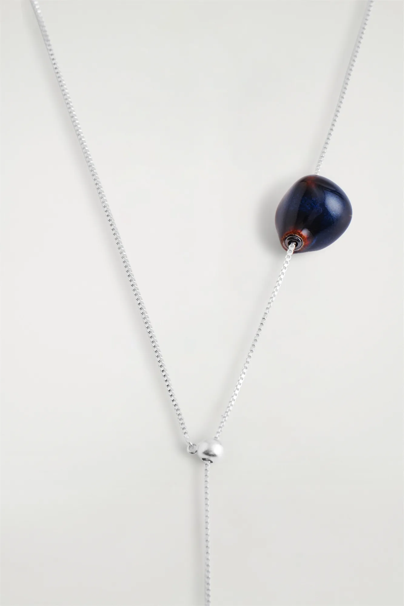 Это современное ожерелье придаст вашему образу скульптурный шарм. Игра различных материалов особенно впечатляет: керамический камень насыщенного темно-синего цвета органичной формы прекрасно контрастирует с посеребрённой латунной сферой. Благодаря удлинительной цепочке вы можете регулировать длину украшения в соответствии с вашим нарядом.
