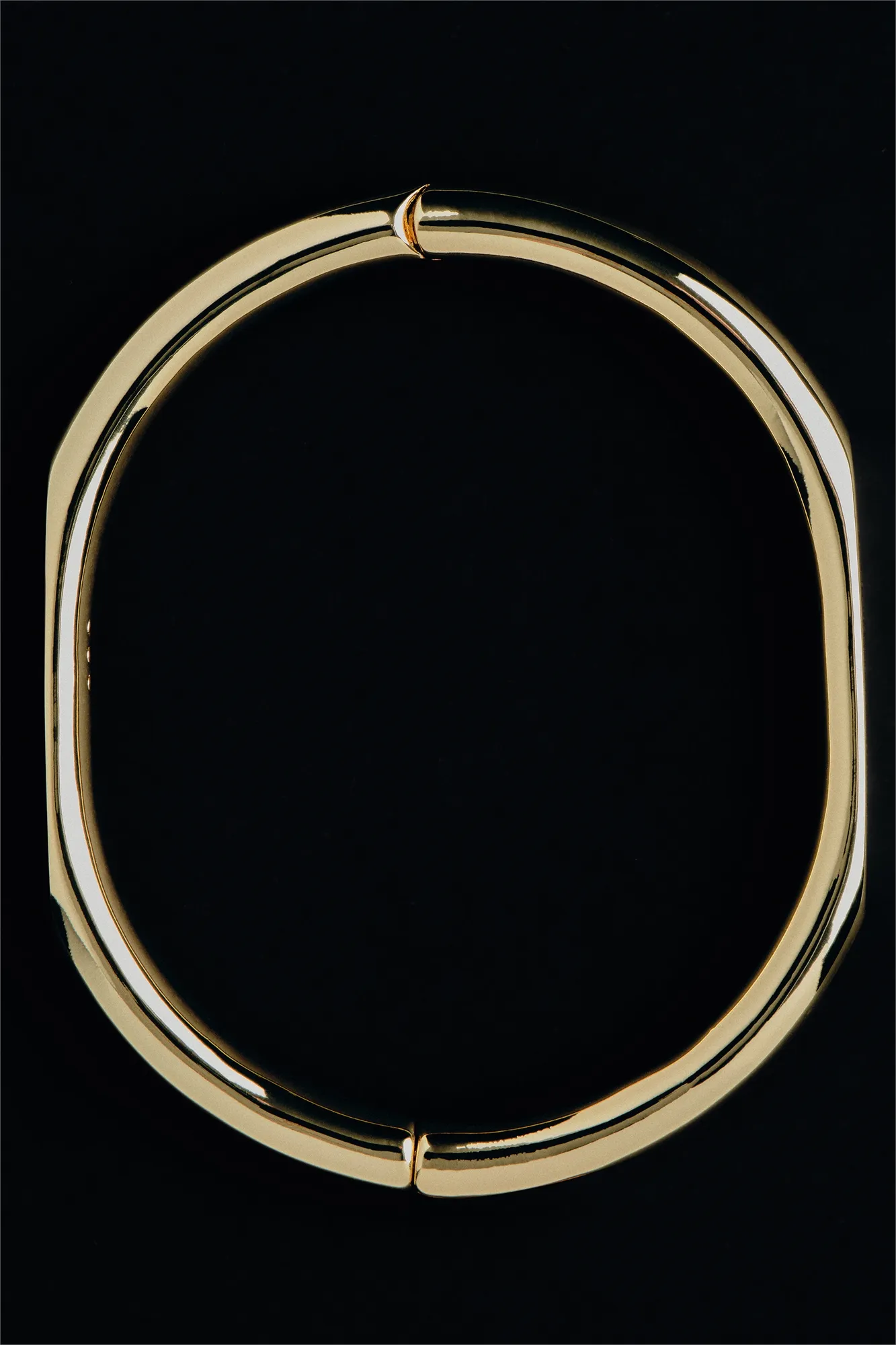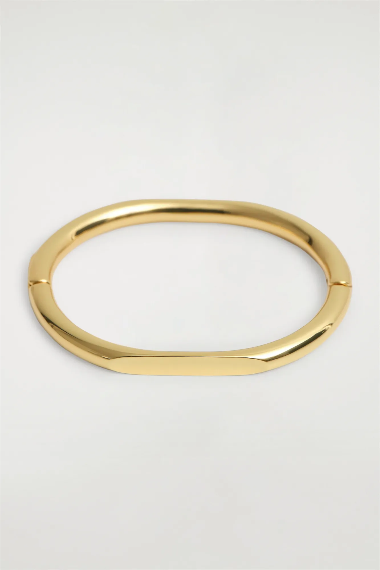 Этот простой, но эффектный браслет изготовлен из переработанной позолоченной латуни. Блестящий аксессуар имеет скульптурный силуэт со скошенными краями, что придаёт ему изысканный вид.