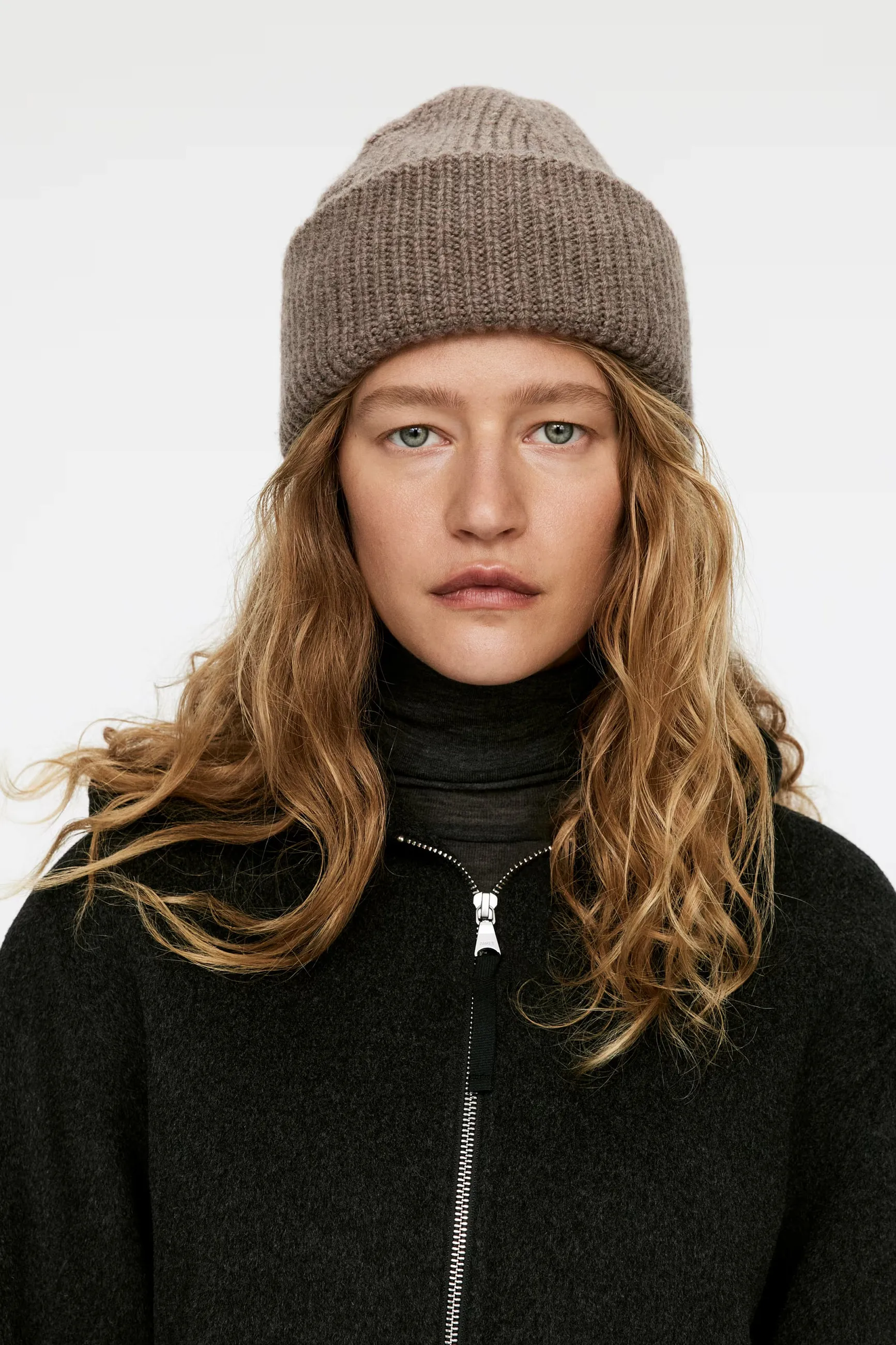 Двойная шерстяная шапка, связанная полукардиганом. Эта шапка содержит 100% шерсти RWS (TE-00047206). Изделия, сертифицированные по стандарту Responsible Wool Standard (RWS), содержат шерстяное волокно с ферм, прошедших независимую сертификацию по требованиям к благополучию животных и управлению земельными ресурсами.