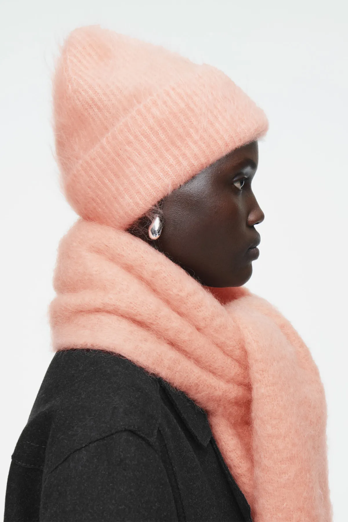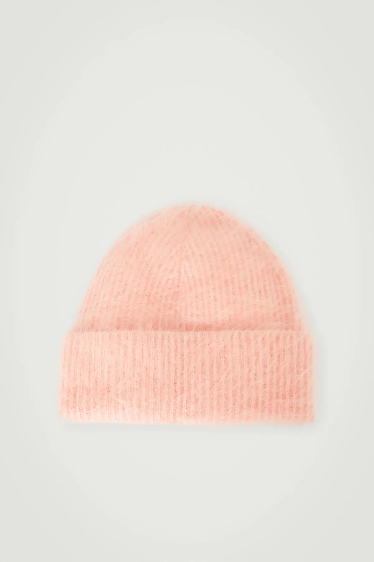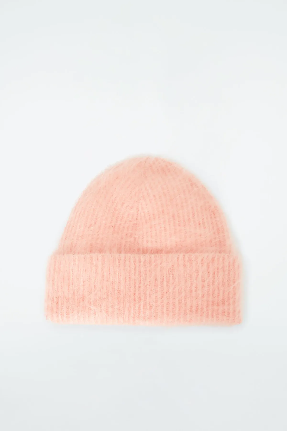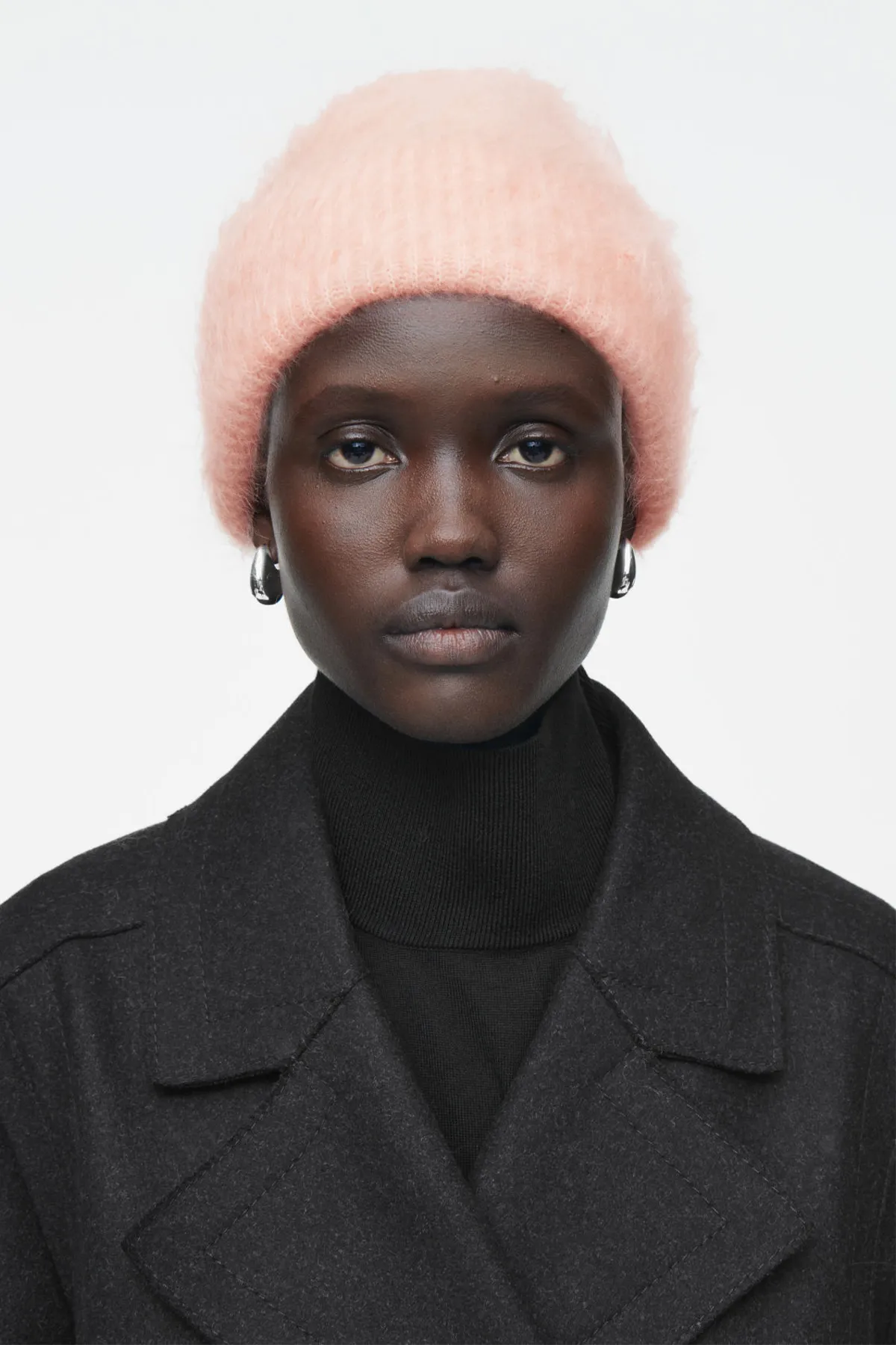 Эта уютная шапка, предлагаемая в пудрово-розовом оттенке, связана из смеси мохера, сертифицированной по стандарту Responsible Mohair. Она ребристая, чтобы сохранять тепло, мягкая, пушистая на ощупь и имеет широкий отворот. Создай комплект с подходящим шарфом.