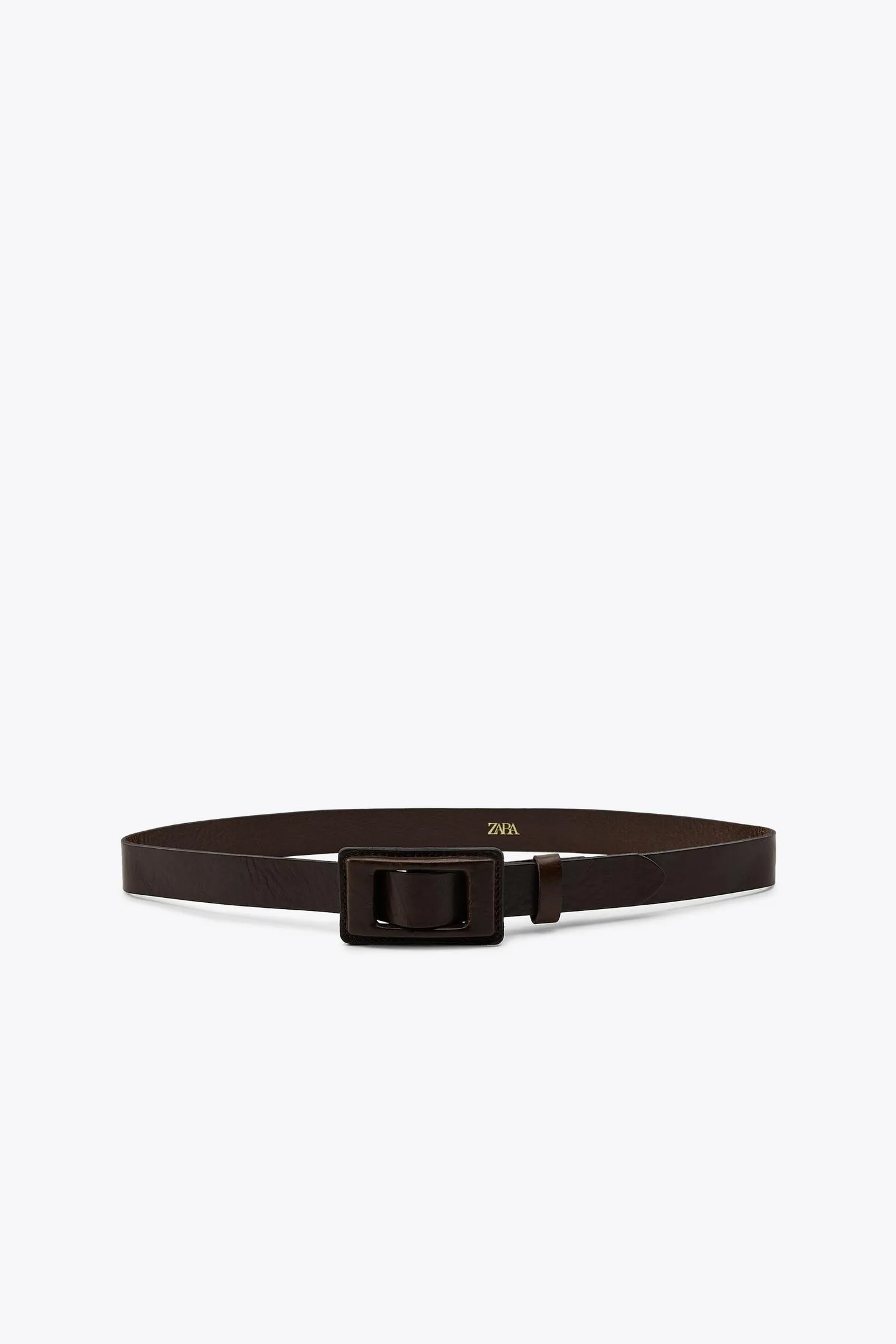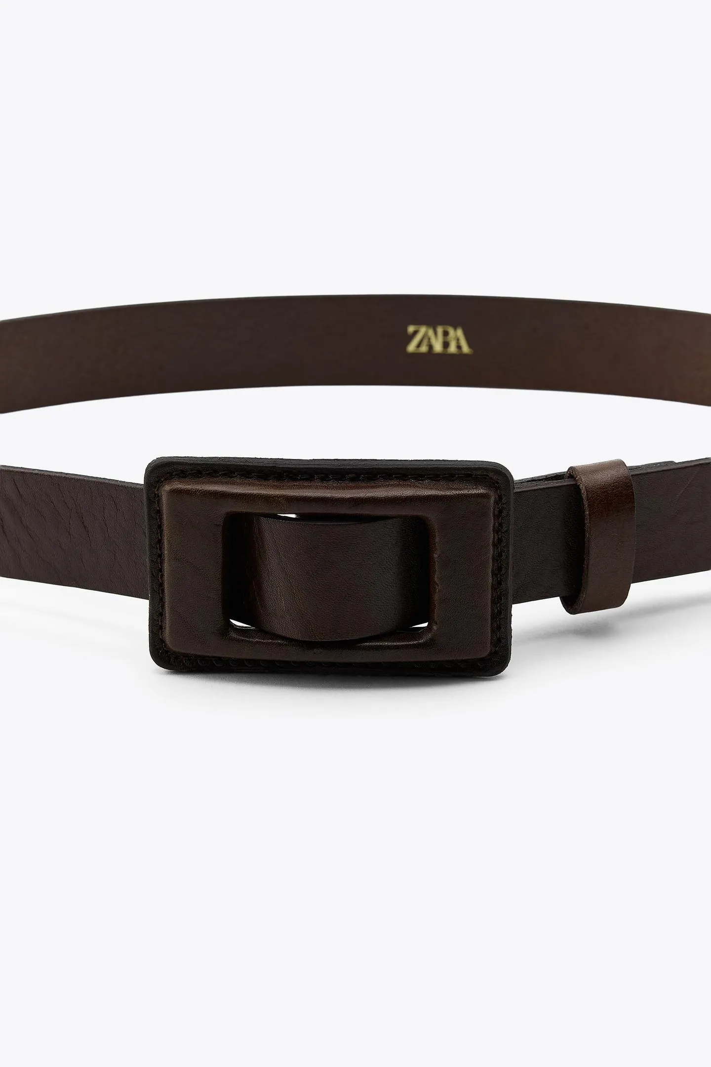Кожаный ремень шириной 3 см. Прямоугольная металлическая пряжка, обтянутая тем же материалом.