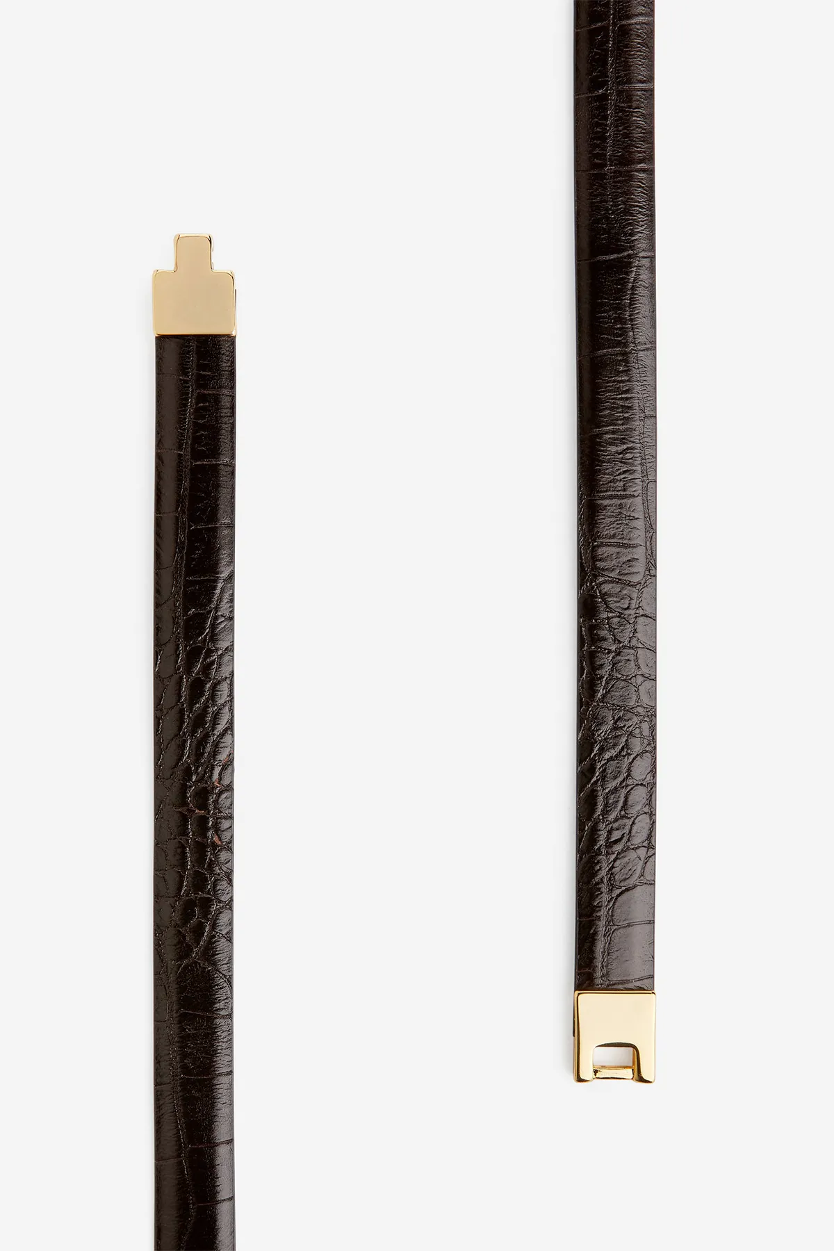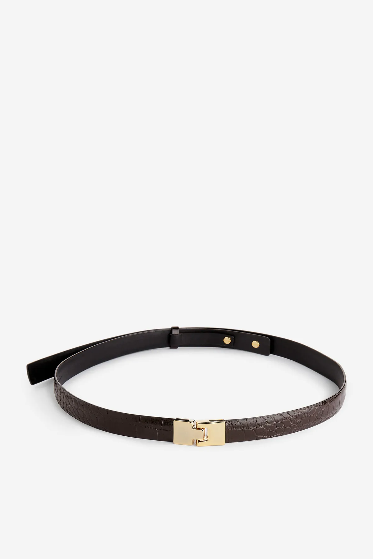 Узкий поясной ремень с тиснением под крокодила. Спереди декорирована квадратной позолоченной пряжкой. Регулируемая застежка-пряжка сзади.