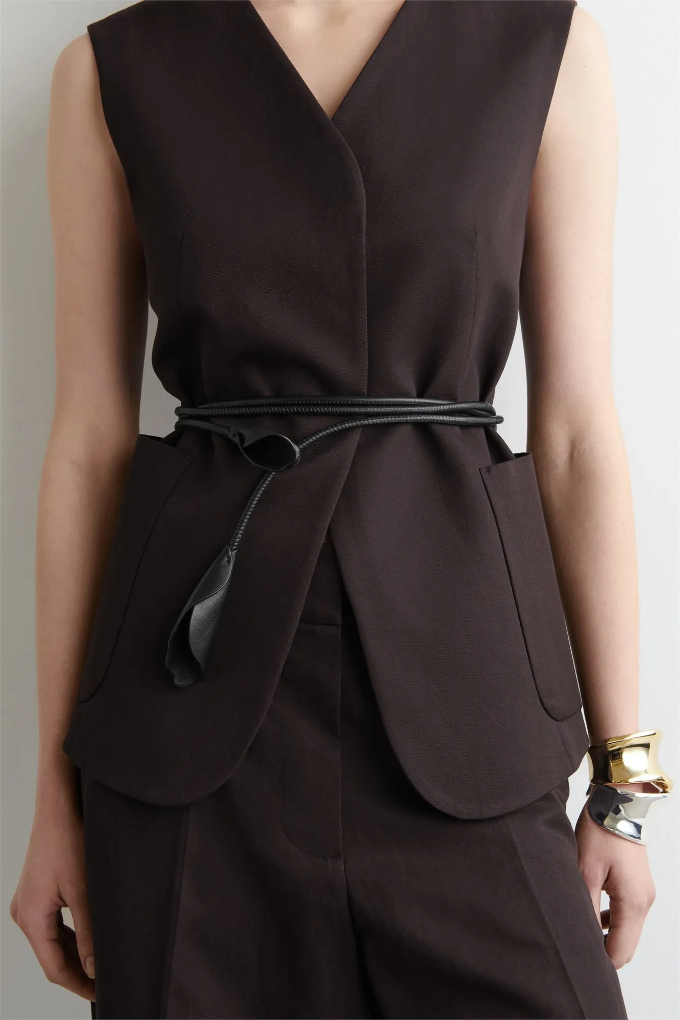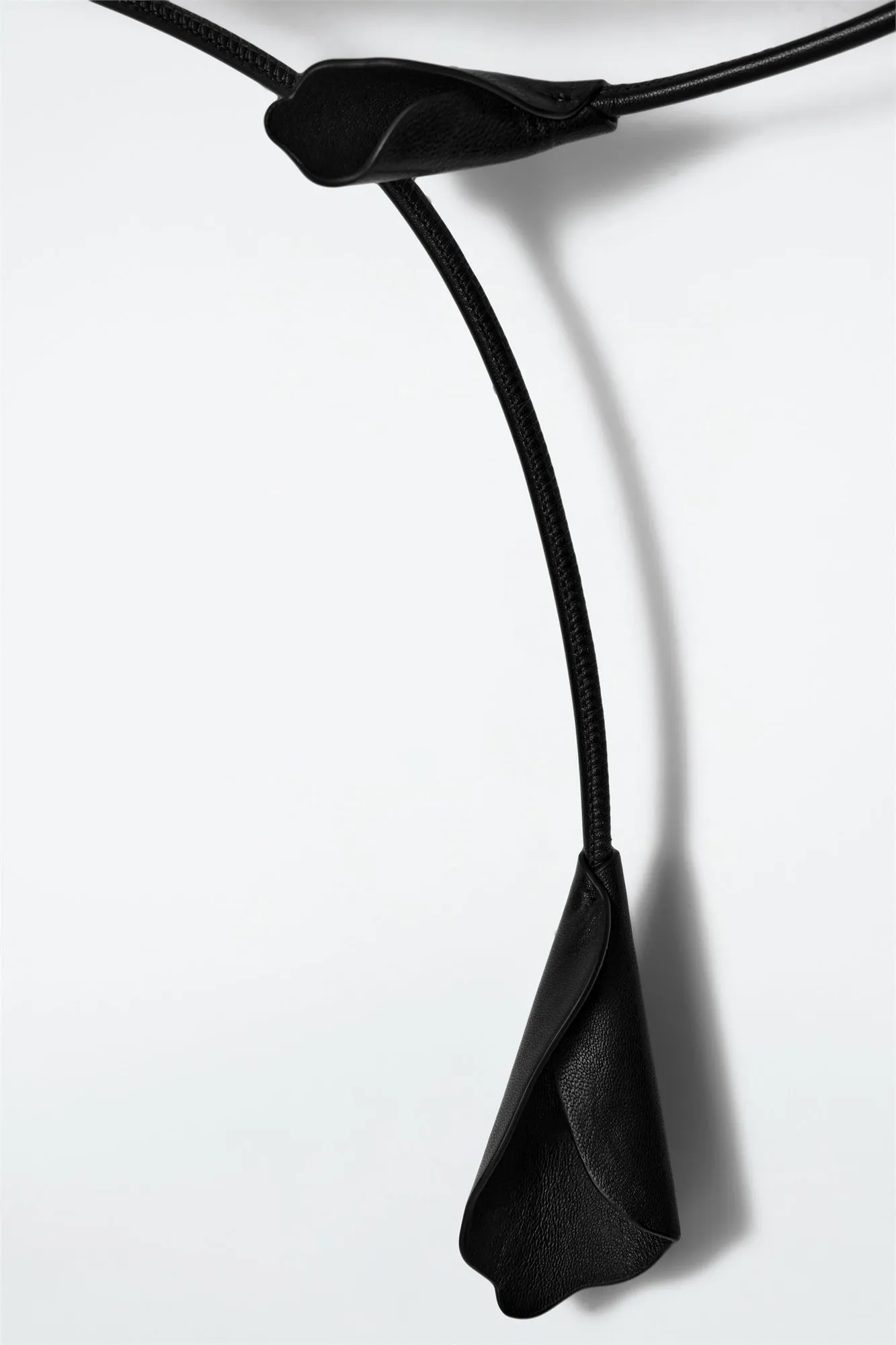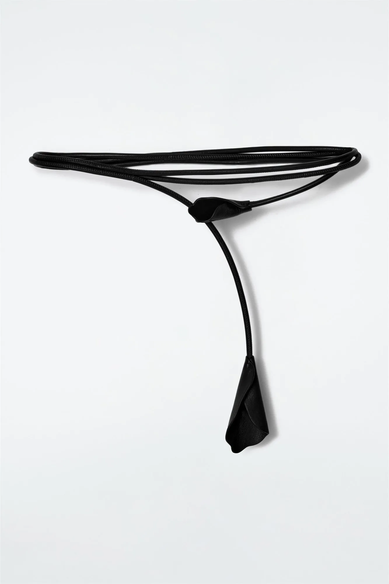 Этот изысканный ремень предназначен для ношения на талии. Аксессуар закруглен с обоих концов красивыми кожаными лилиями, одна из которых имеет незаметную петлю, через которую можно продеть другую. Ремень изготовлен из высококачественной кожи без содержания хрома и может сочетаться с различными предметами одежды: от платьев до пальто.