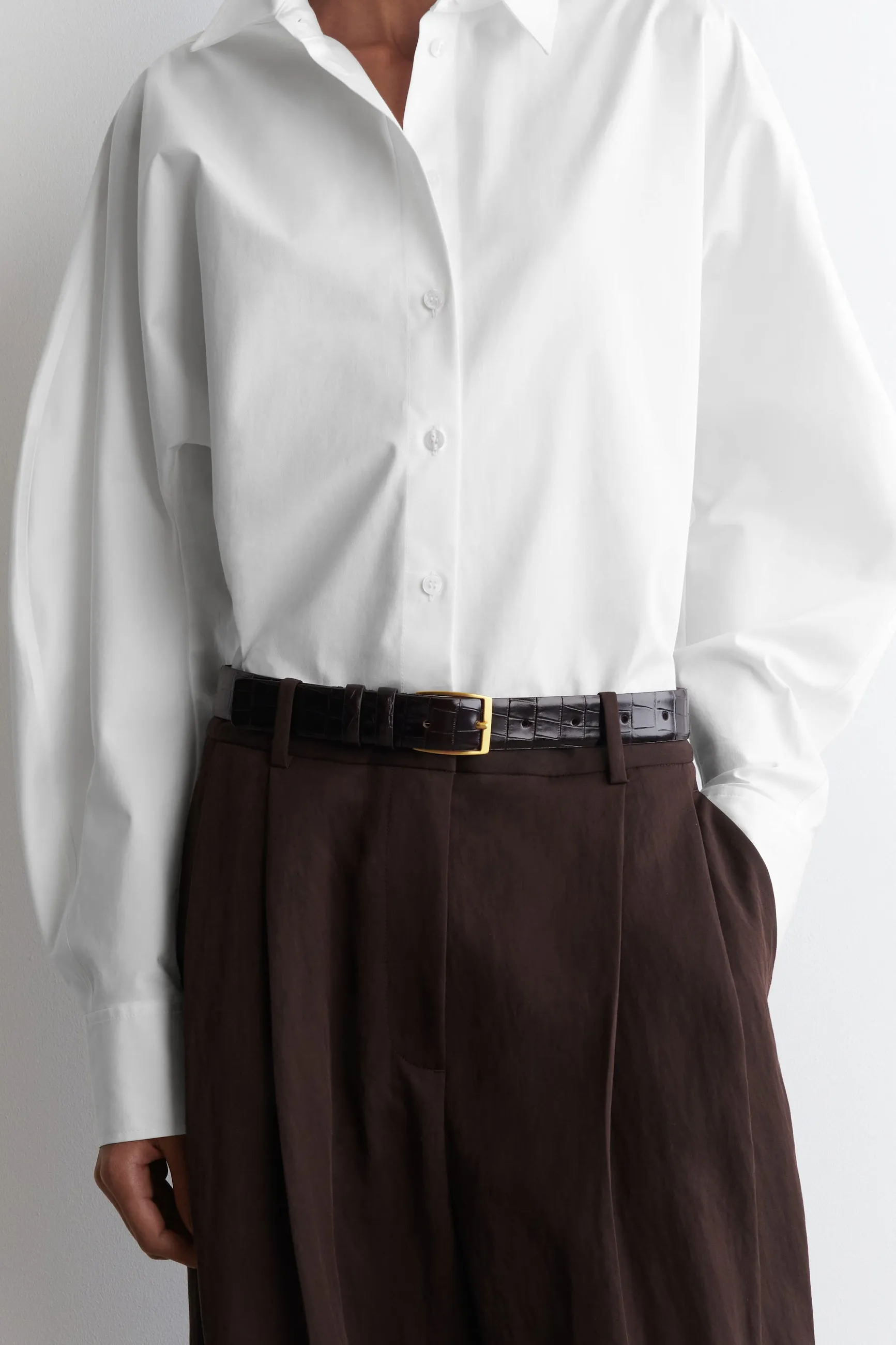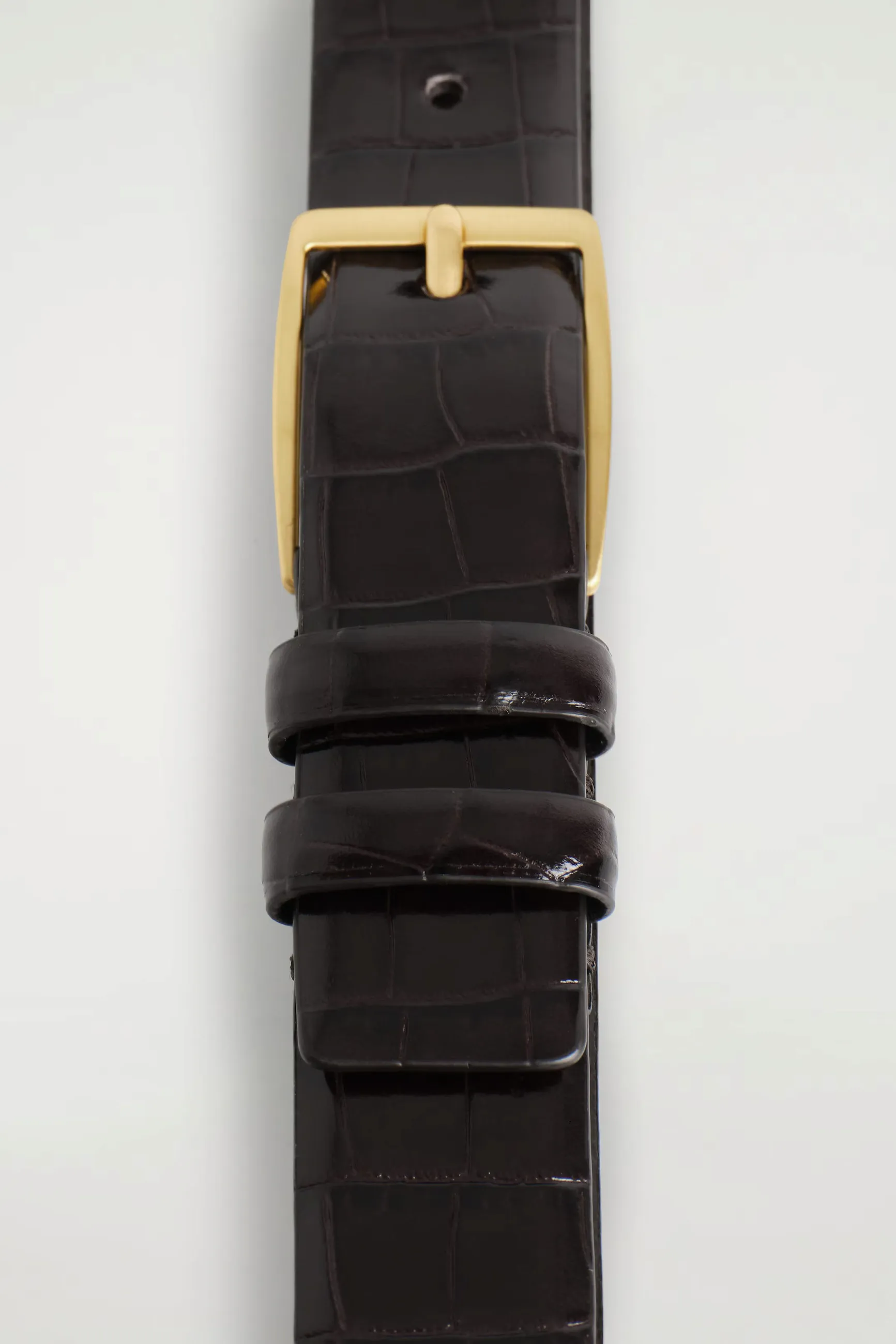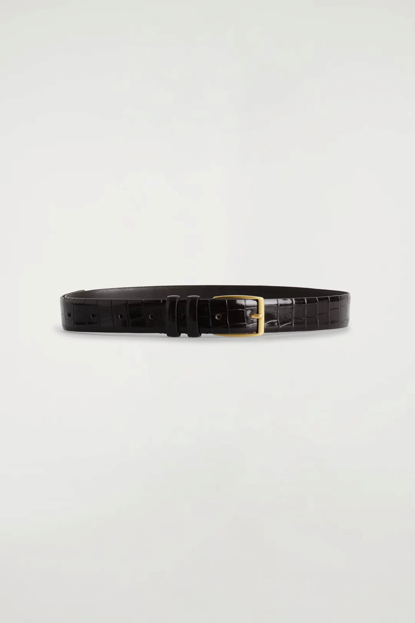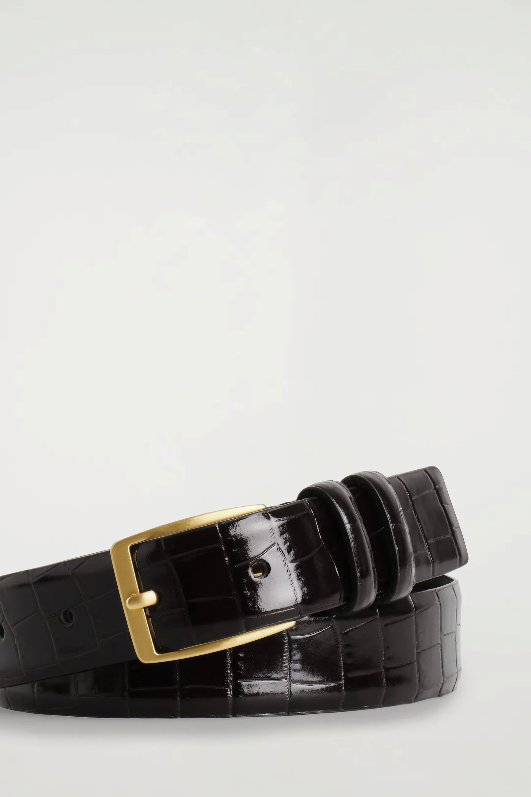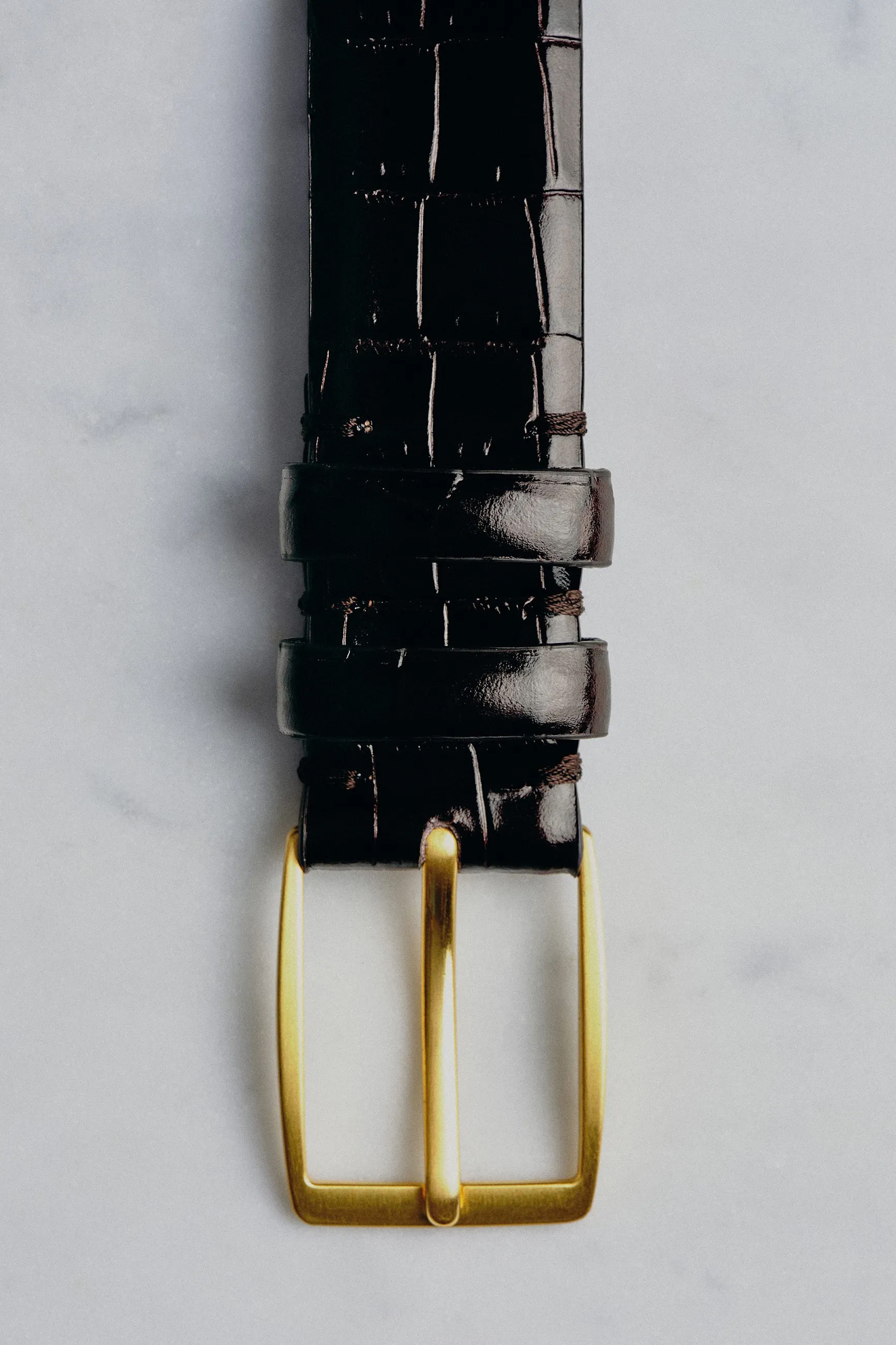 В этом сезоне этот ремень предстаёт в новом облике с динамичной текстурой. Эта модель изготовлена из высококачественной лакированной кожи с имитацией крокодиловой кожи, выделанной методом бесхромового окрашивания.