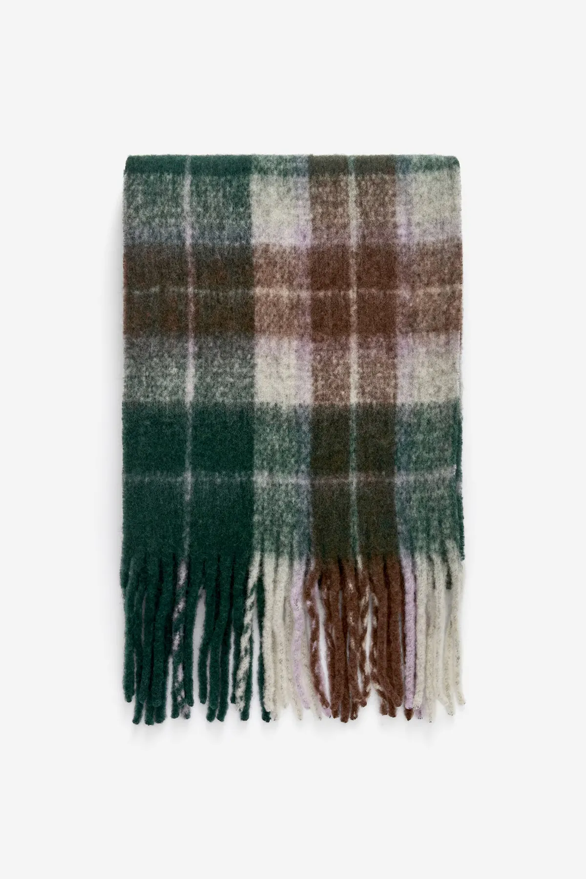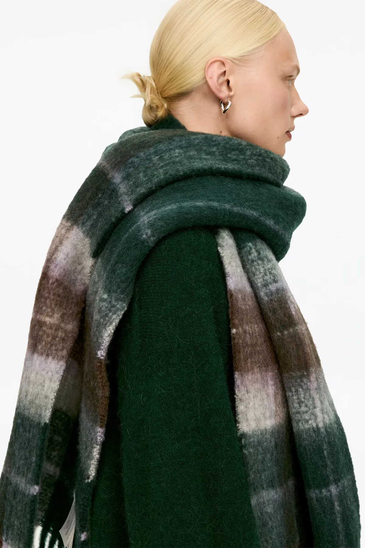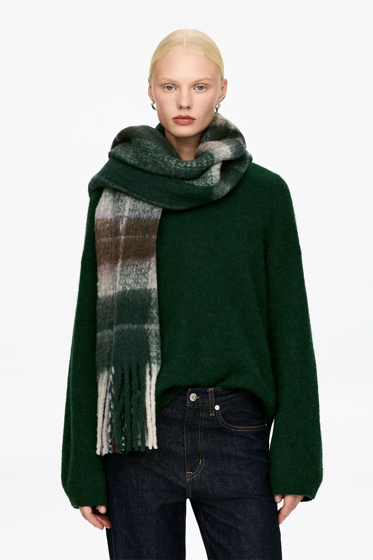 Плотный тканый шарф, изготовленный из смеси шерсти, полученной из ответственных источников (сертифицировано CU 847862RAF-01.2021), и переработанного полиэстера. Украшен клетчатым узором, окрашенным пряжей, и бахромой по краям.