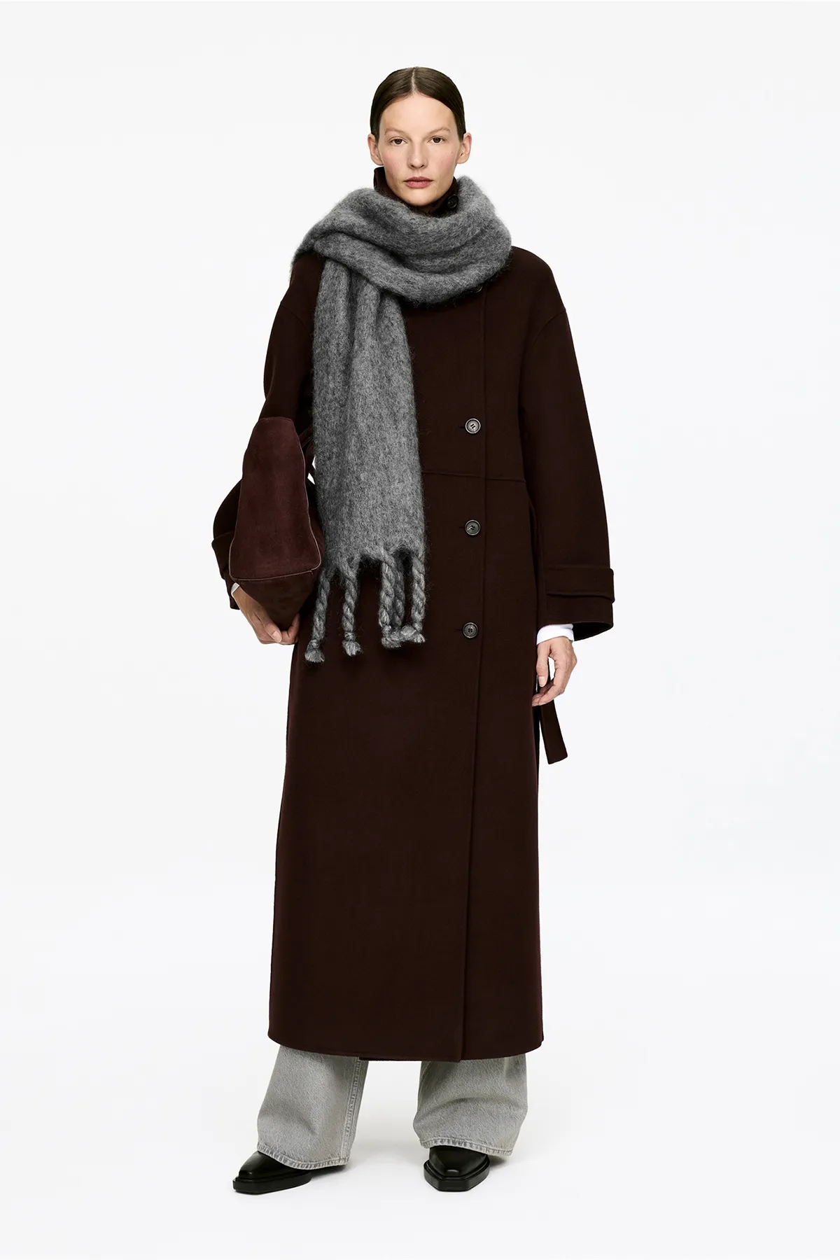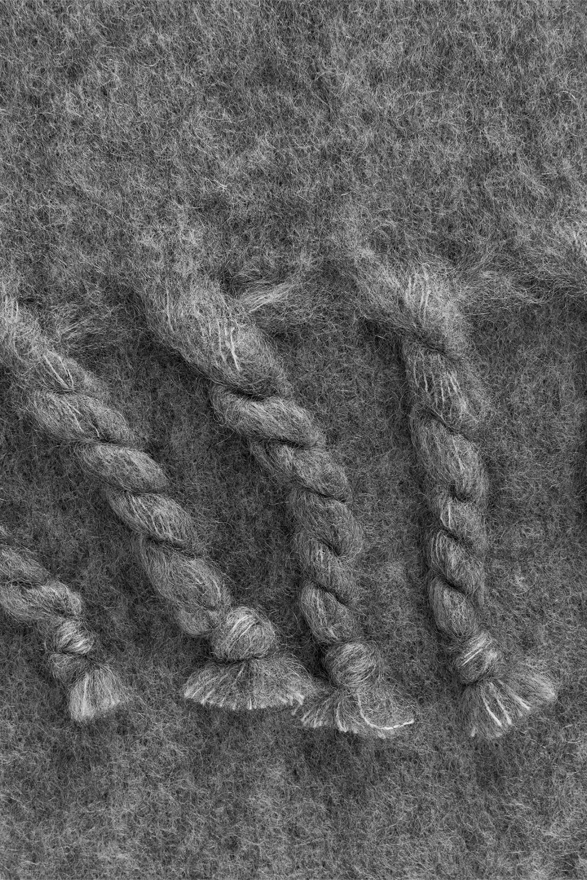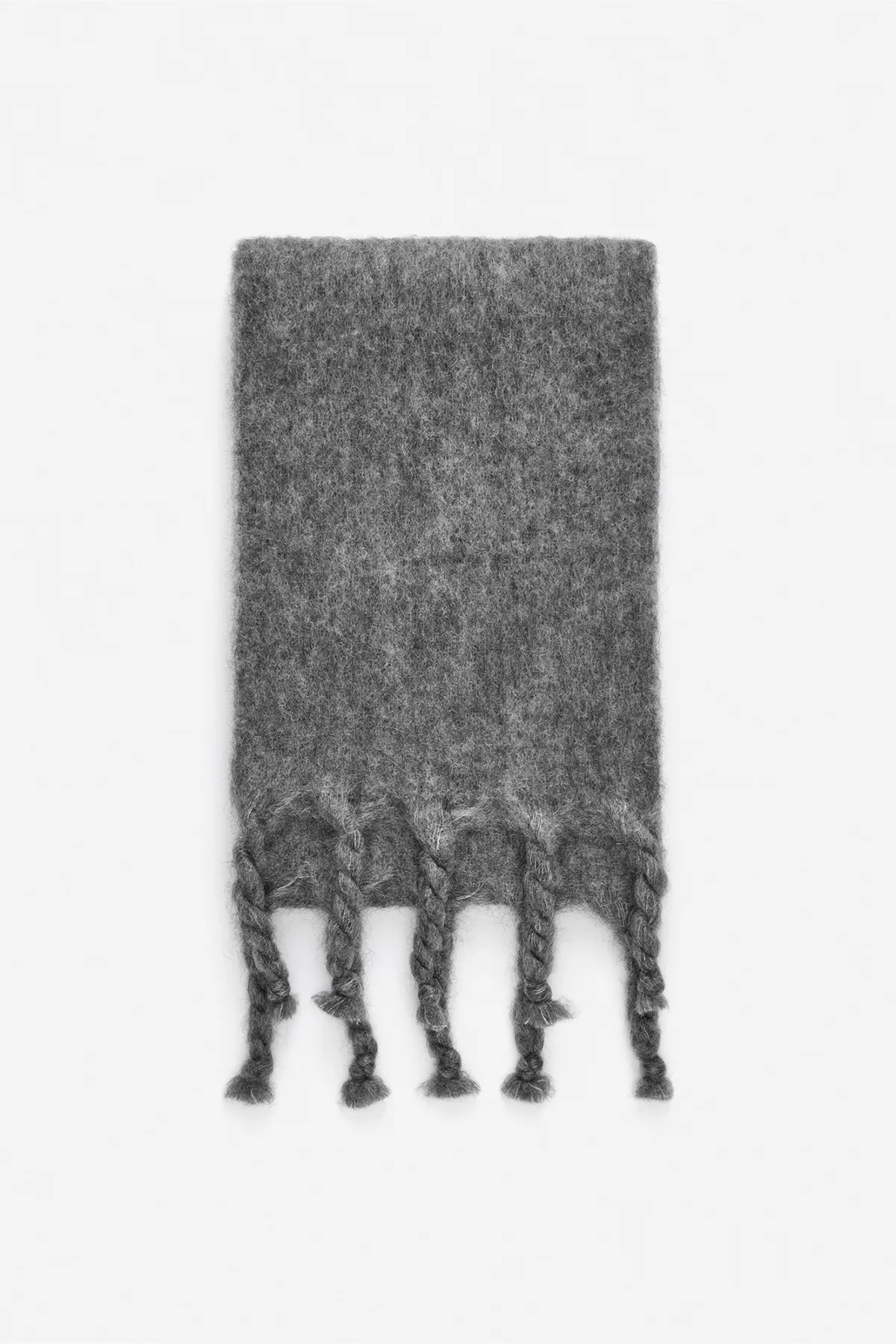 Длинный, мягкий и приятный на ощупь шарф из смеси мохера и шерсти. Украшен витой бахромой.