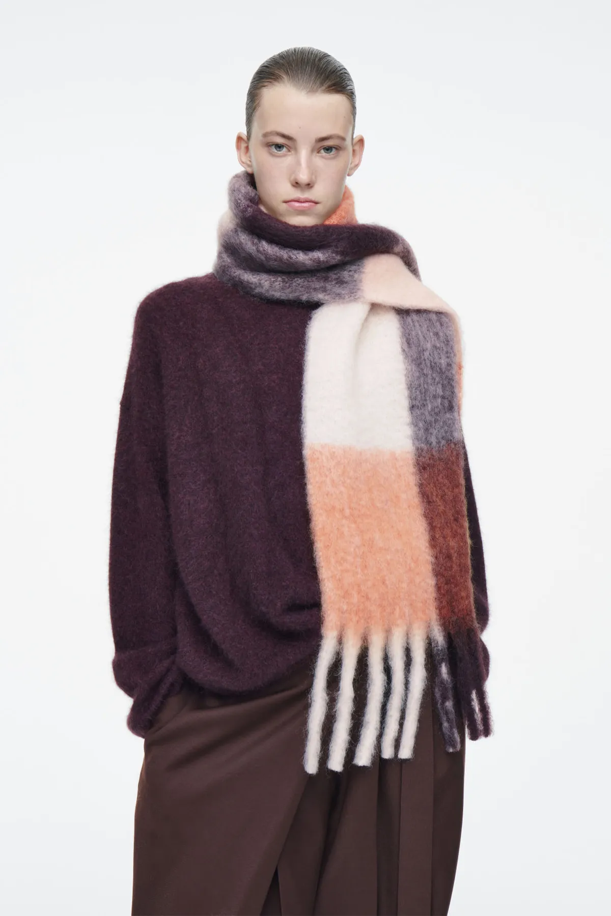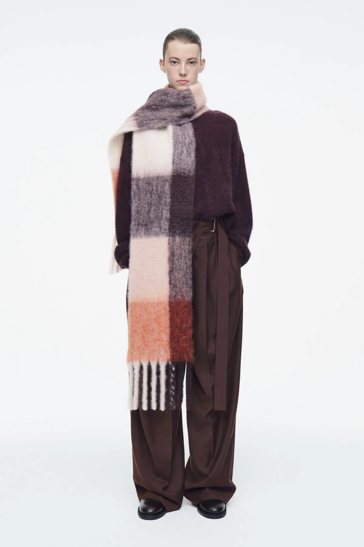 Смена сезонов требует теплых аксессуаров, таких как этот клетчатый шарф. Он связан из высококачественного мохера и шерсти, которые начесаны для мягкости и тактильного ощущения, а также украшены эмблемой COS и бахромой на концах. Создай комплект с подходящей шапкой или шляпой.