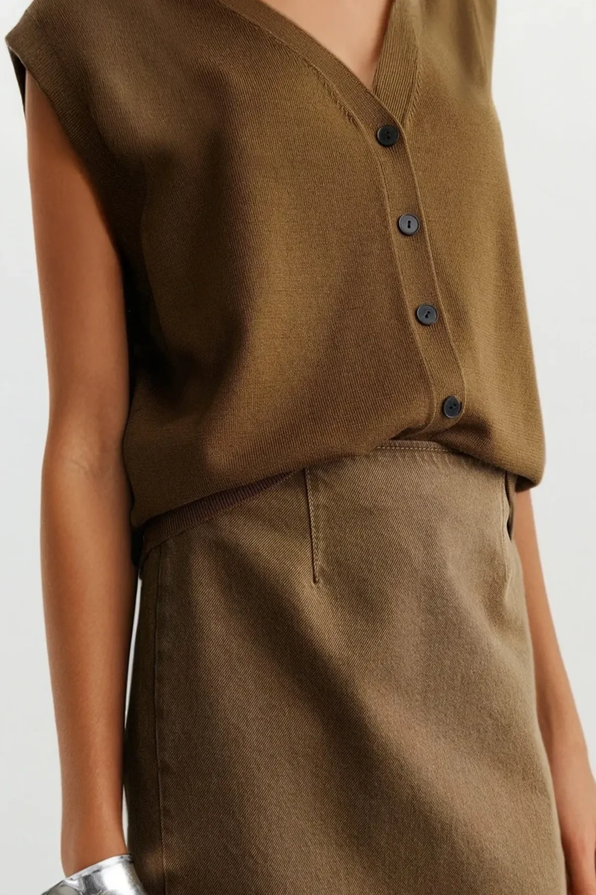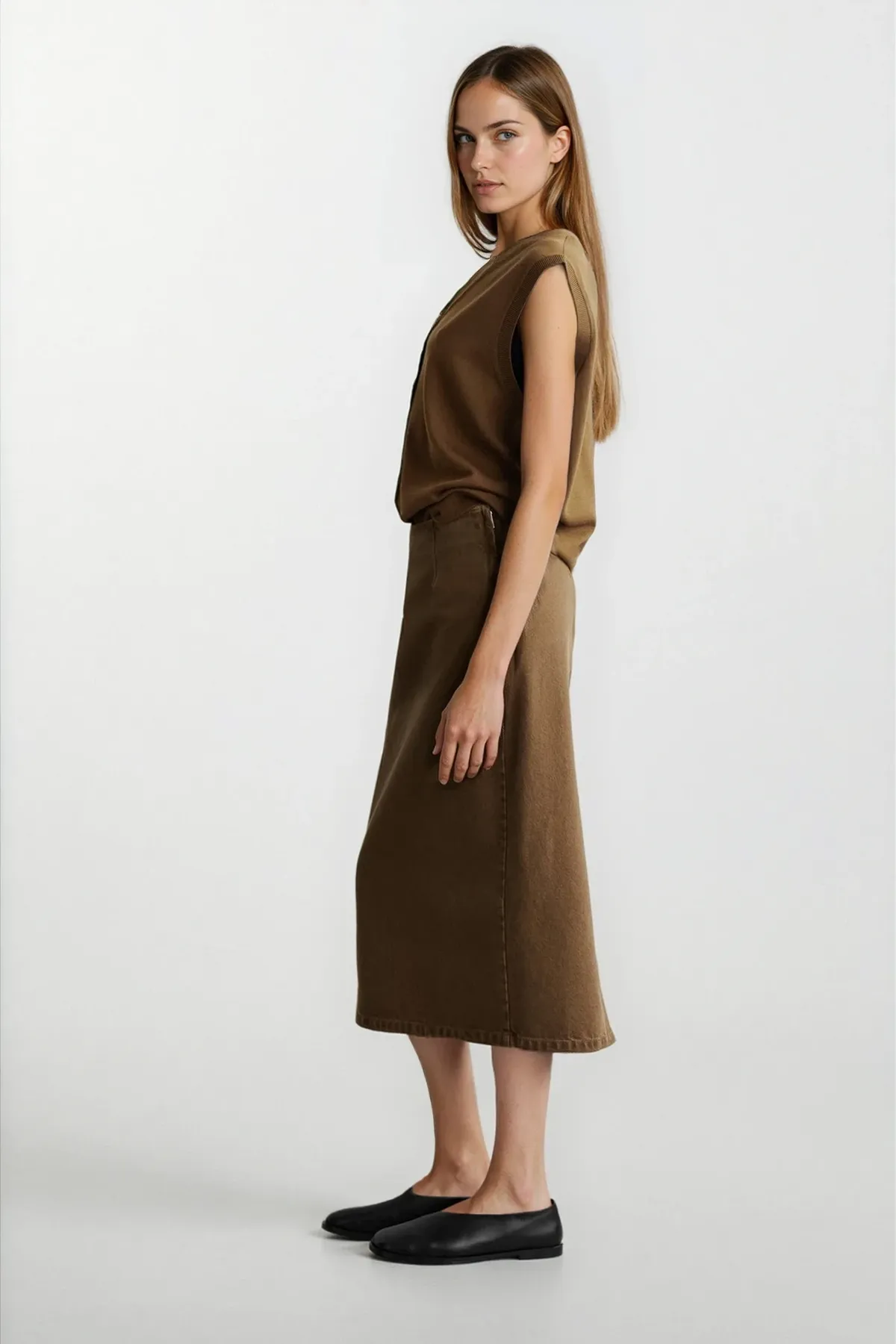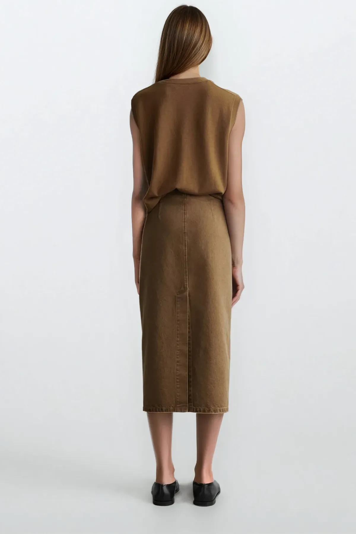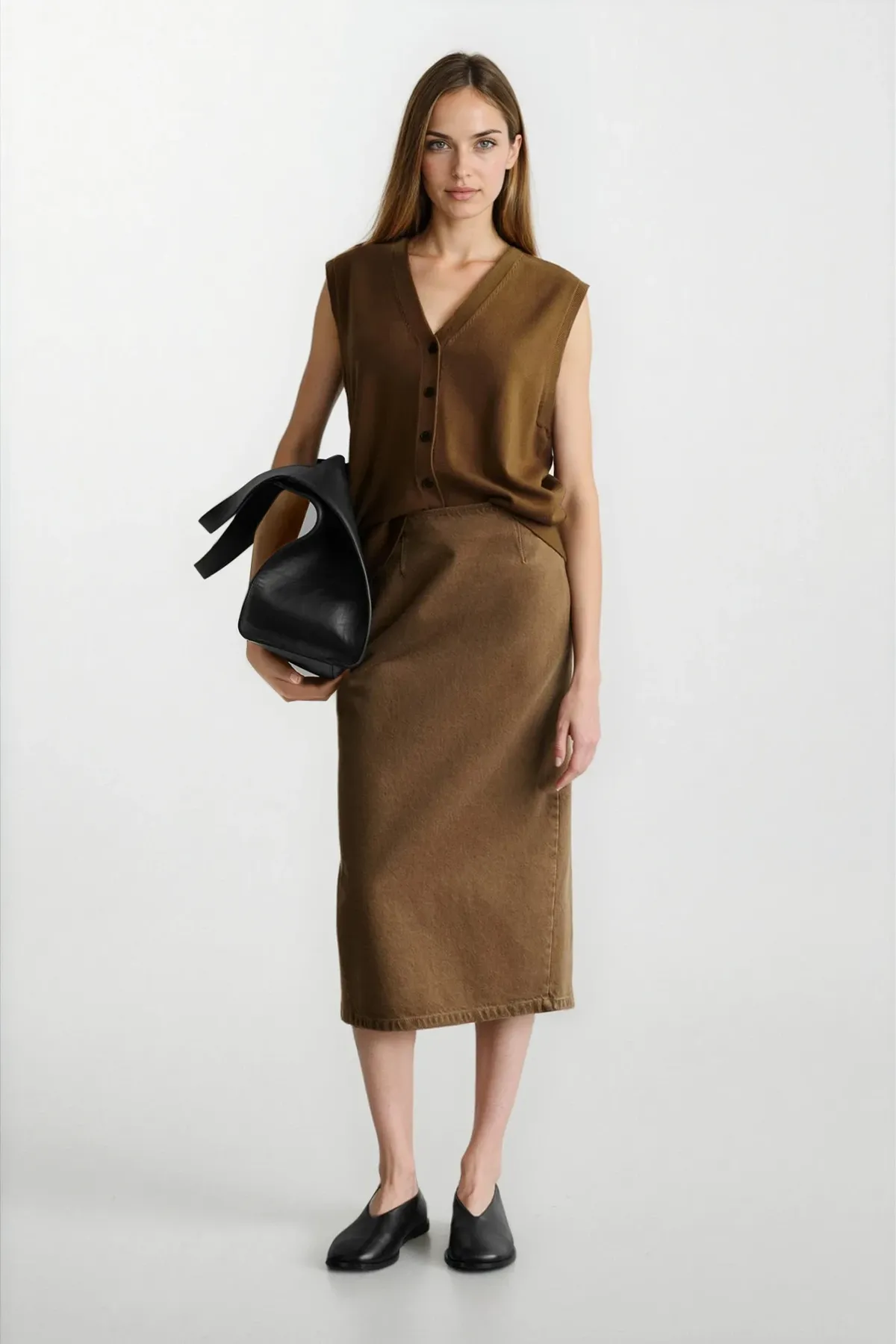 Модель джинсовой юбки от COS в стиле 2000-х - актуальный тренд 2025 года и новое "прочтение" денима. Юбка-миди прямого кроя в сложном коричневом оттенке изготовлена из органического и переработанного хлопка, с вытачками на талии и разрезом сзади