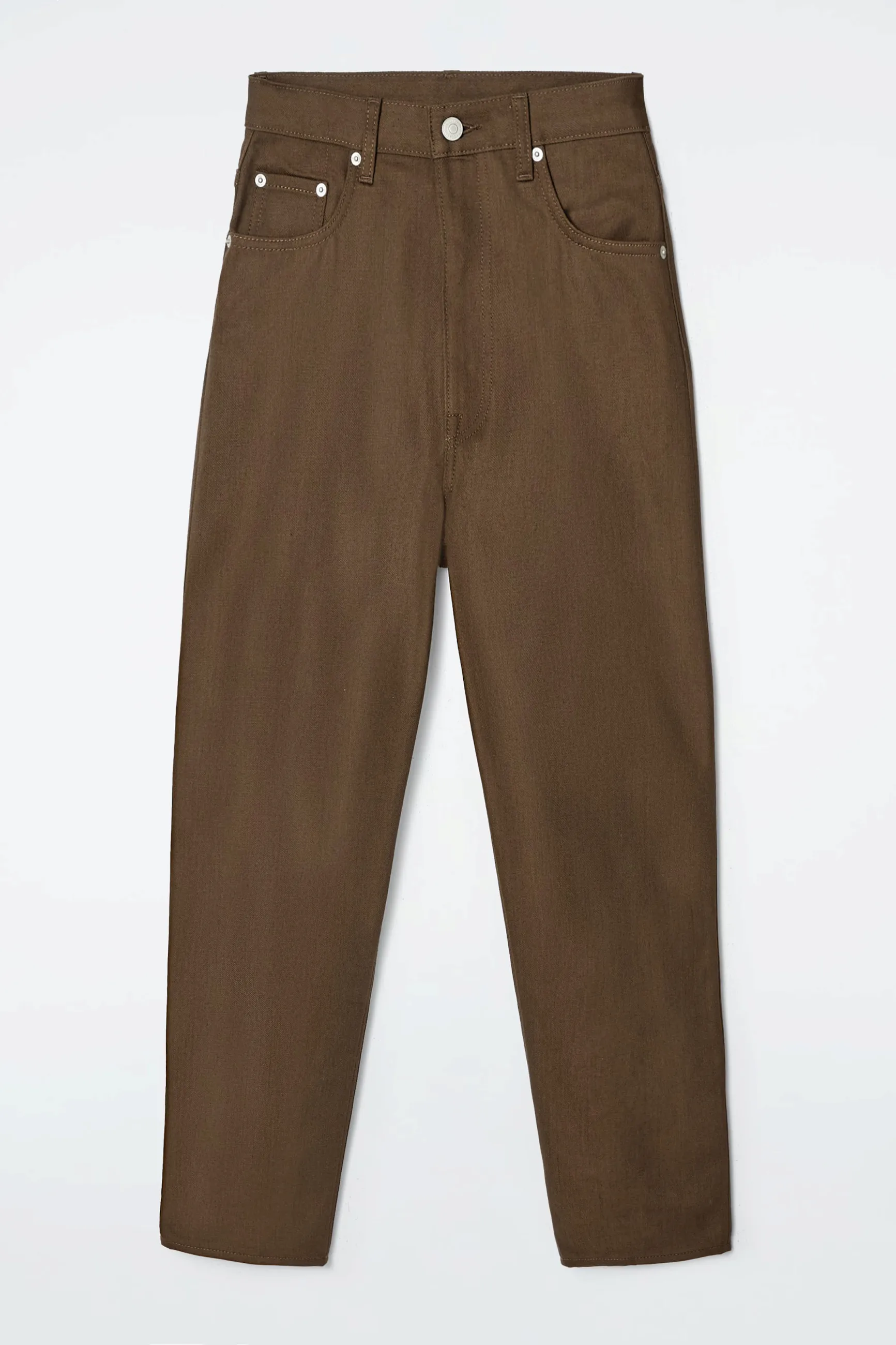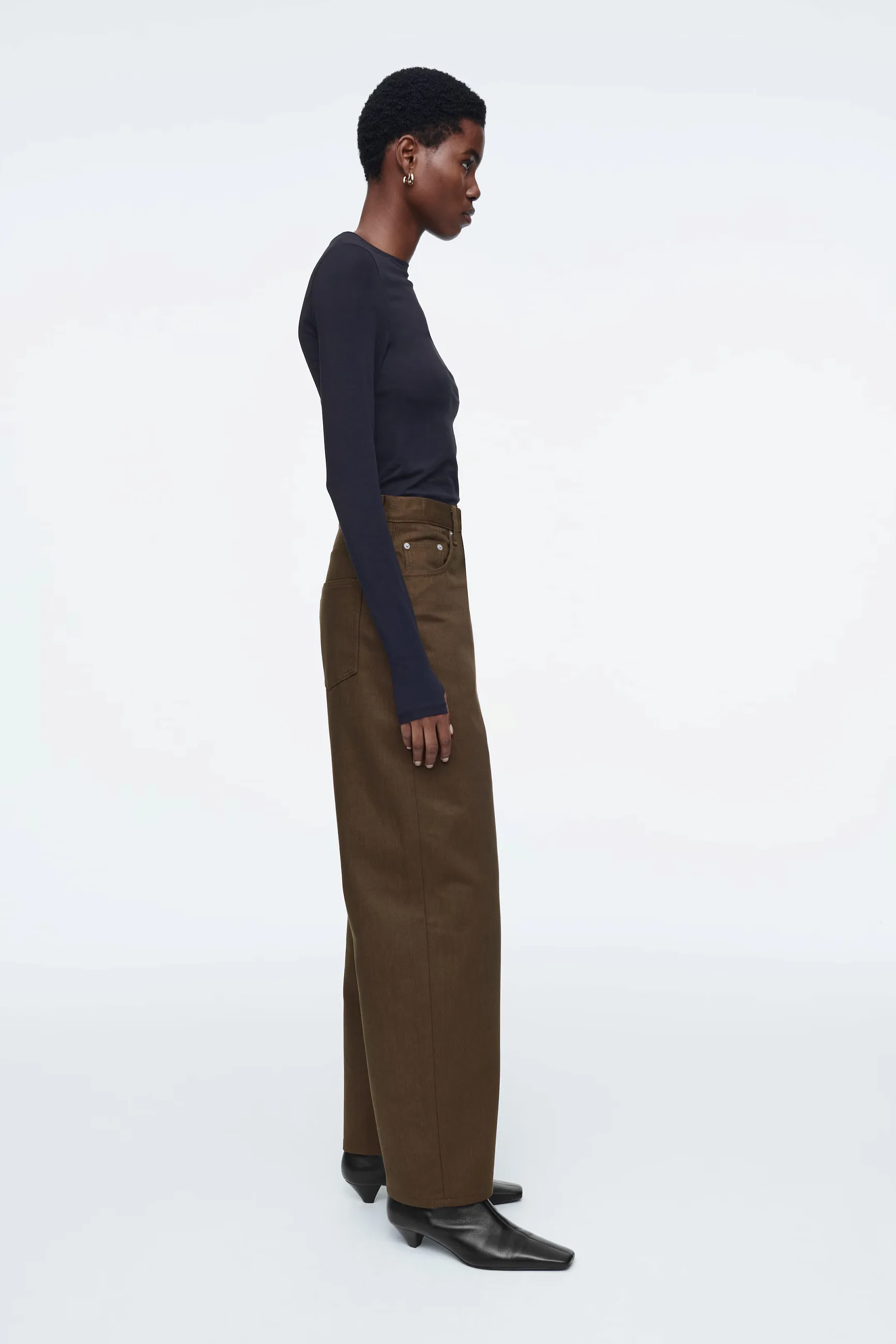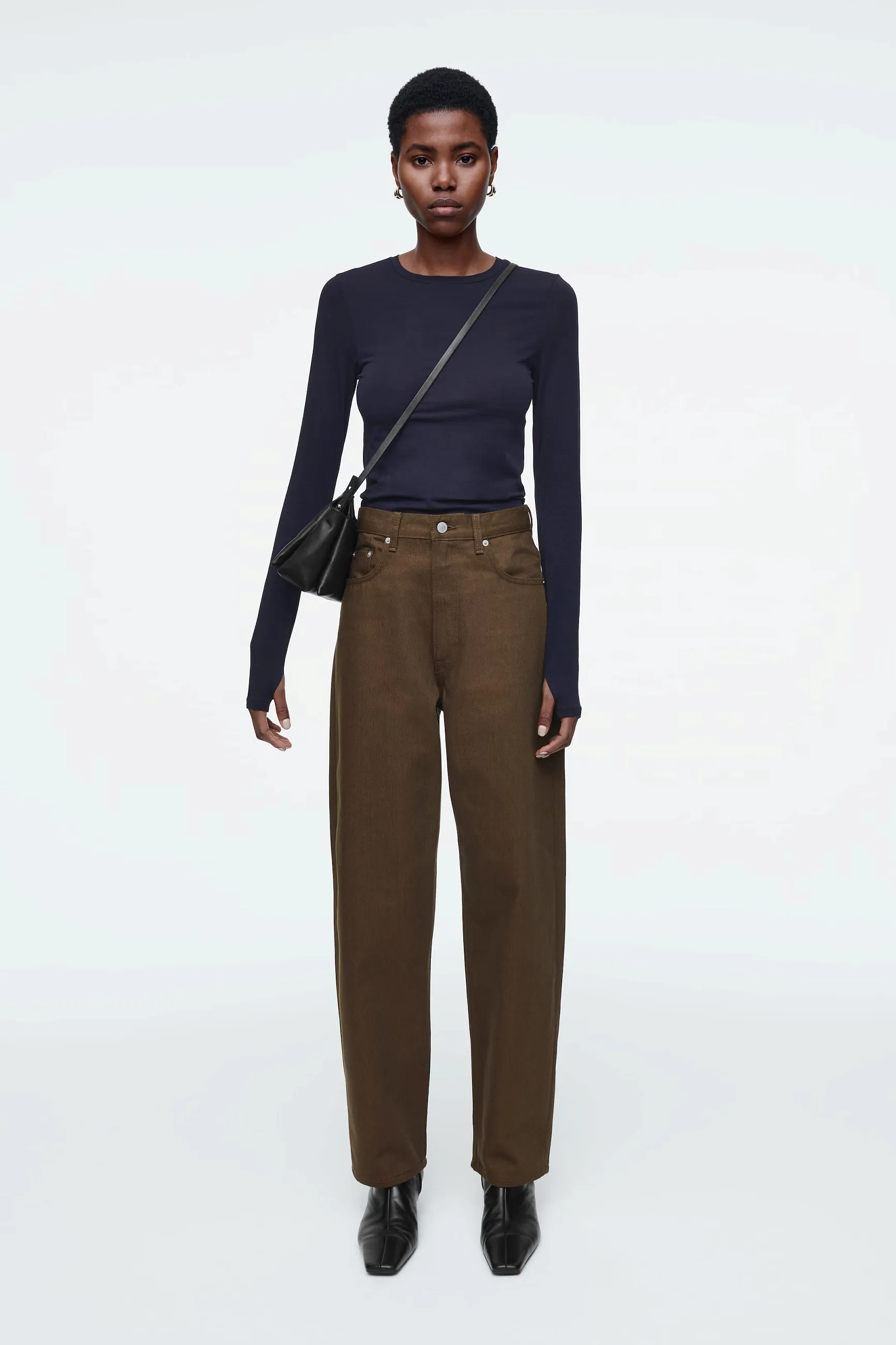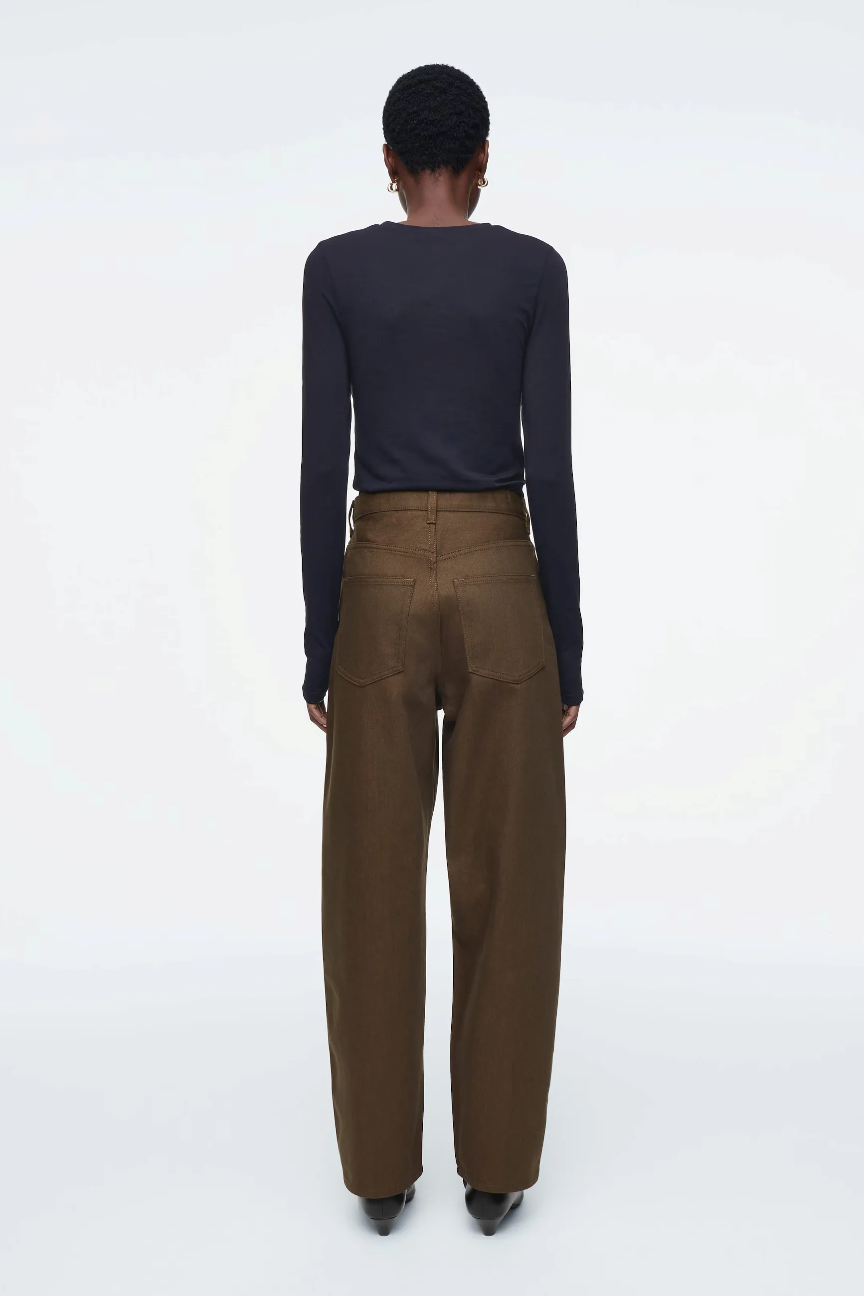 Джинсы Bay, получившие свое название из-за своей округлой формы, имеют бочкообразные штанины и изготовлены из денима насыщенного шоколадно-коричневого цвета.