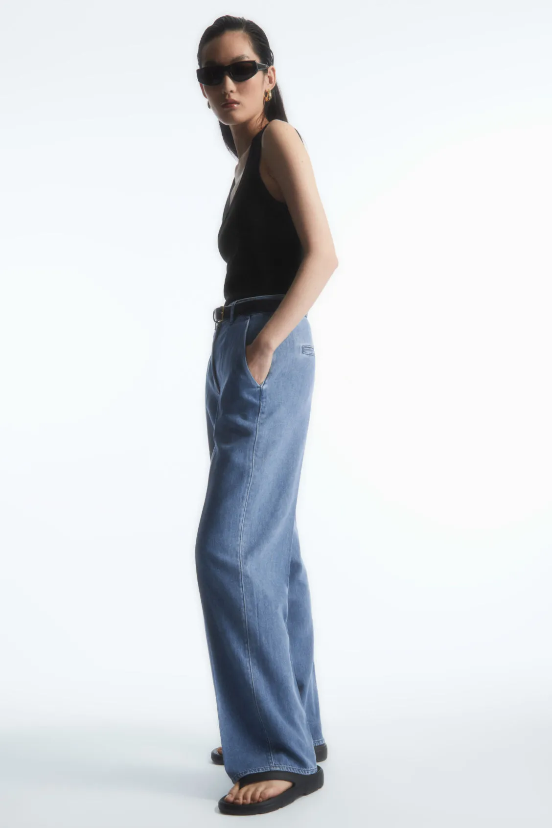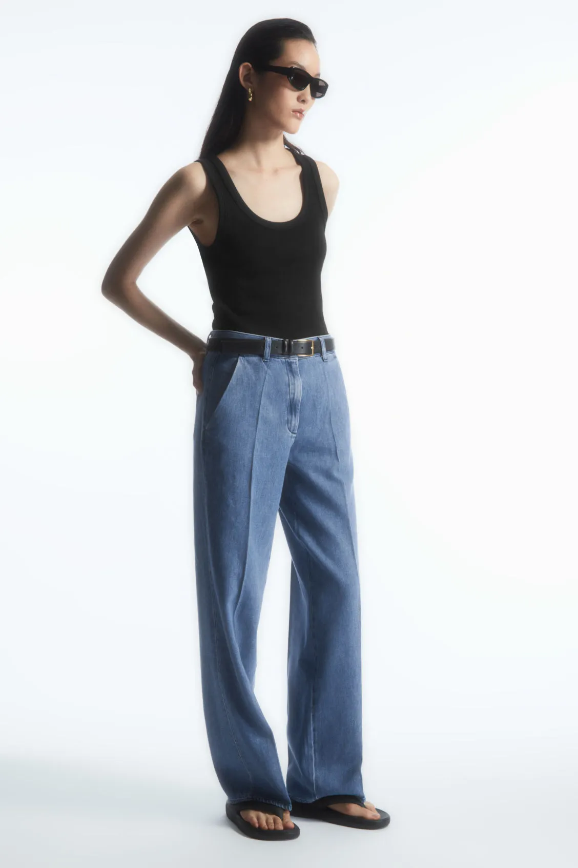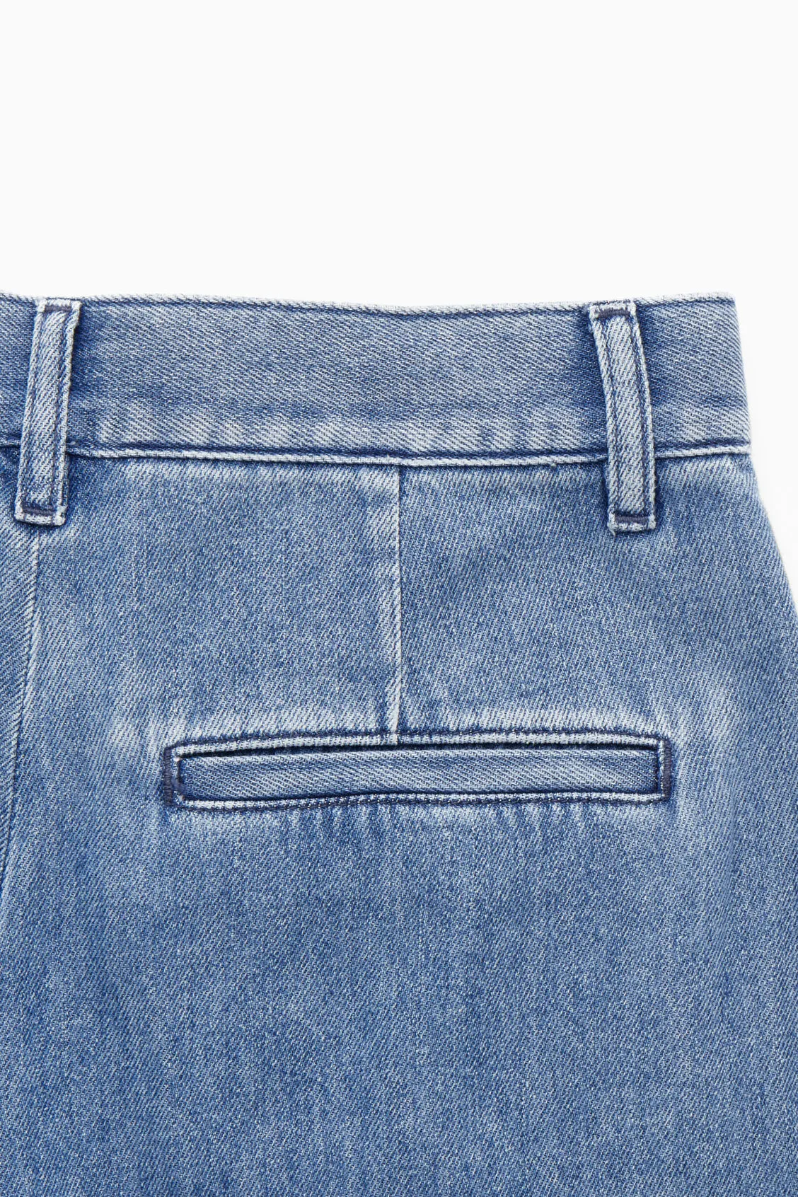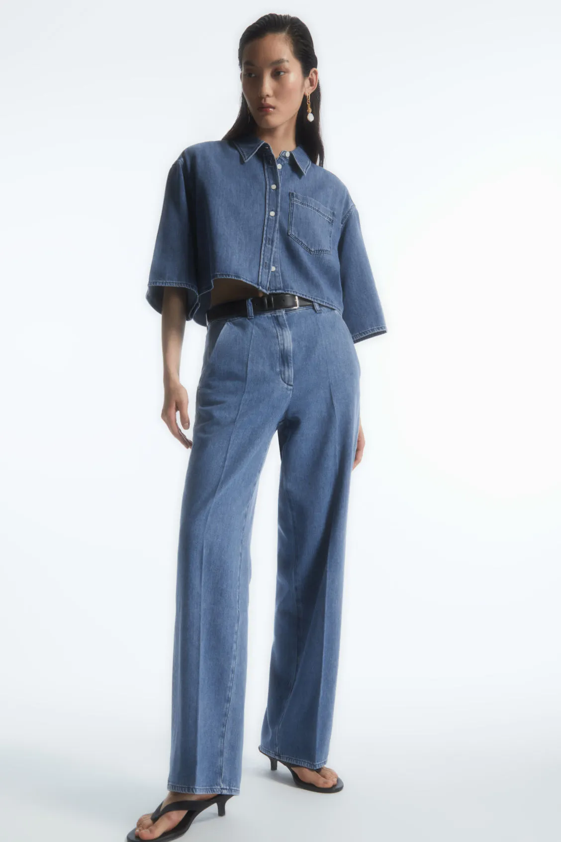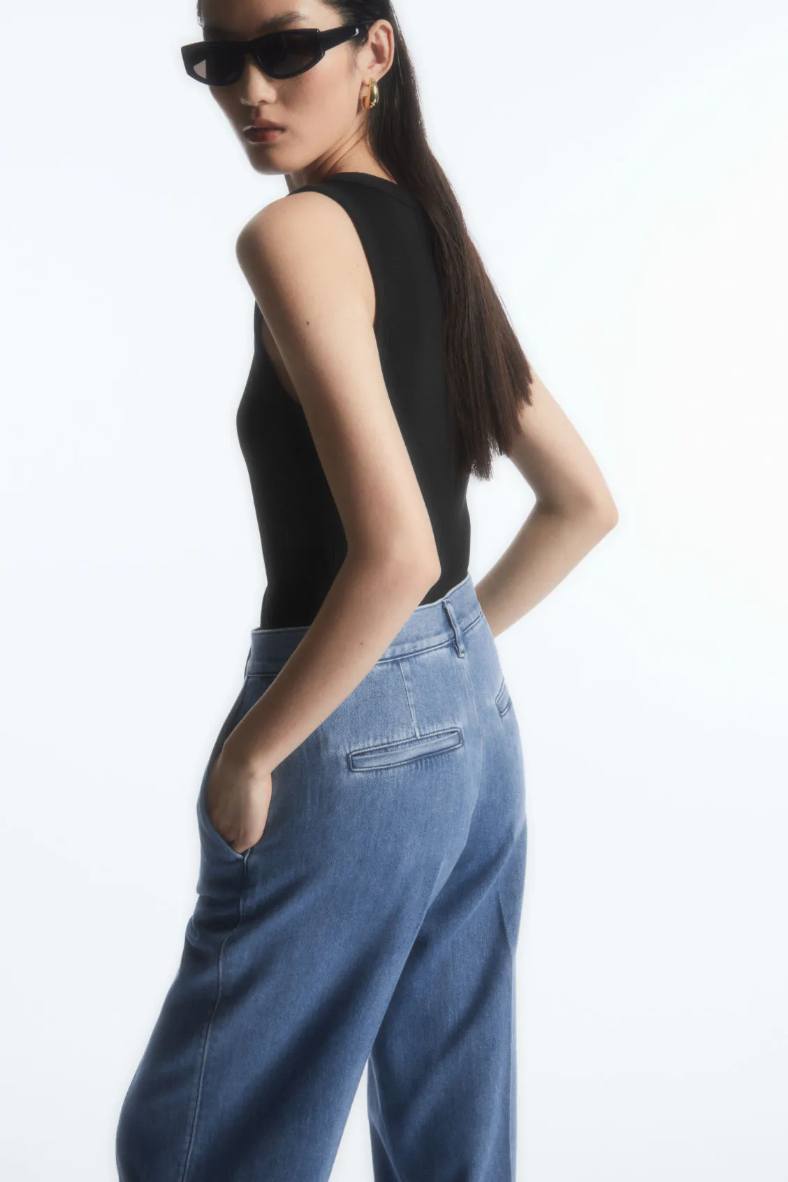 Эти прямые джинсы с высокой талией изготовлены из смесового органического хлопка синего цвета. Они имеют острые складки и длинный край, элегантно облегающий обувь.
