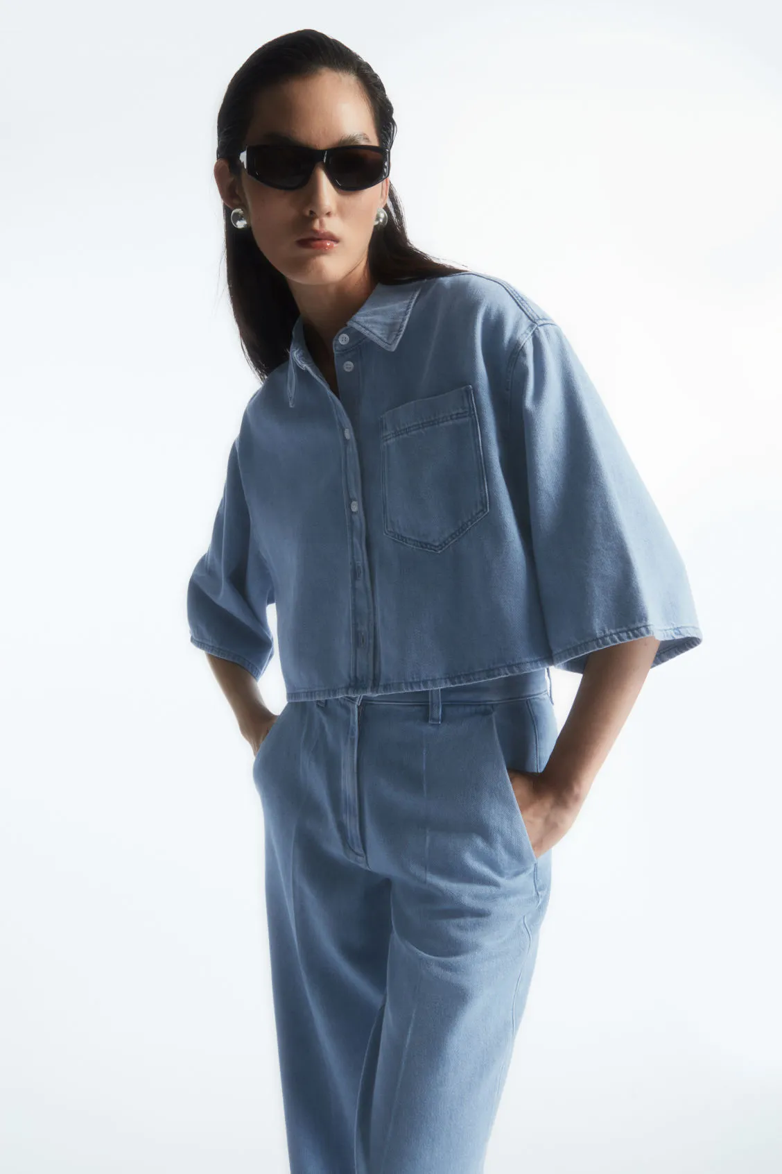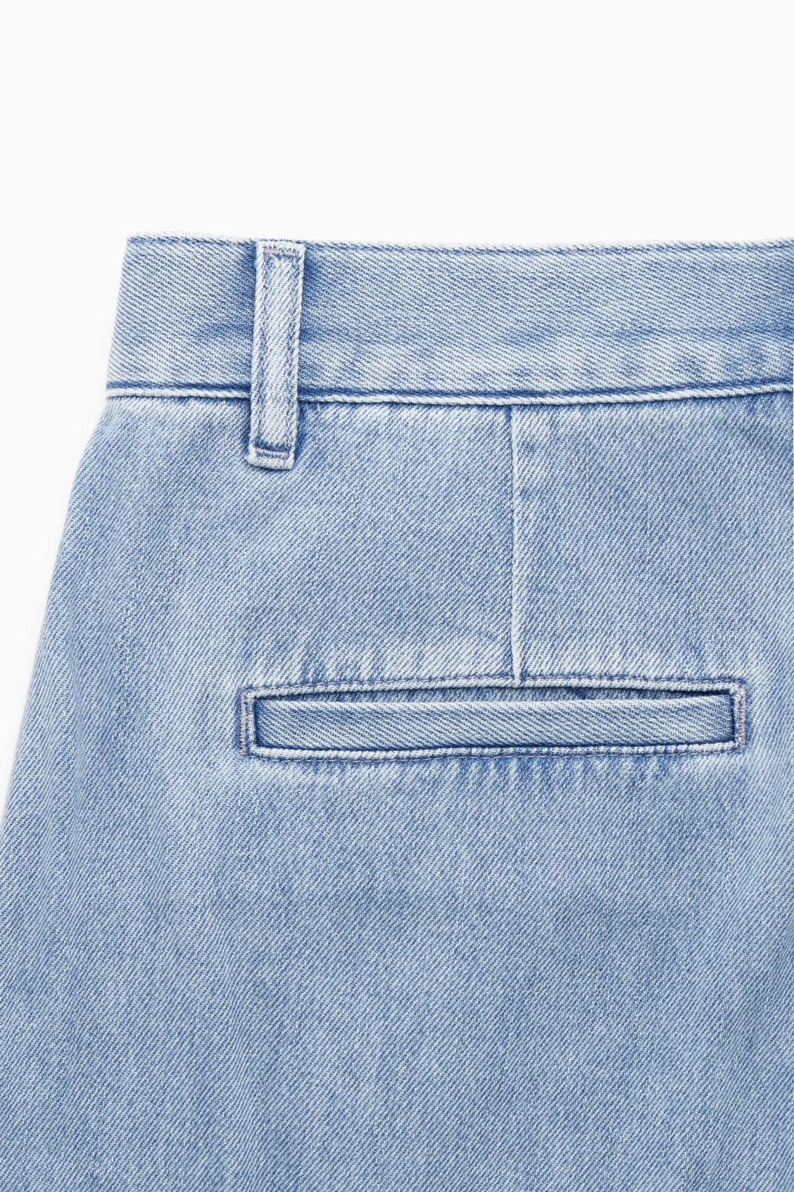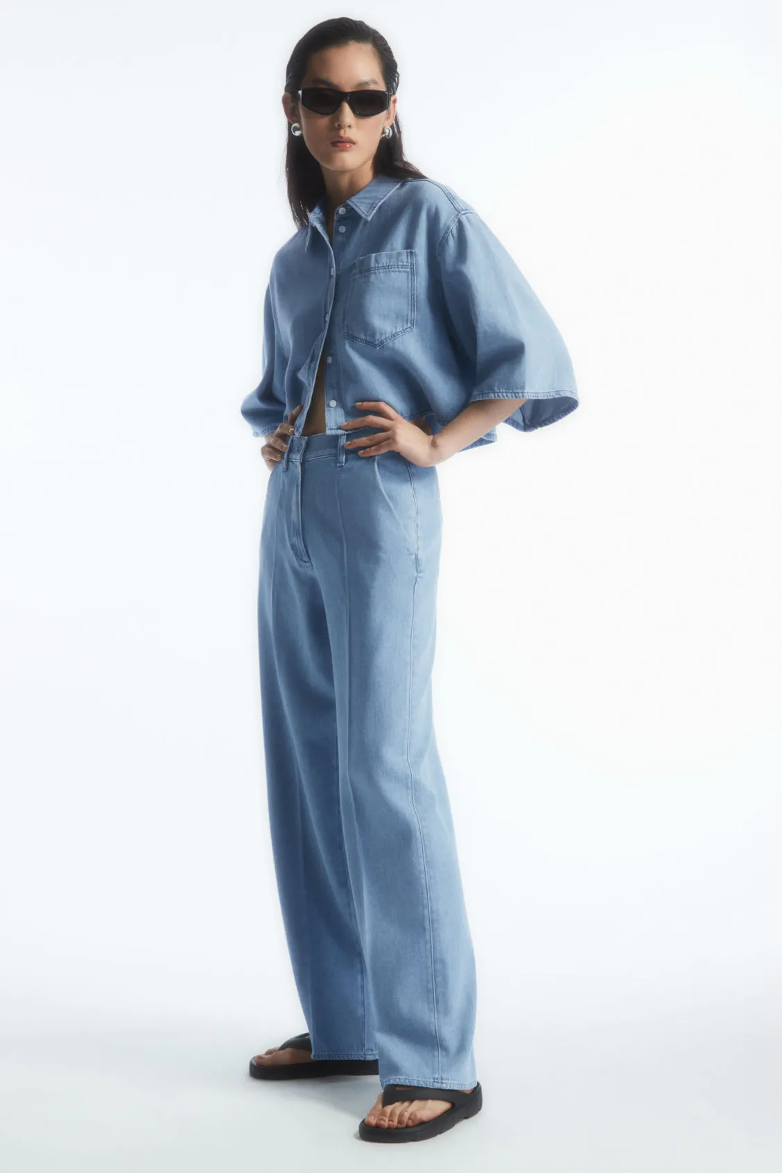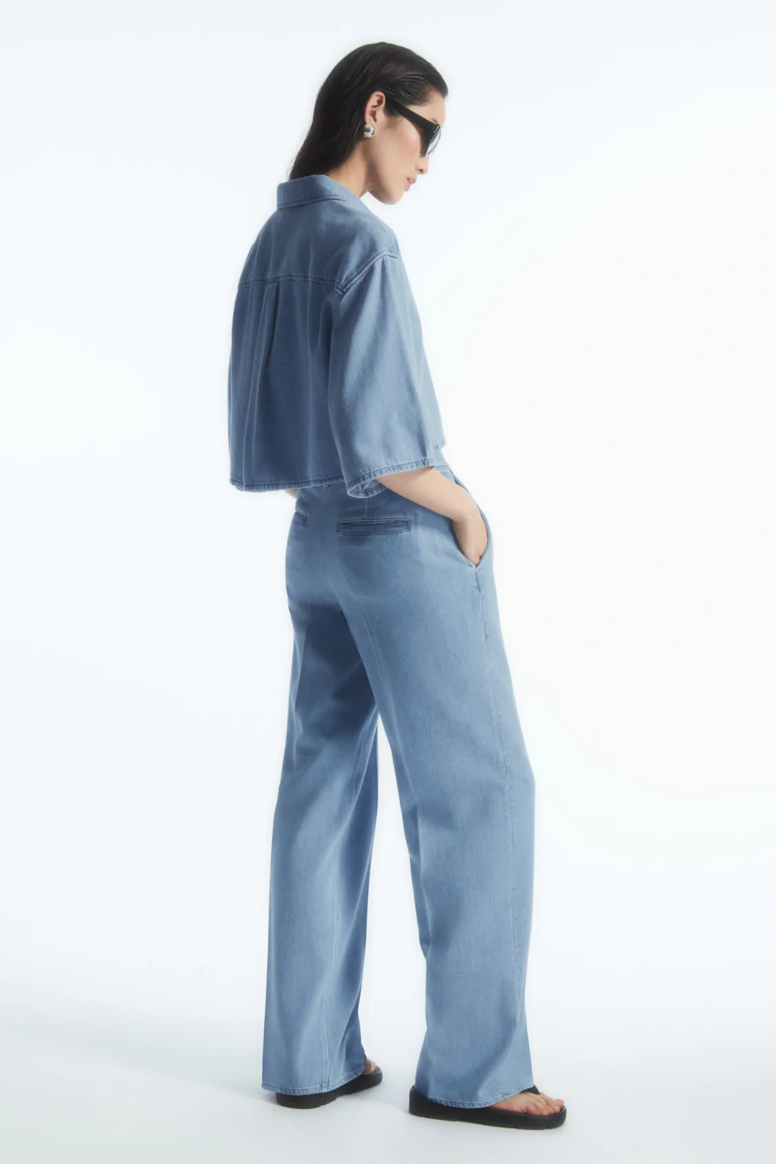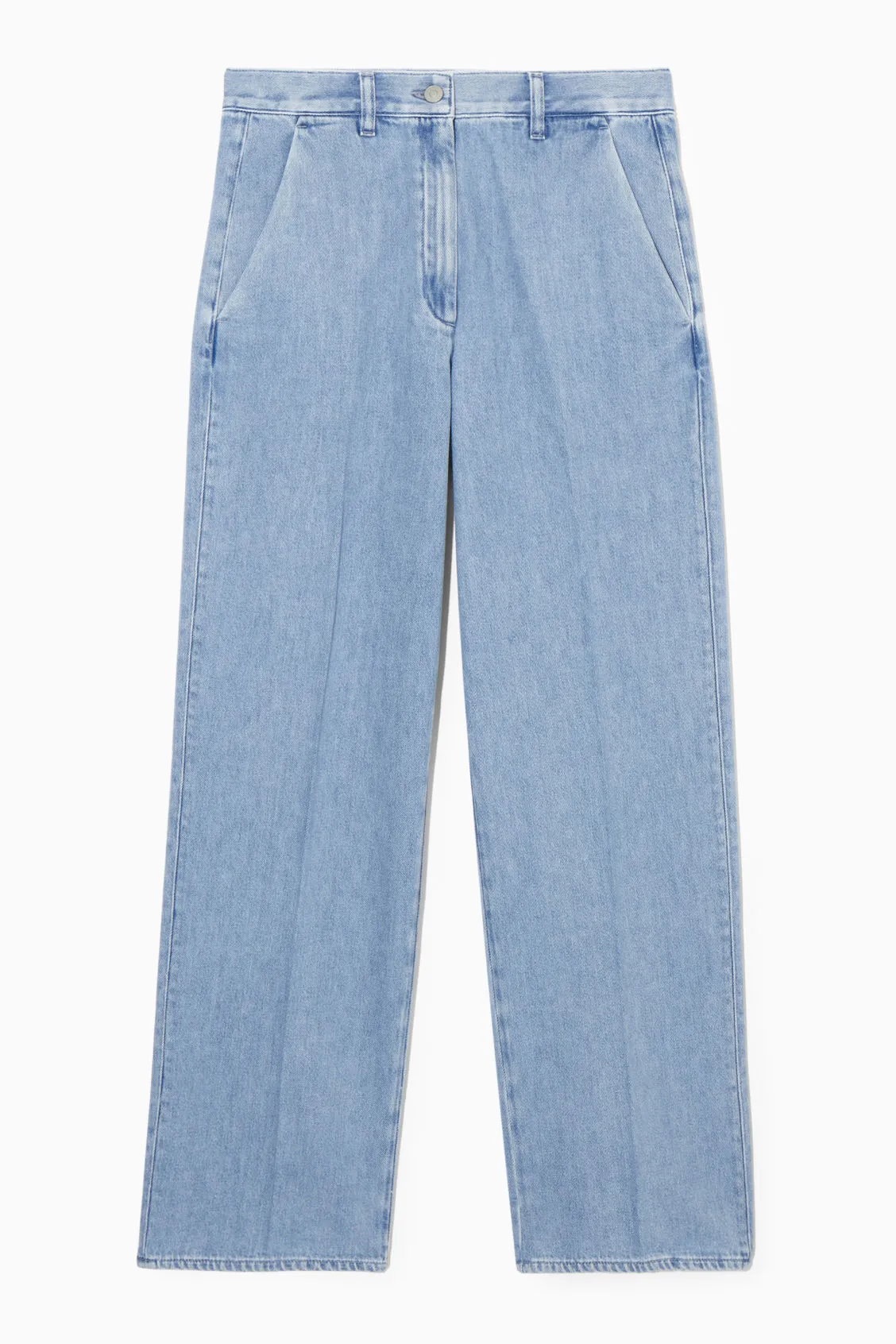 Эти прямые джинсы с высокой талией изготовлены из смеси органического хлопка и лиоцелла TENCEL™ голубого цвета. Они имеют четкие складки и длинный край, который элегантно ниспадает на вашу обувь. Примечание к стилю: подчеркните высокую талию, надев его с подходящей короткой рубашкой.
