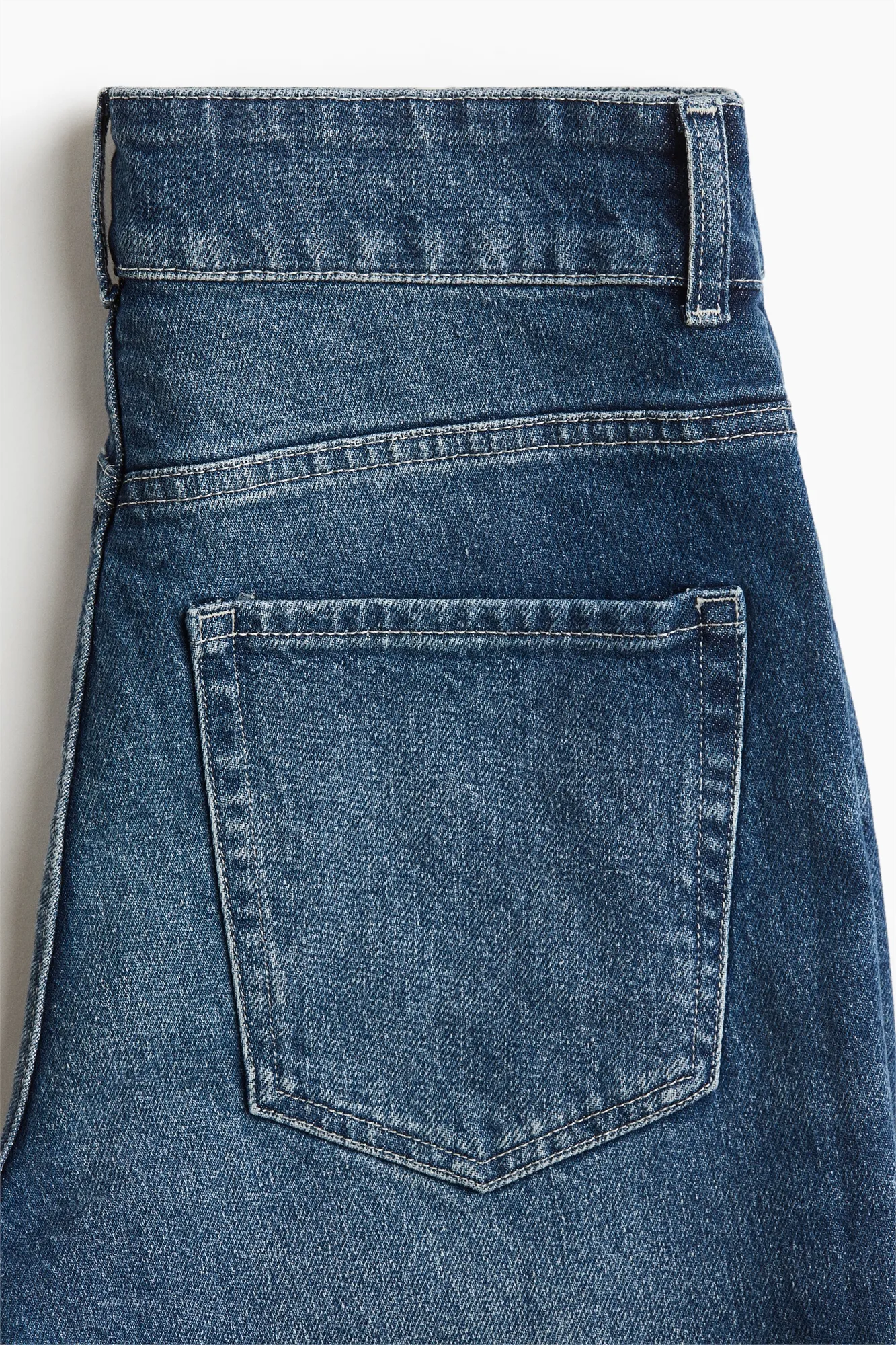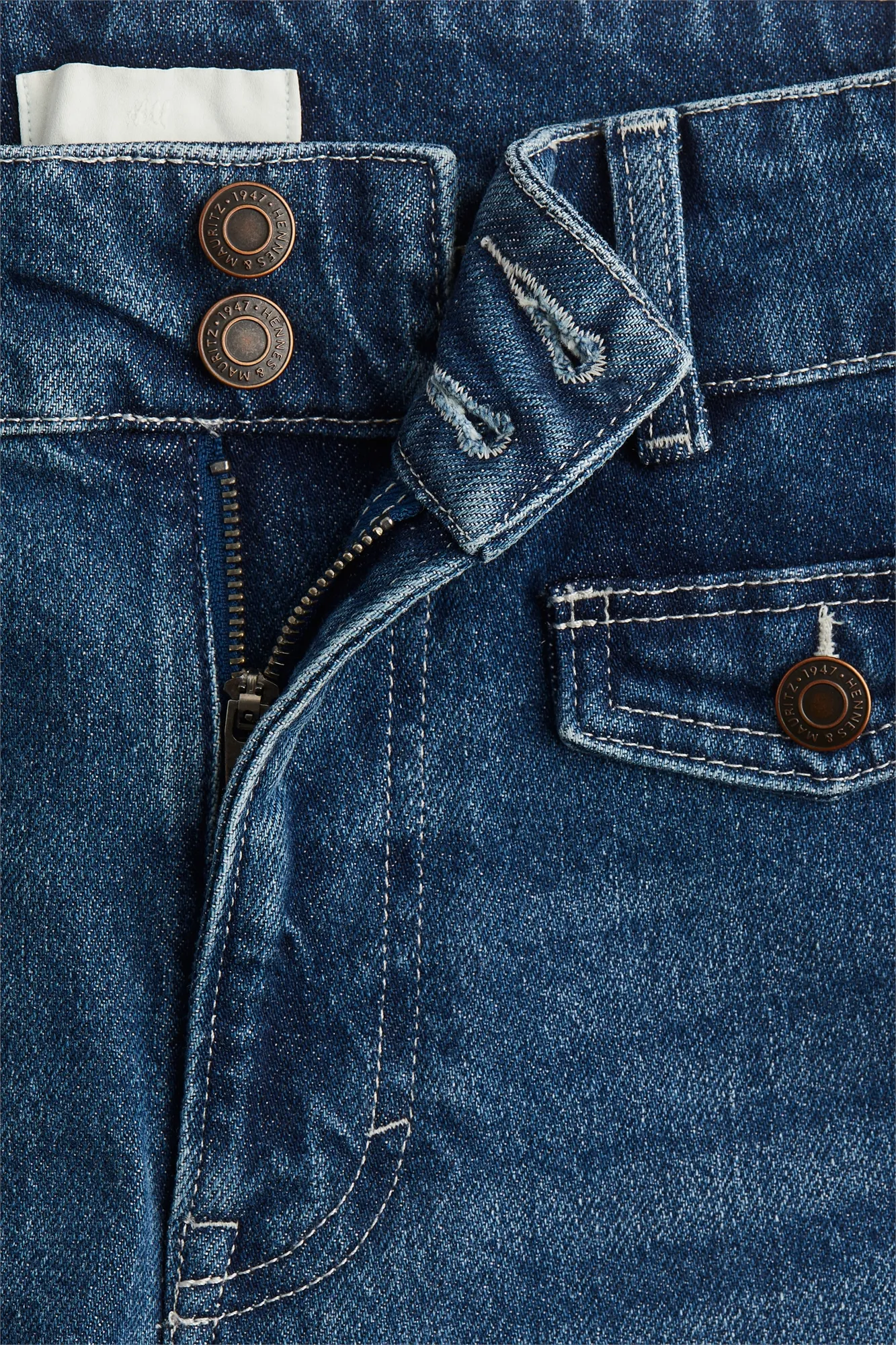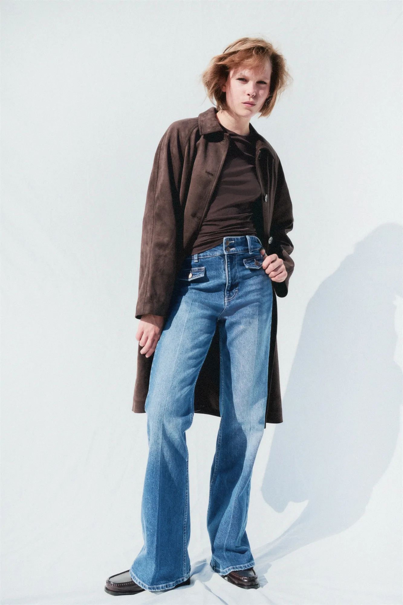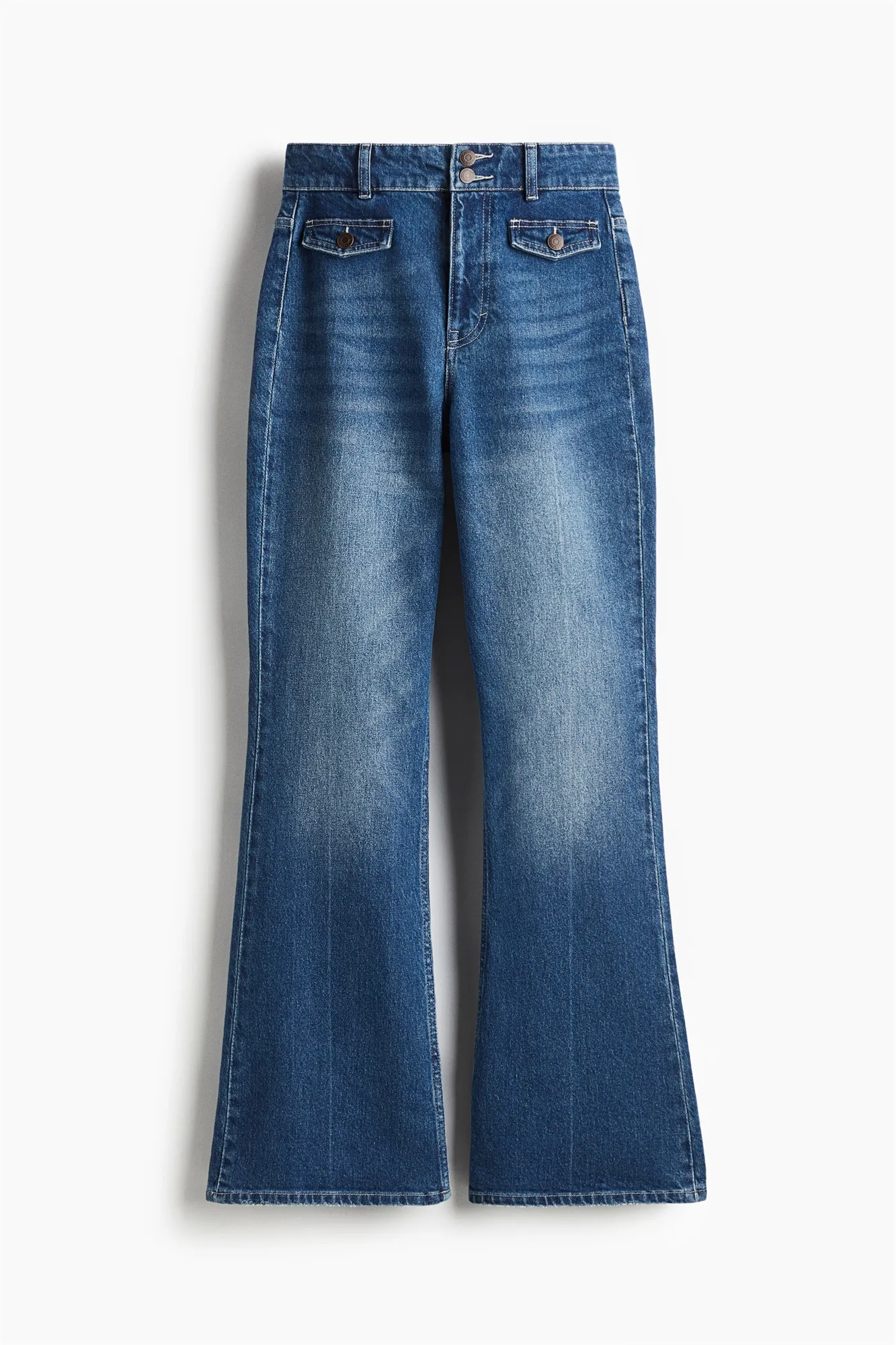 Джинсы из хлопкового денима с легкой эластичностью для большего комфорта. Расклешенные штанины облегают талию до бедра. Расклешенный крой от колена до подола. Высокая талия с застежкой на молнию и пуговицы. Декоративные клапаны карманов на пуговице спереди и накладные карманы сзади. Удлиненная длина, закрывающая ногу, создаёт эффект объёма. Сочетаются с любой одеждой: от укороченных топов до толстого трикотажа.