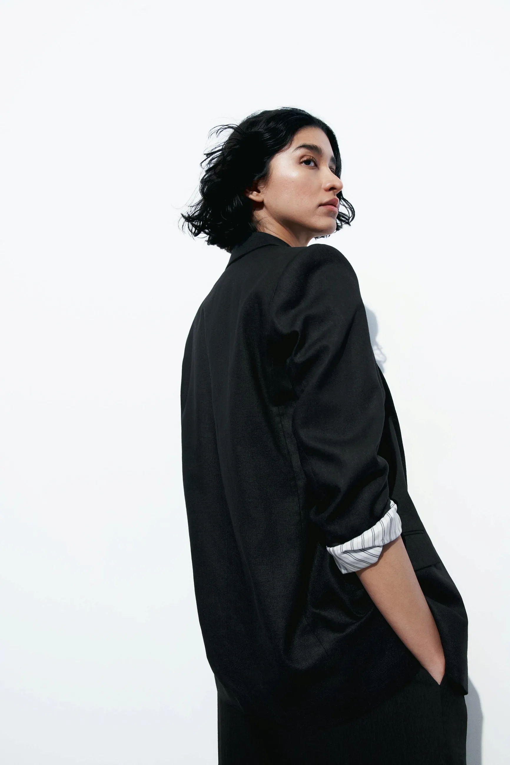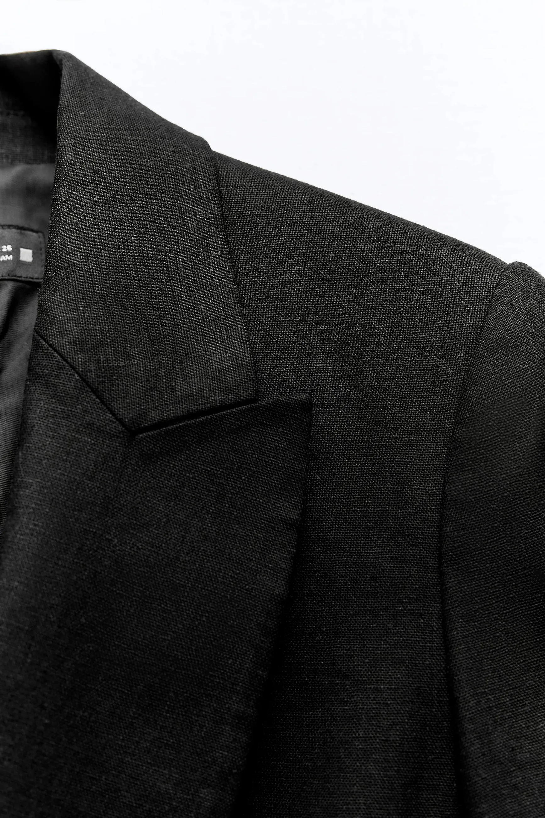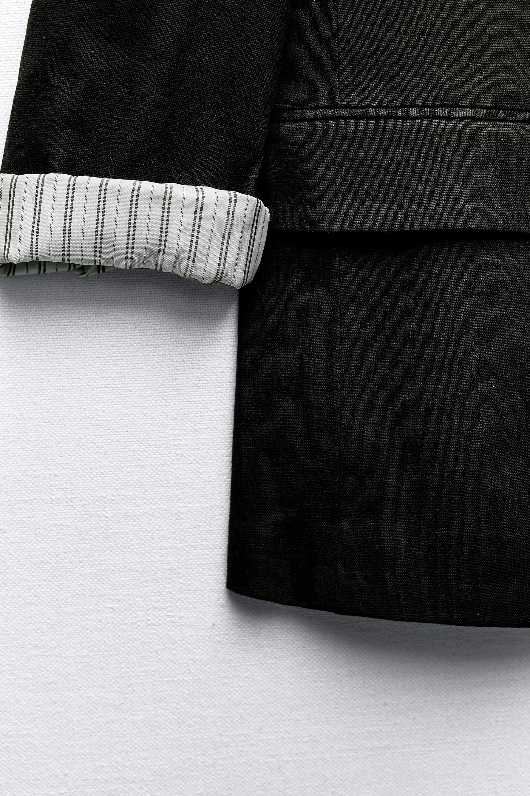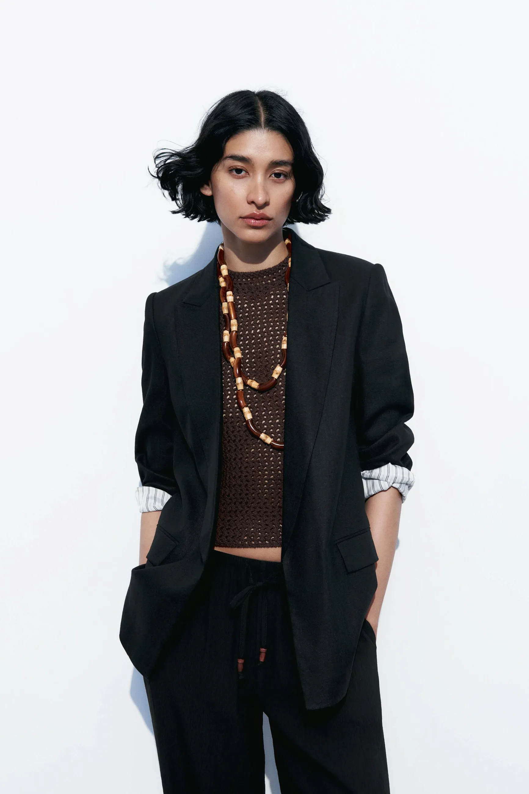 Пиджак из смесового льна без застежки. Воротник с лацканами, подворачиваемые рукава с хлястиками и пуговицами. Подплечники, передние карманы с клапанами.