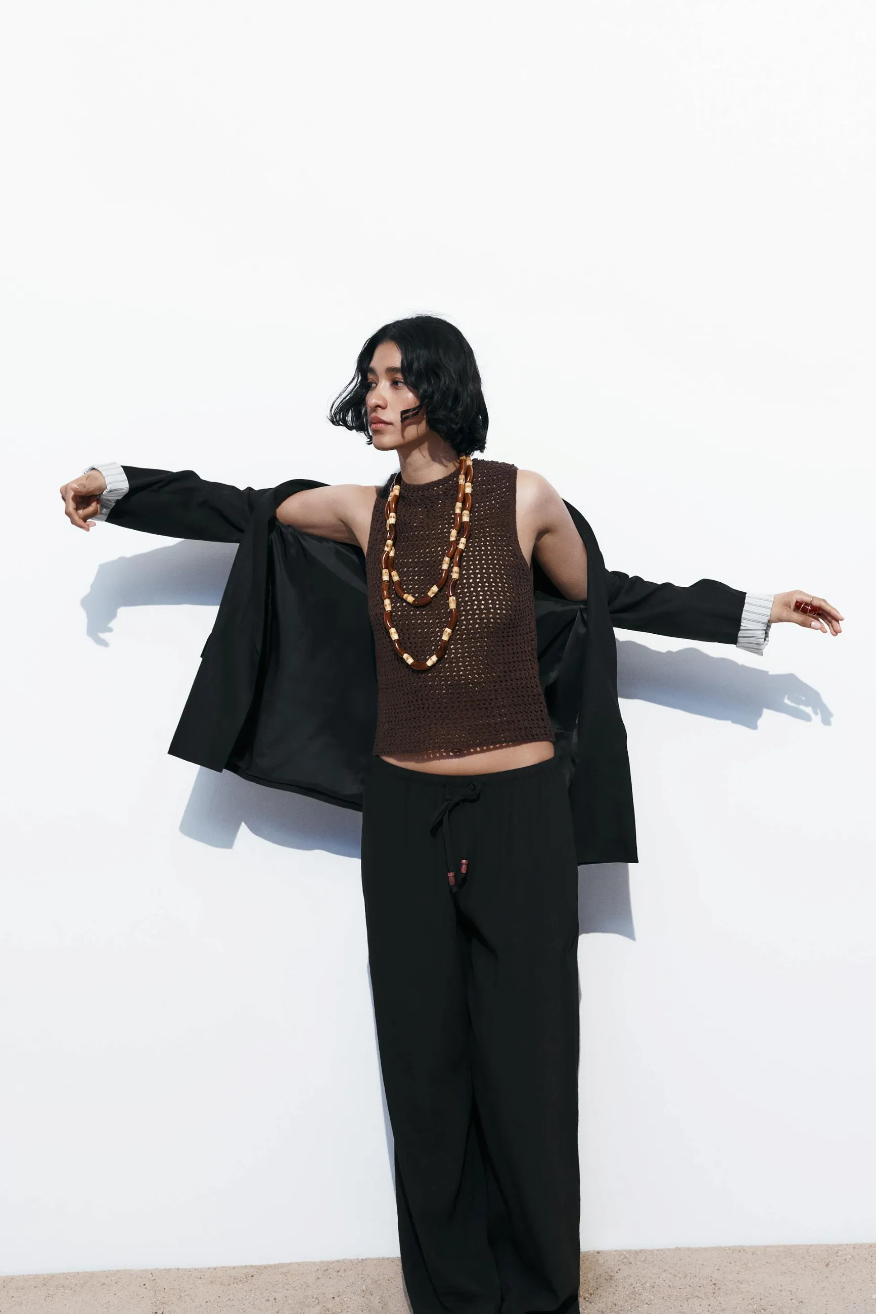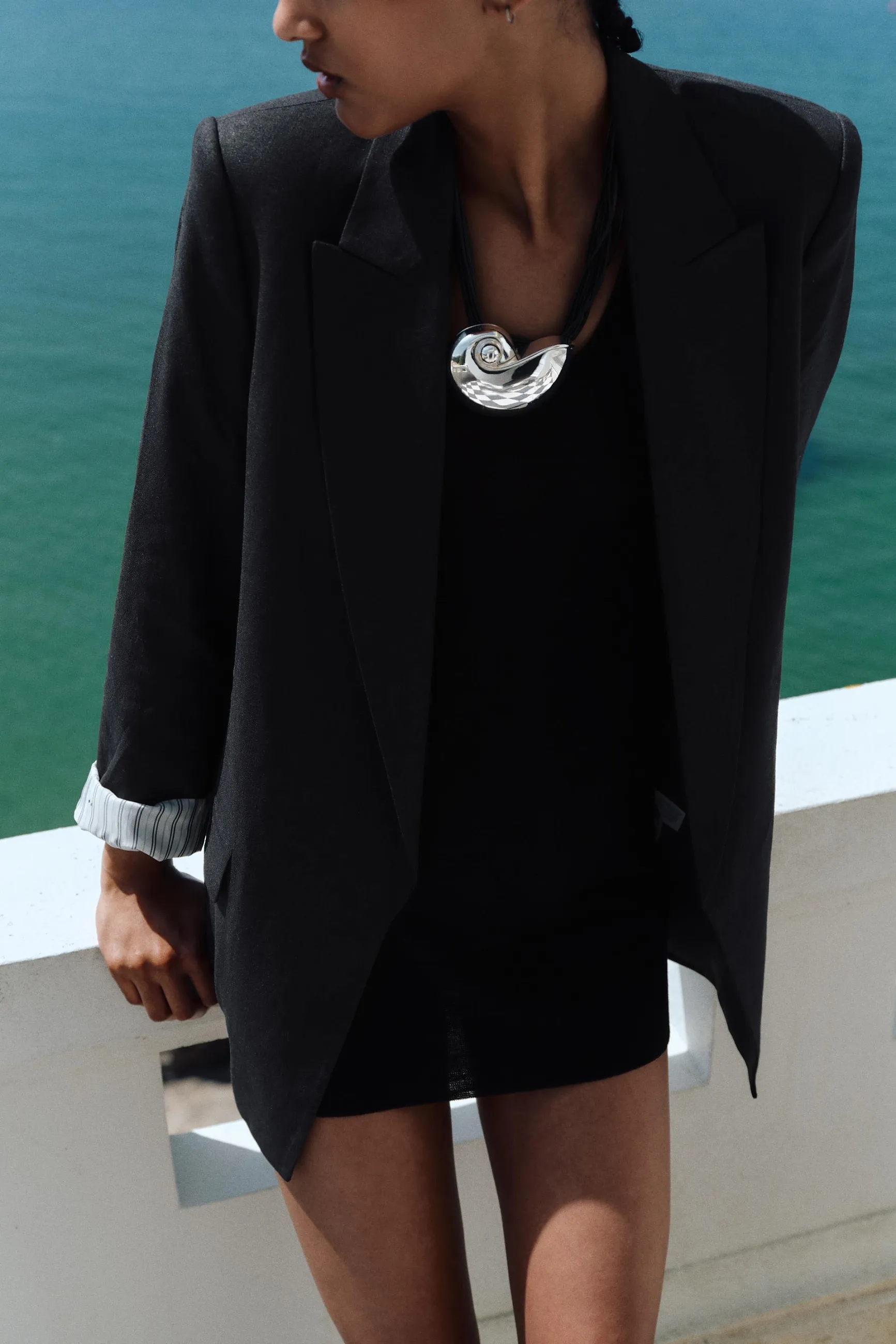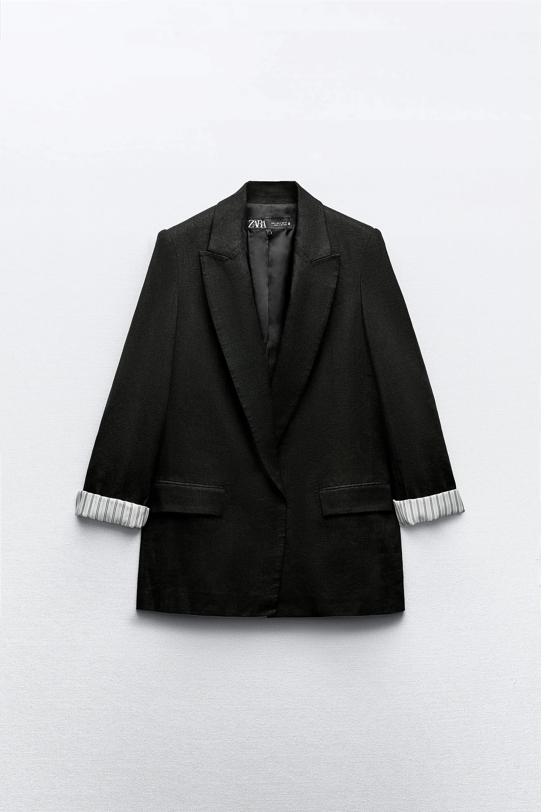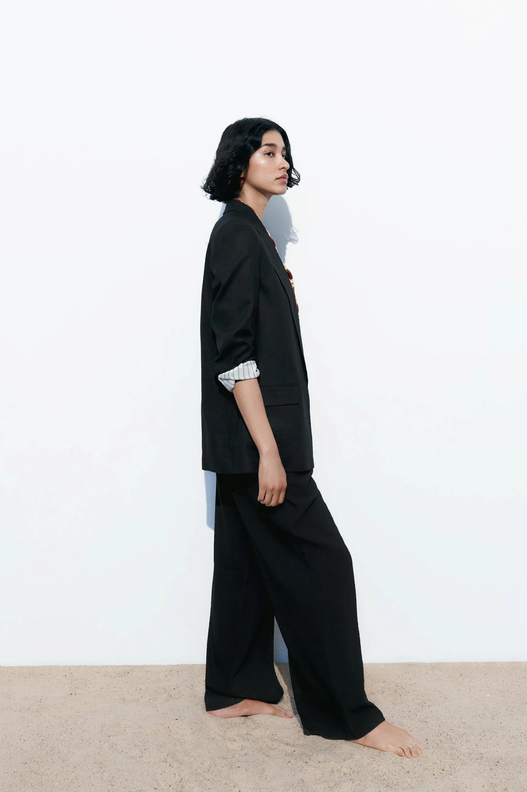 Пиджак из смесового льна без застежки. Воротник с лацканами, подворачиваемые рукава с хлястиками и пуговицами. Подплечники, передние карманы с клапанами.