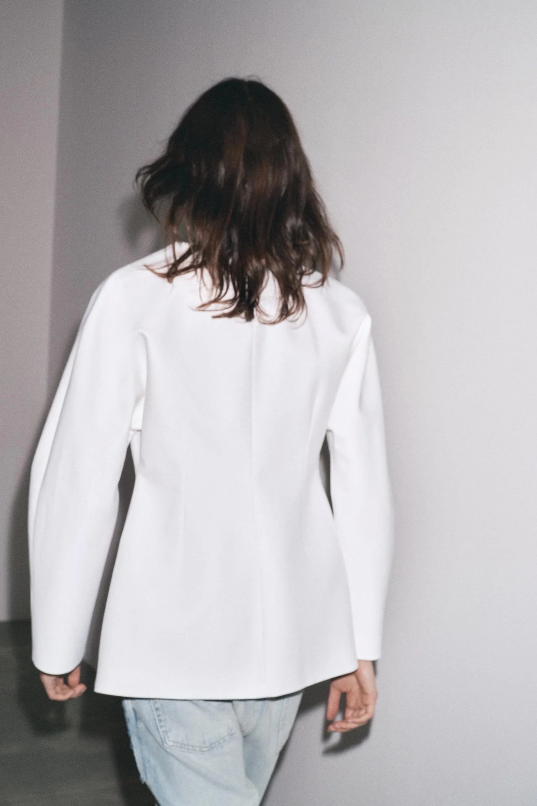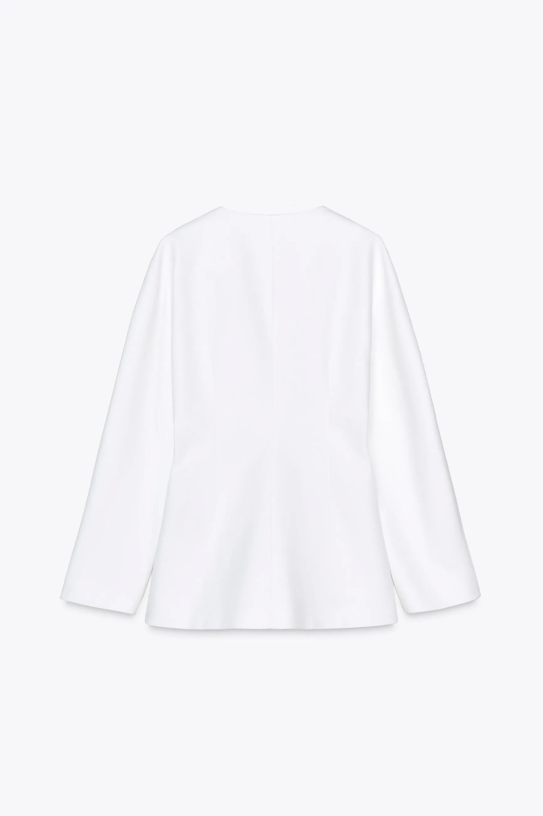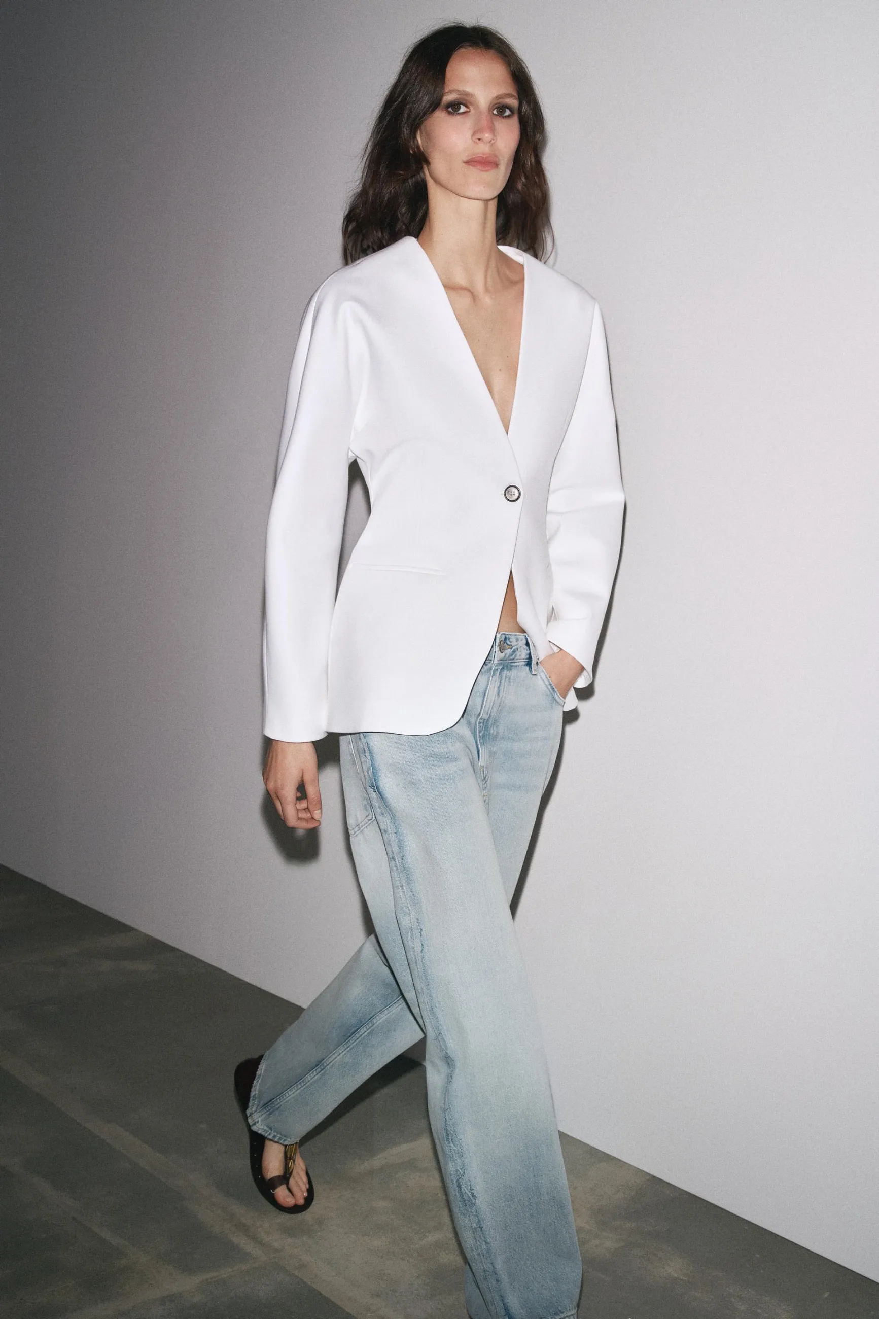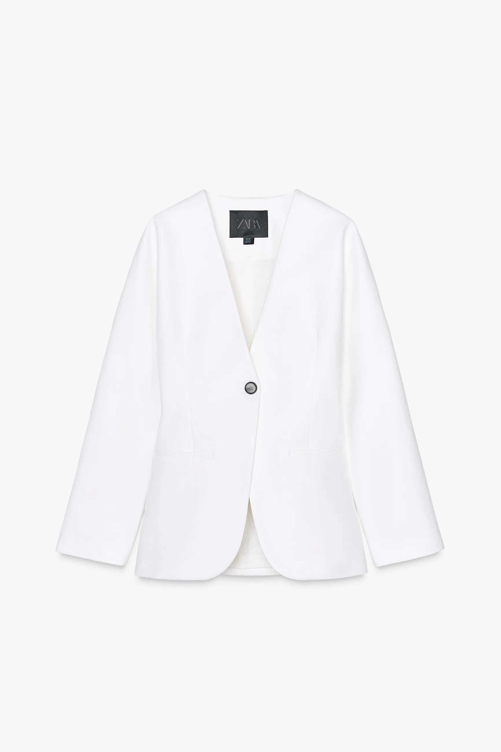 Пиджак из 100% льняной пряжи. V-образный вырез и длинный рукав. Прорезные карманы спереди. Подкладка контрастного цвета. Застежка на пуговицы спереди.