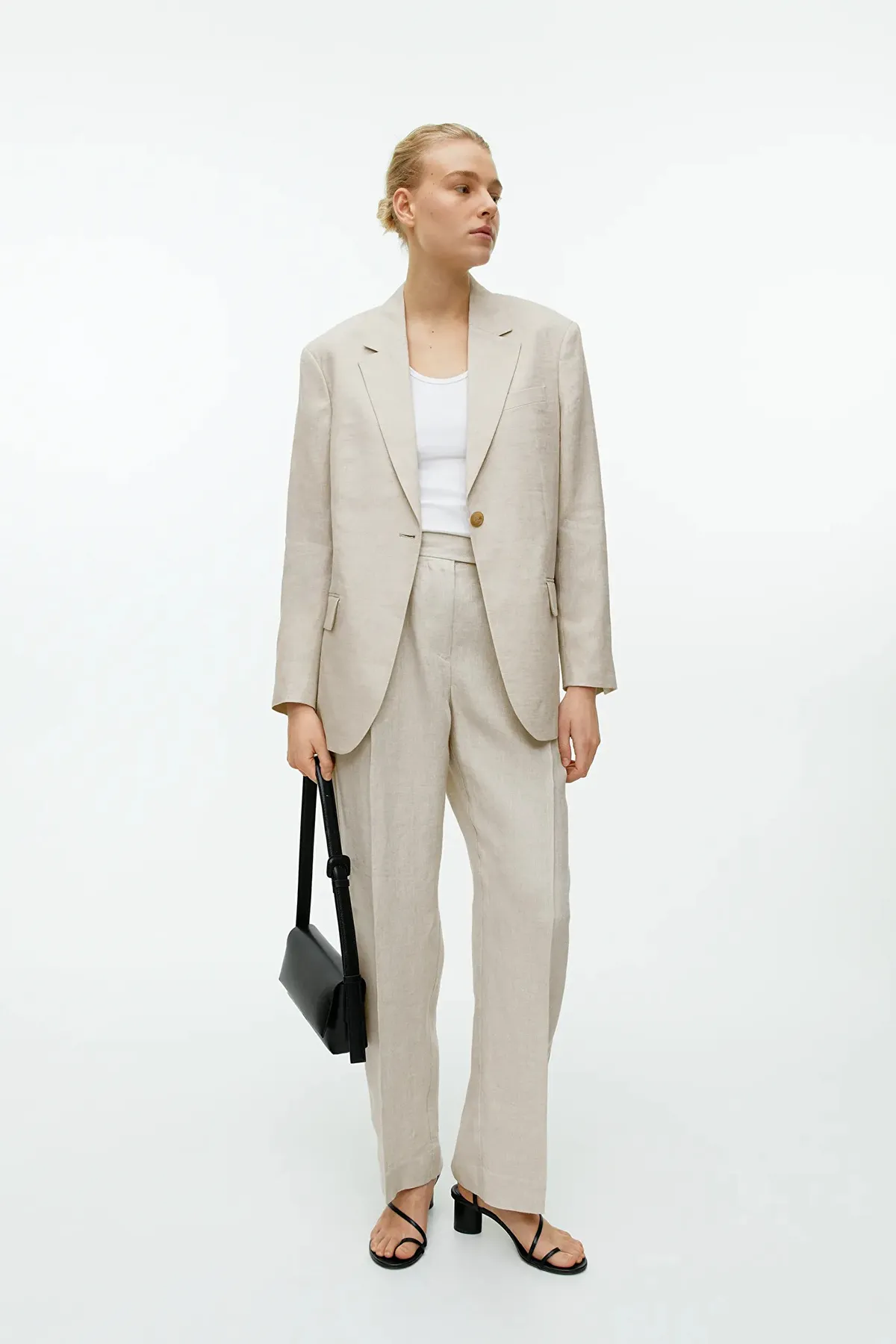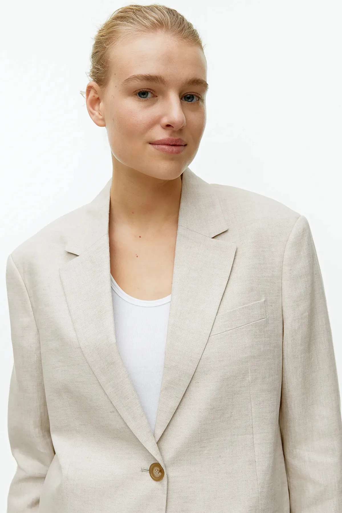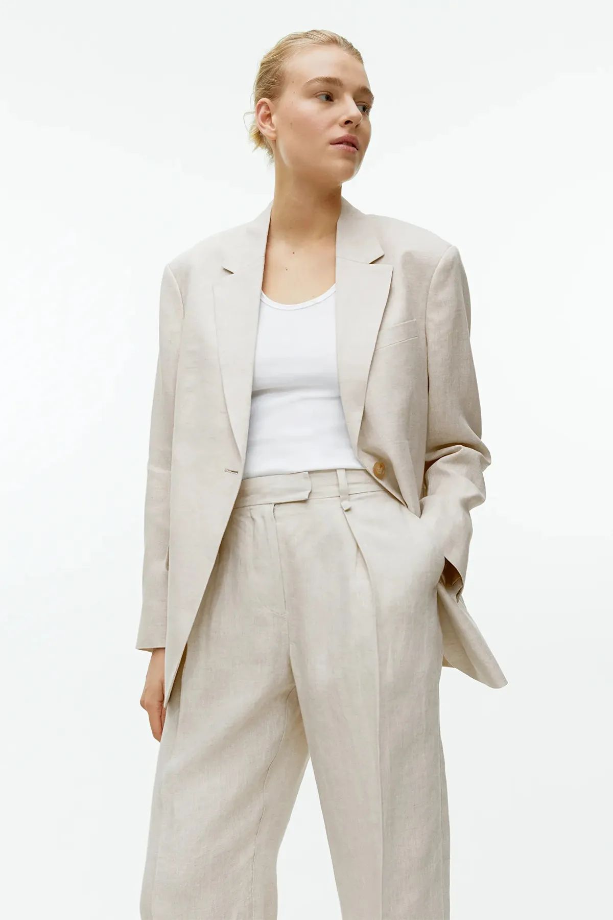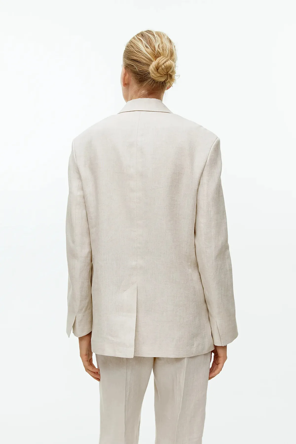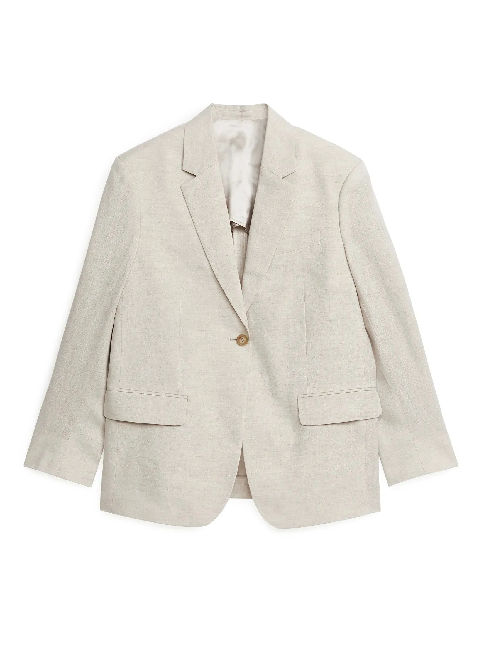 Пиджак oversize из чистого льна. Модель на одной пуговице с двойными прорезными карманами с клапанами спереди. Шлица сзади и на концах рукавов. Частично на подкладке. Носите его с подходящими брюками.