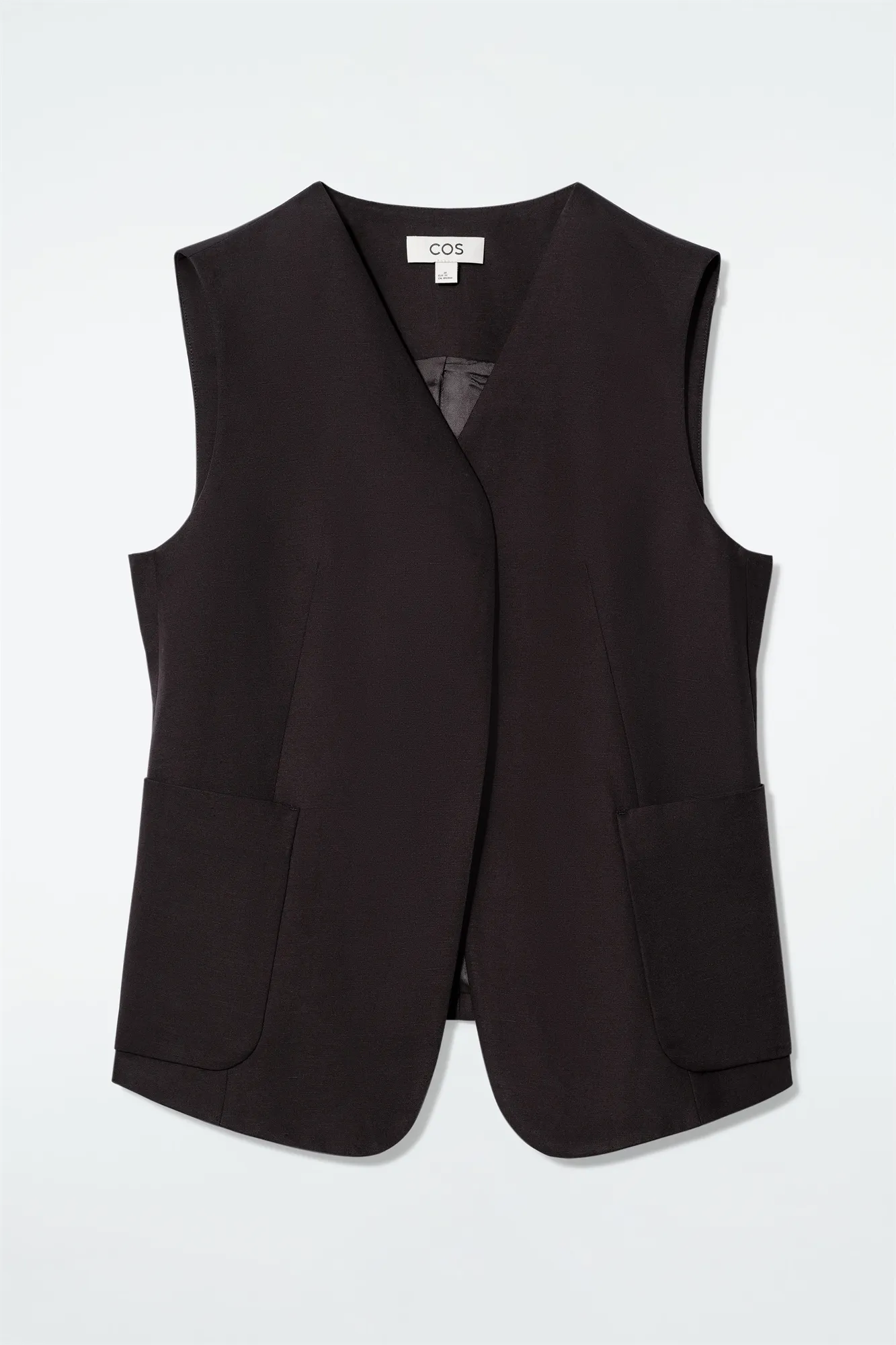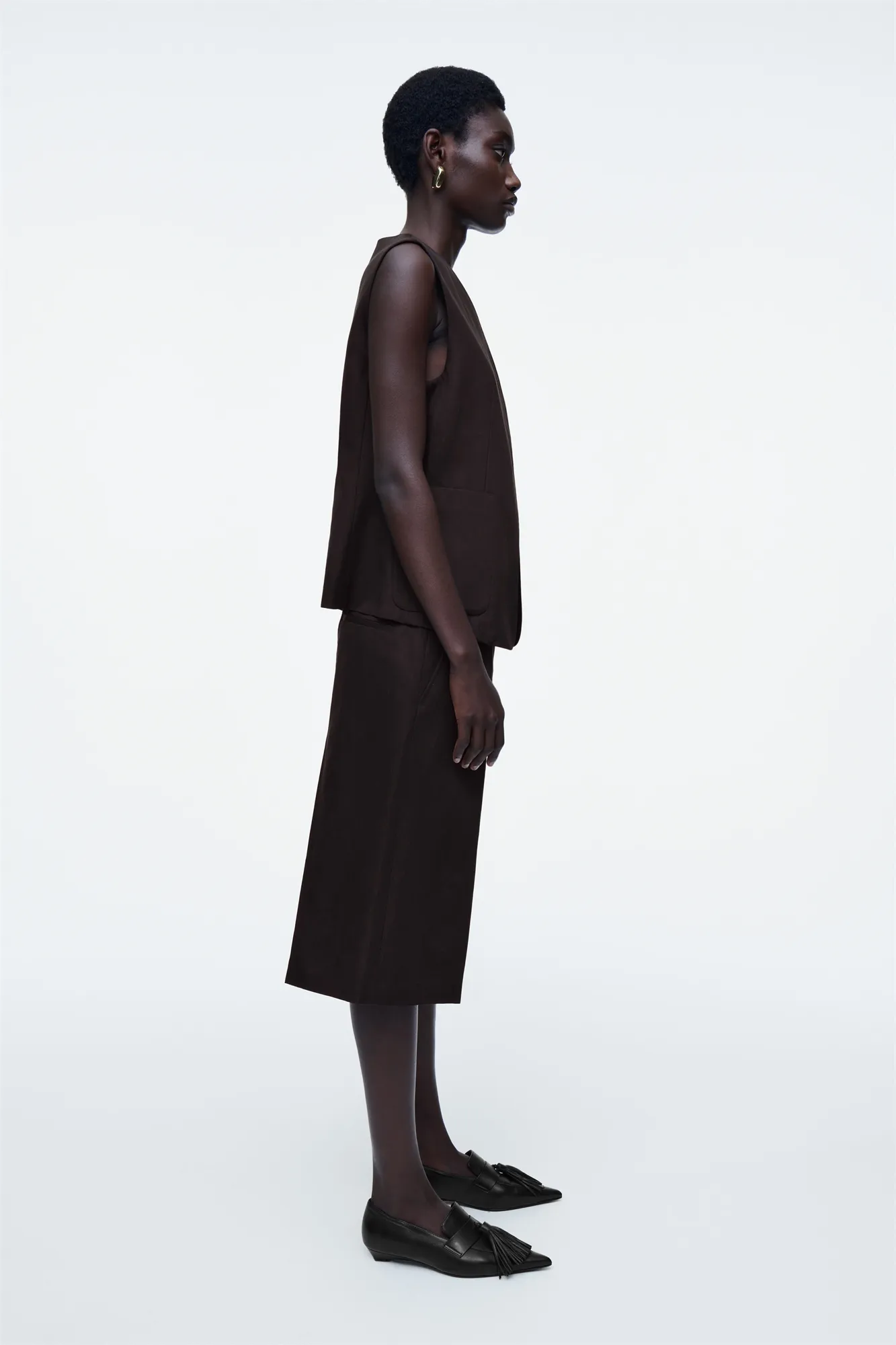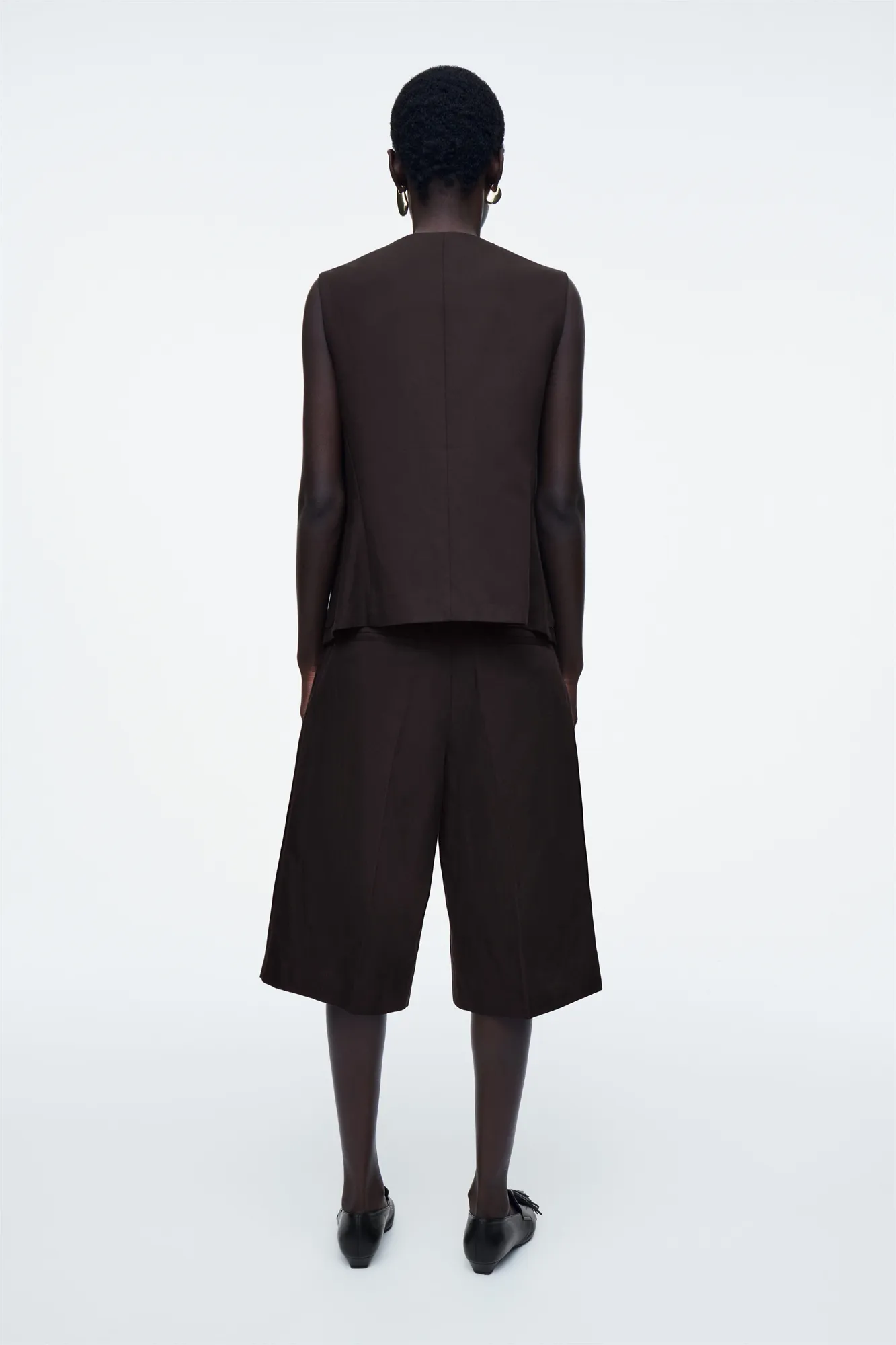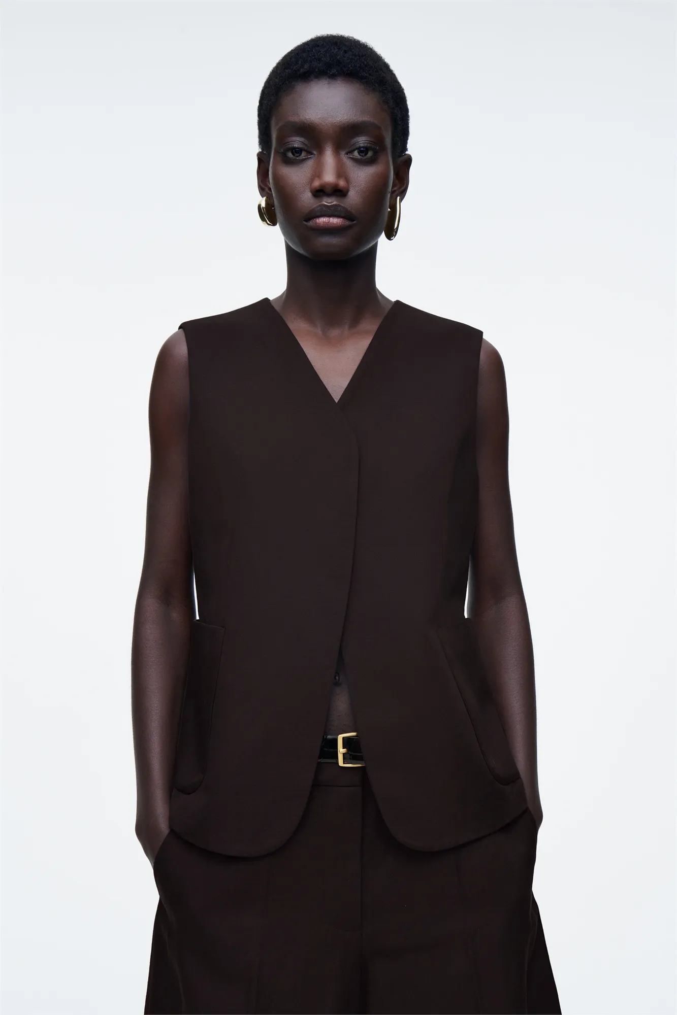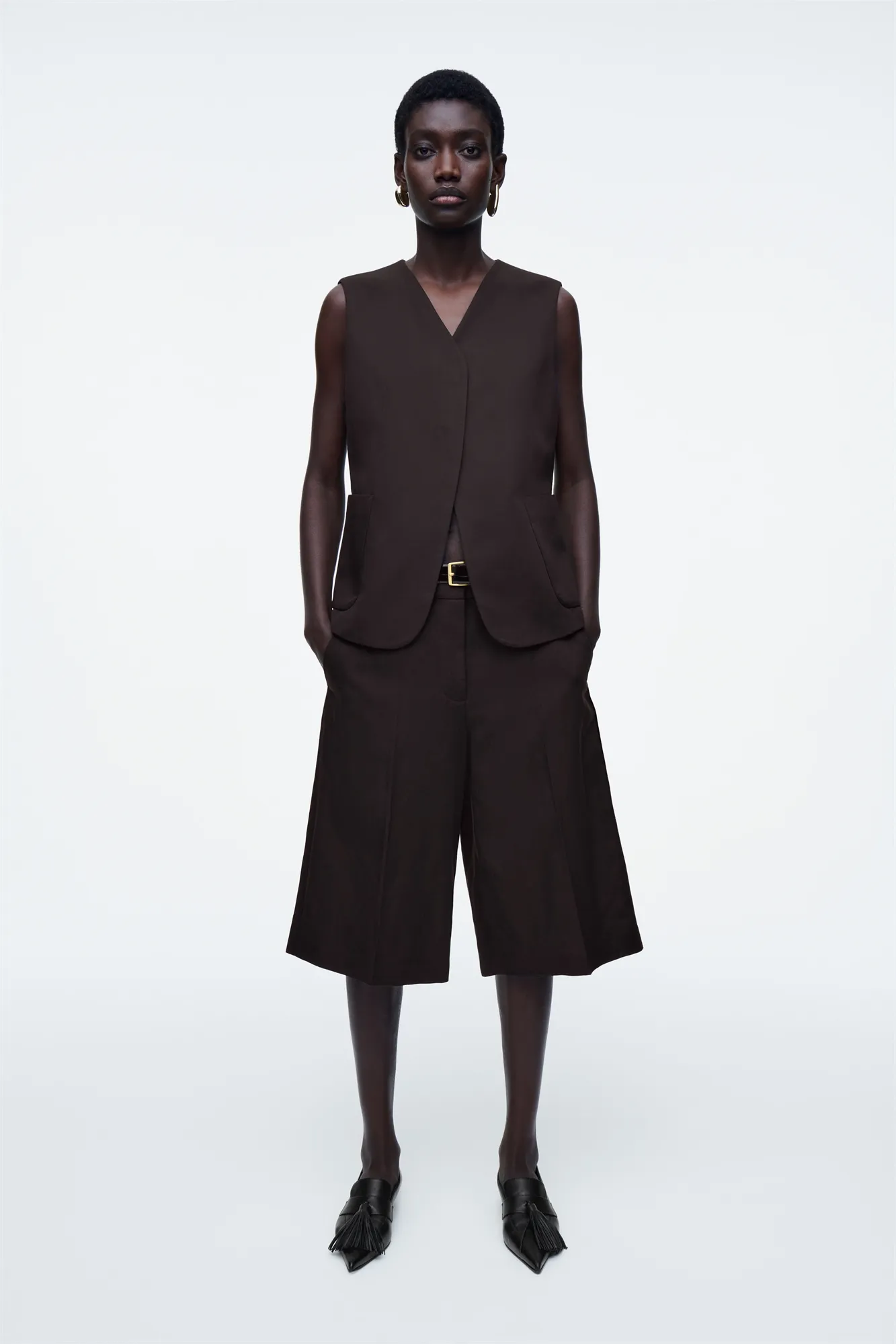 Этот жилет воплощает современный минимализм и имеет силуэт с запахом, создающий асимметричную форму. Модель, выполненная из вискозы ECOVERO™, льна и хлопка, имеет коричневый цвет, поэтому ее можно легко комбинировать с другими предметами одежды. Фигурные вытачки и накладные карманы напоминают классический пошив. Сочетайте жилет с удлиненными шортами из коллекции.