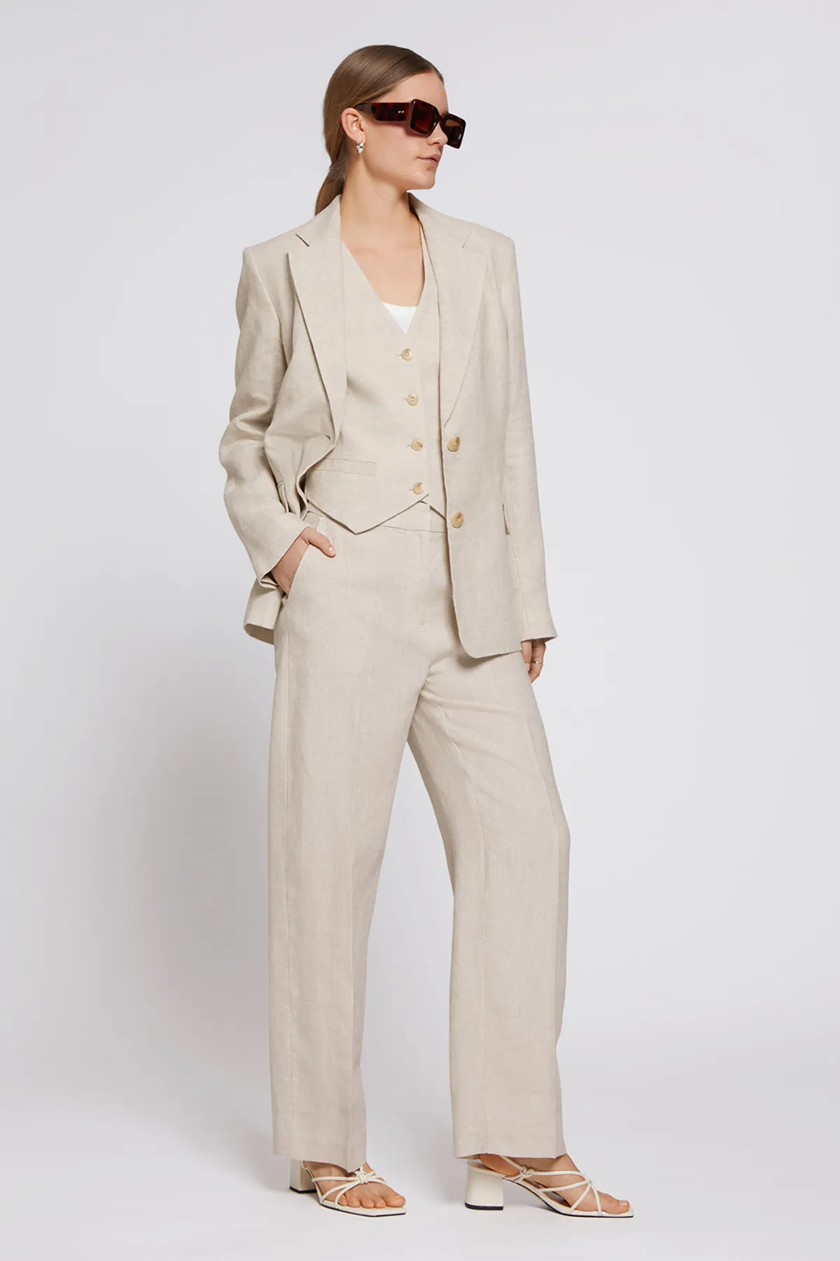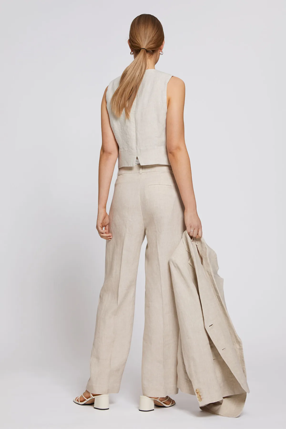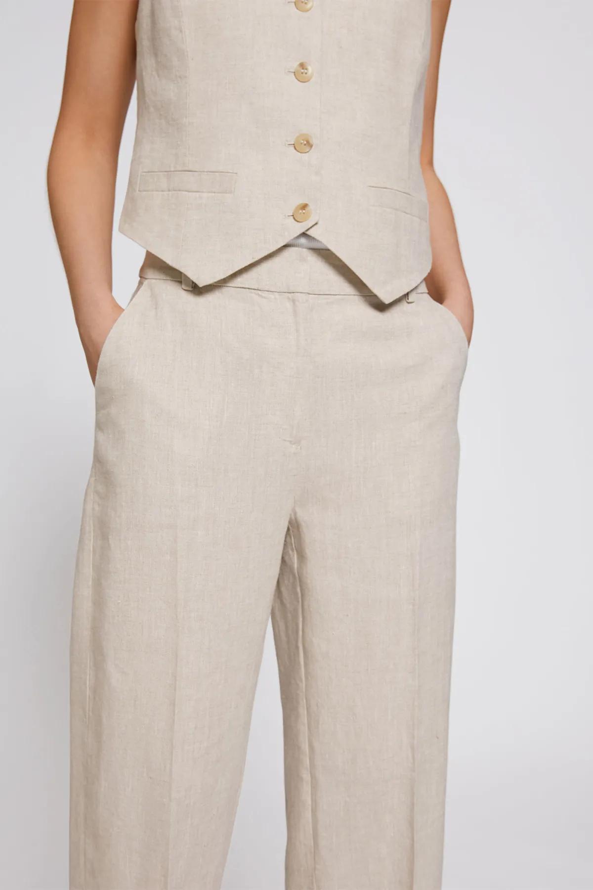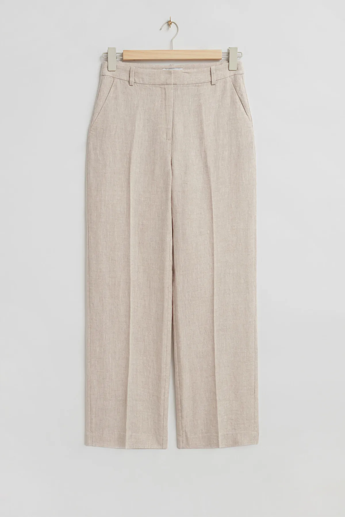 Прямые льняные брюки с центральными складками спереди и сзади, двумя косыми набедренными карманами и карманом с прорезью сзади. Модель также оснащена потайной застежкой на молнию и крючок, а также петлями для ремня.