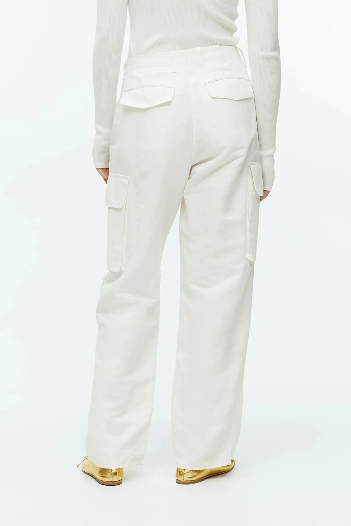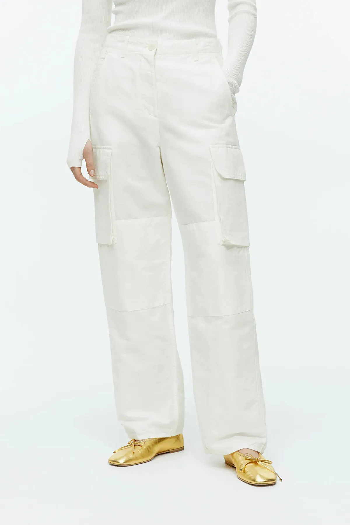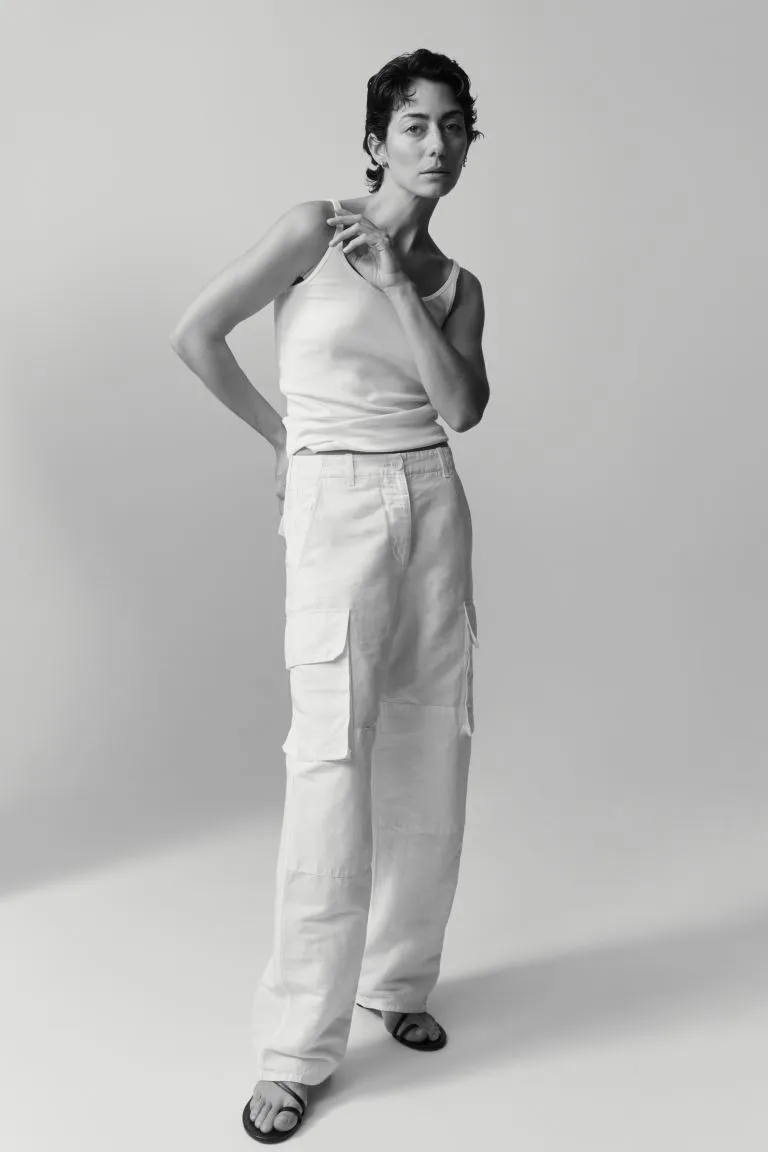 Брюки карго из смеси льна и органического хлопка. Крой свободный со средней посадкой на талии и широкими слегка бочкообразными штанинами. Косые передние карманы и карманы с клапанами на штанинах. Наколенники. Двойные прорезные карманы с клапанами сзади.