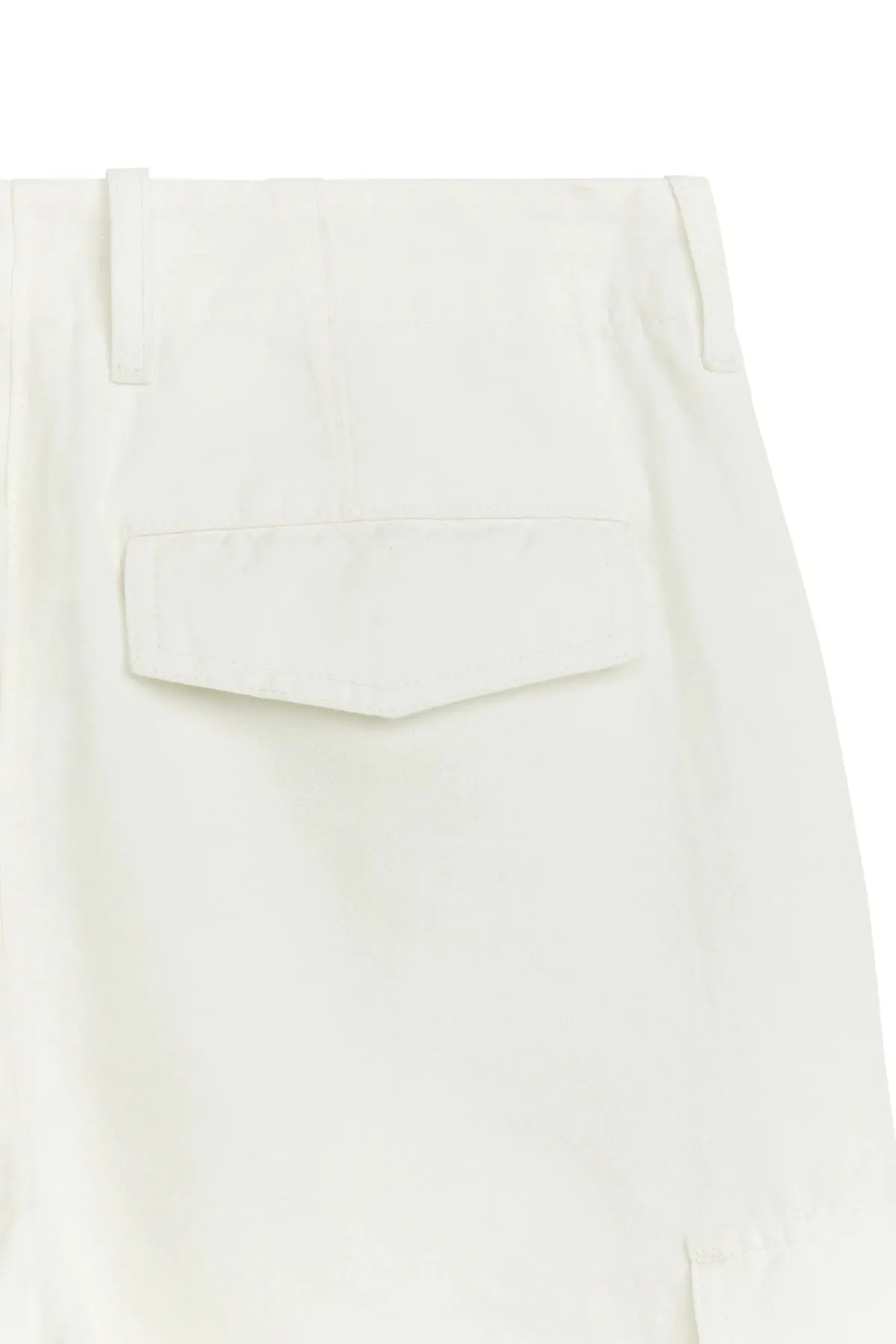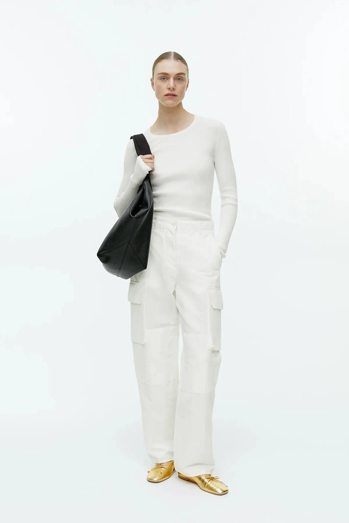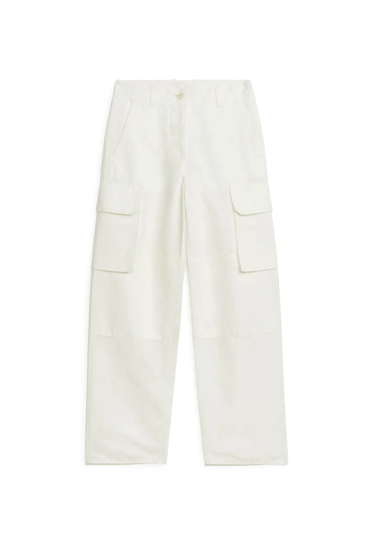 Брюки карго из смеси льна и органического хлопка. Крой свободный со средней посадкой на талии и широкими слегка бочкообразными штанинами. Косые передние карманы и карманы с клапанами на штанинах. Наколенники. Двойные прорезные карманы с клапанами сзади.