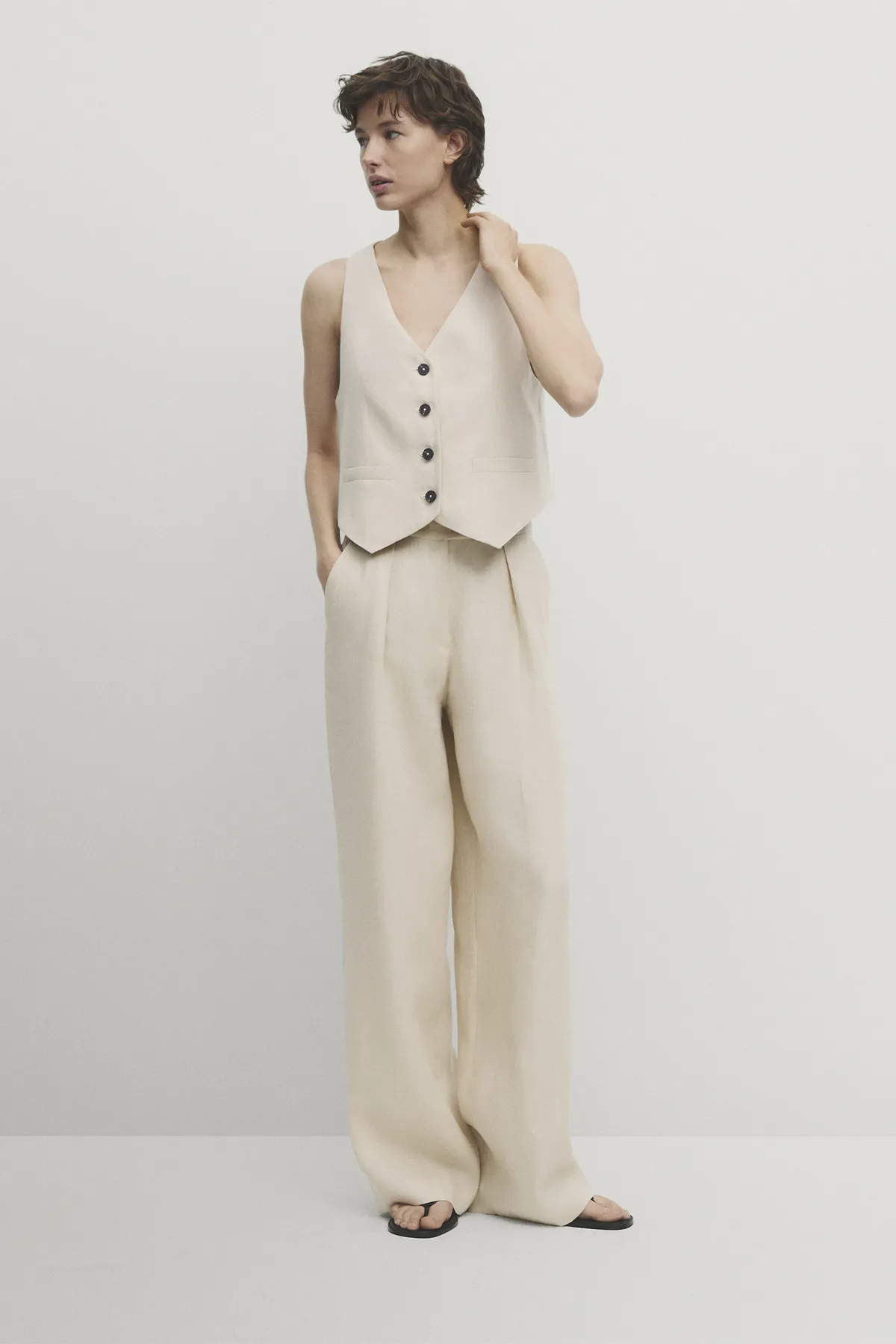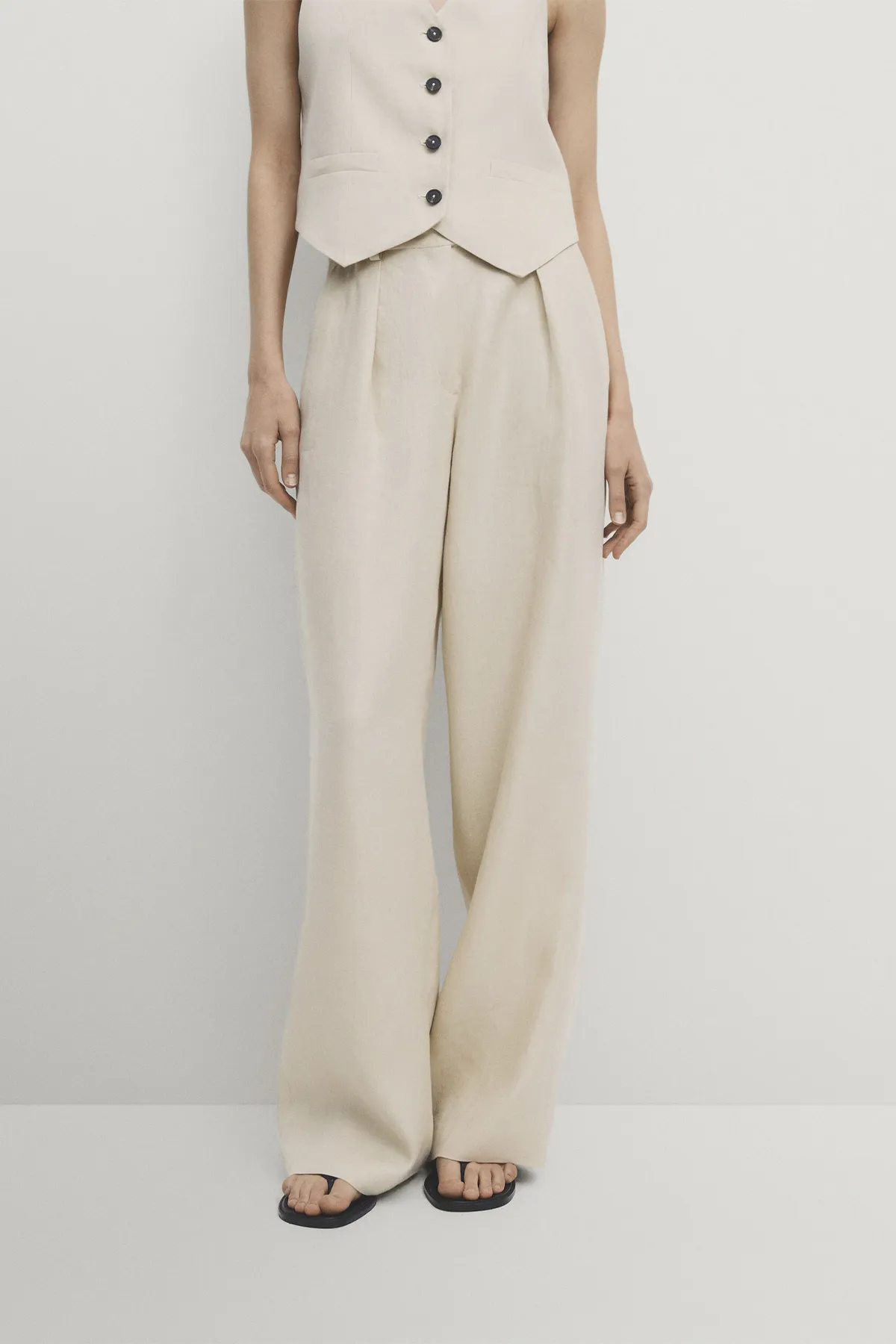 Костюмные брюки из 100% льна с широкими штанинами и защипами спереди. В коллекцию так же входит жилет в том же стиле.