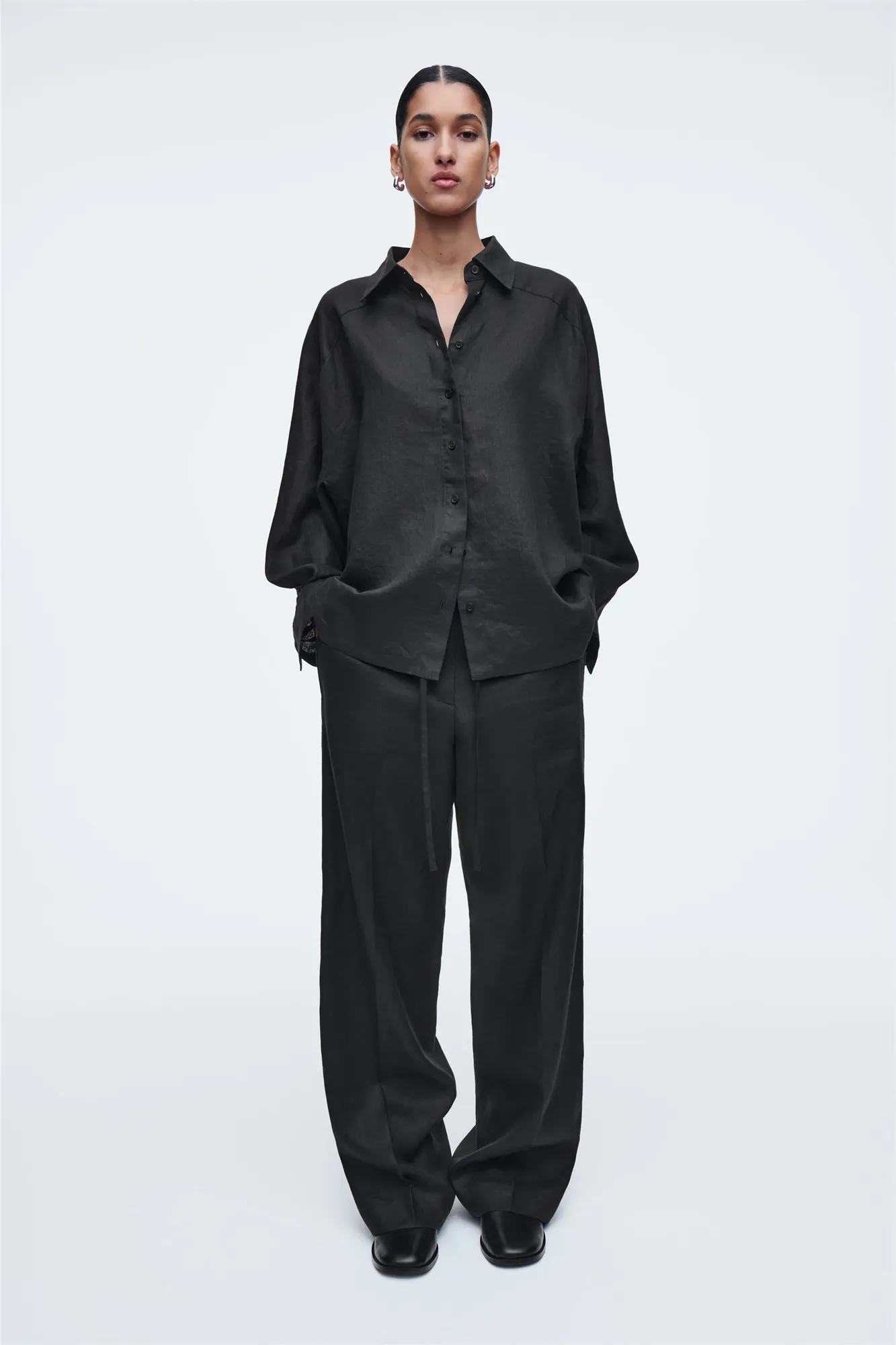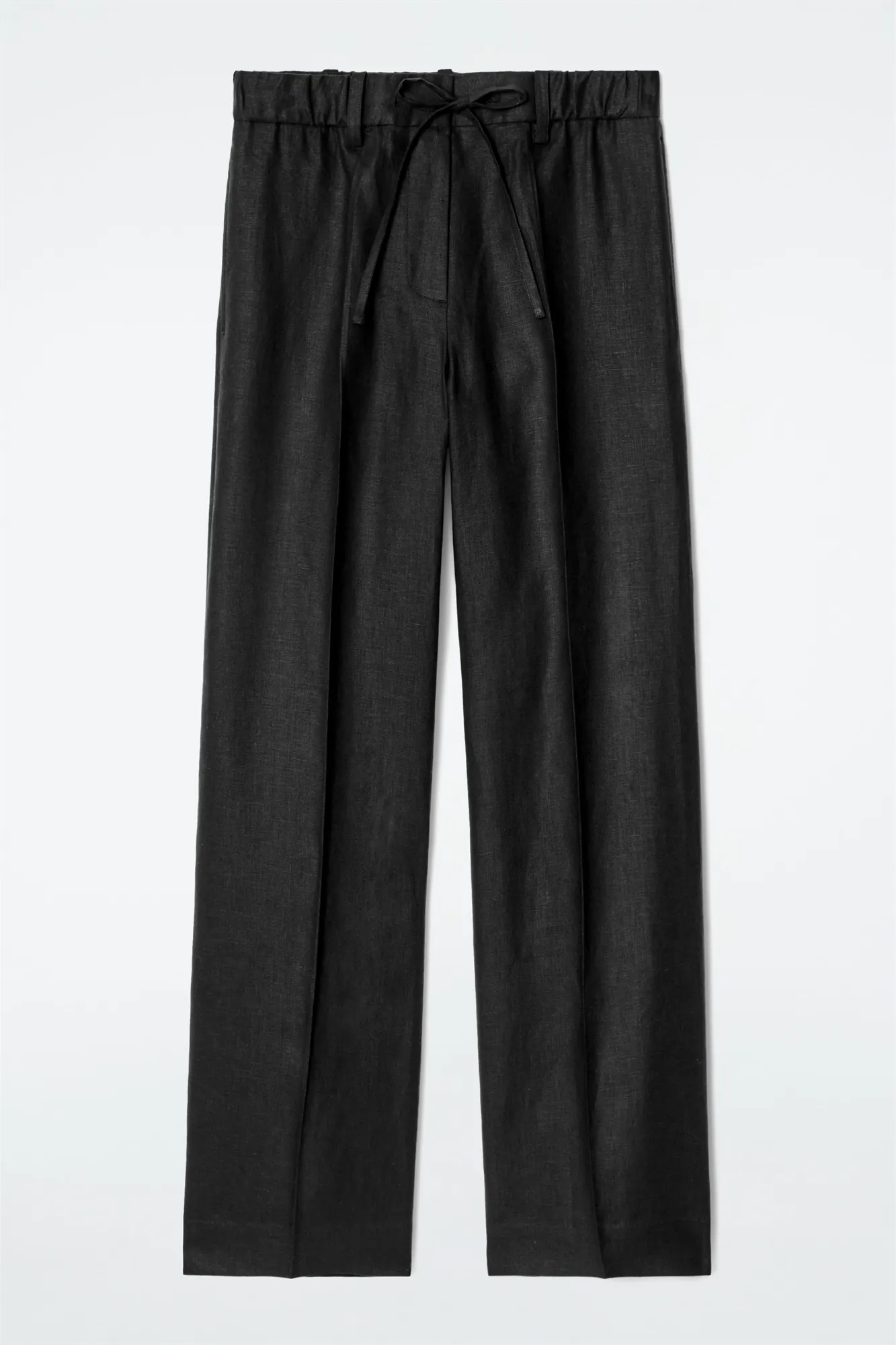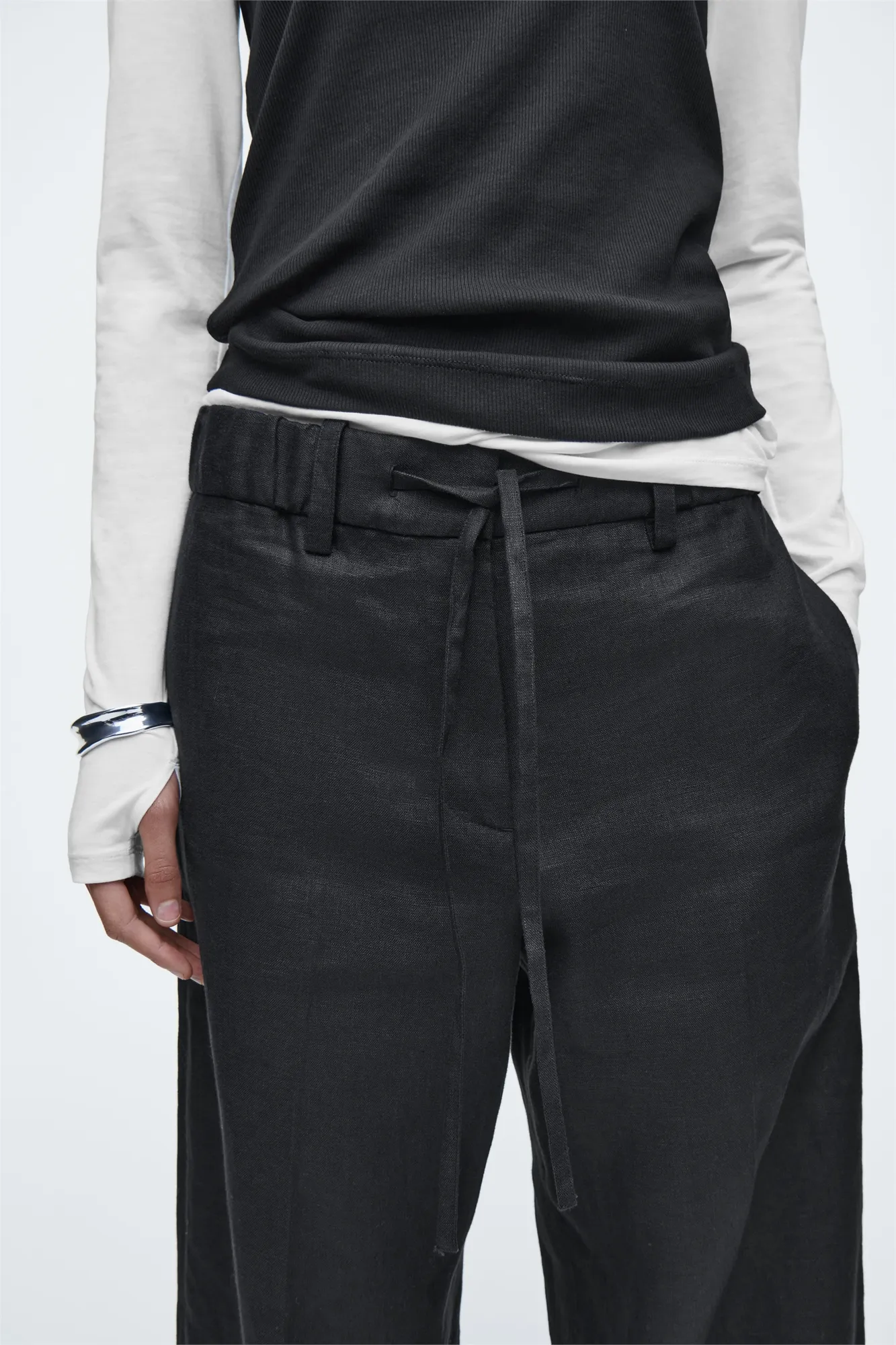 Брюки выглядят невероятно благородно благодаря черному оттенку в фактуре льняной ткани. Фасон позволяет отрегулировать посадку и длину, используя шнурок на талии.