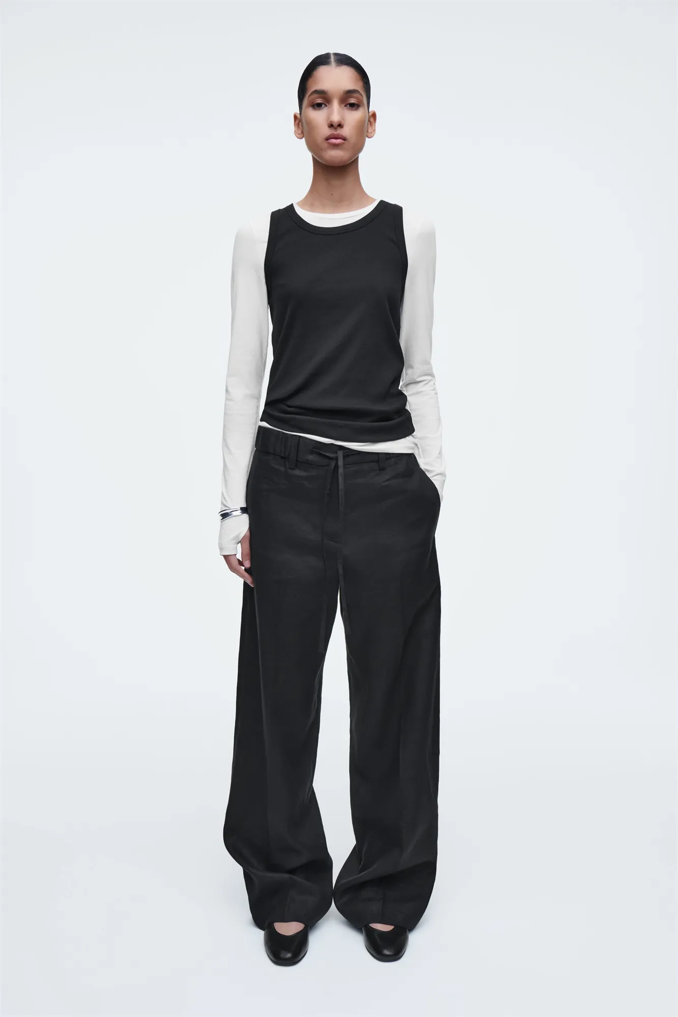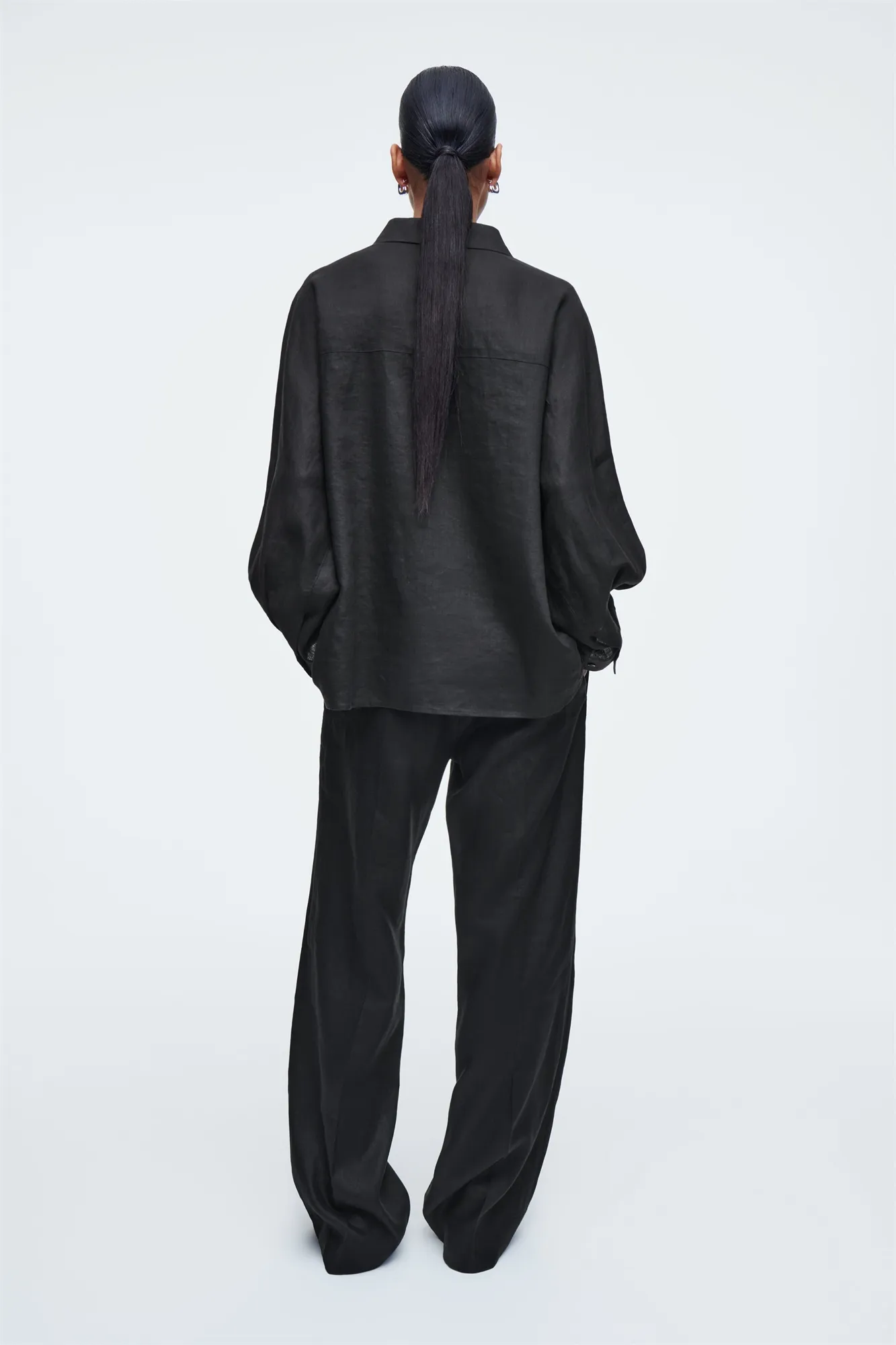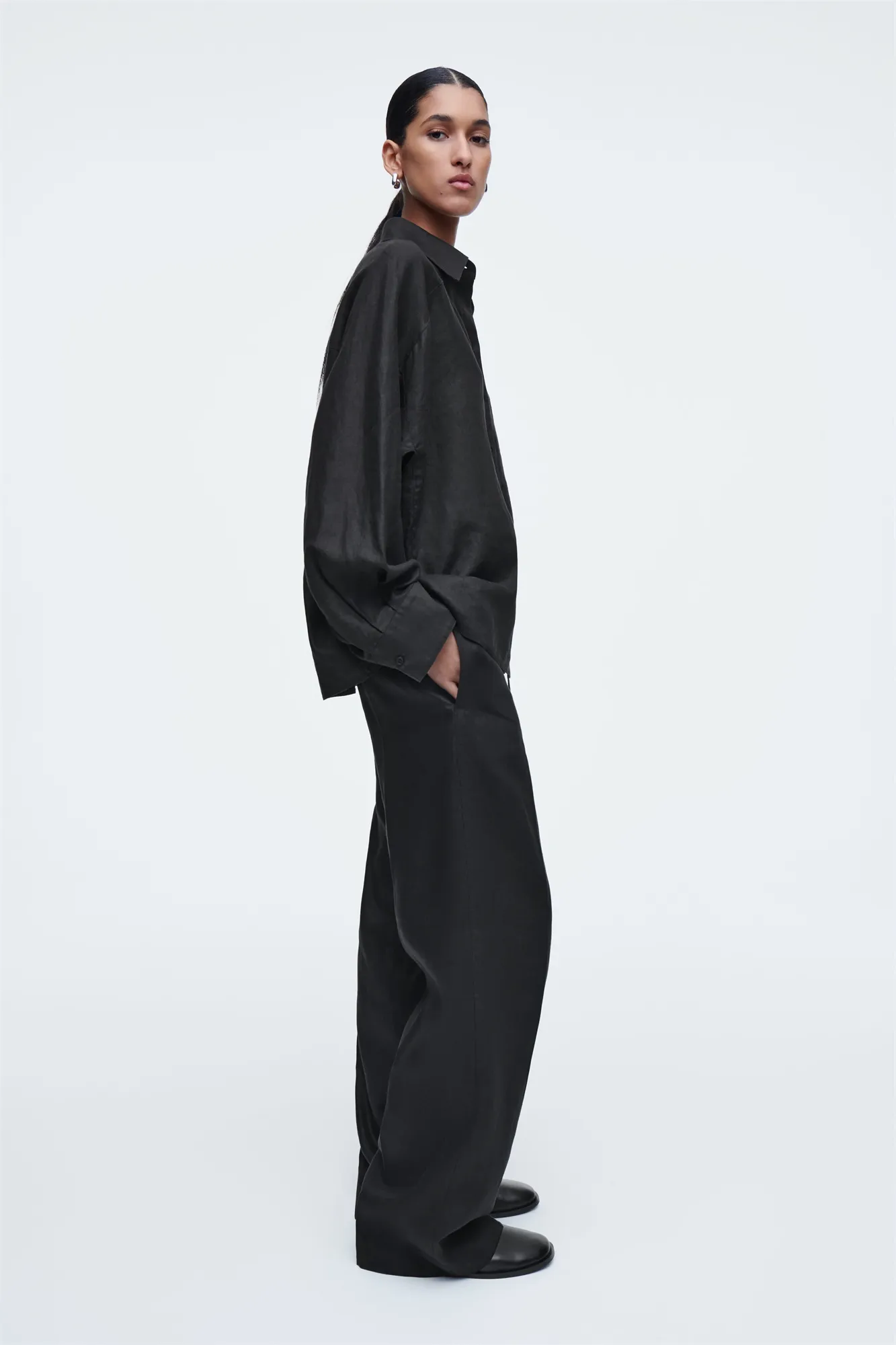 Брюки выглядят невероятно благородно благодаря черному оттенку в фактуре льняной ткани. Фасон позволяет отрегулировать посадку и длину, используя шнурок на талии.