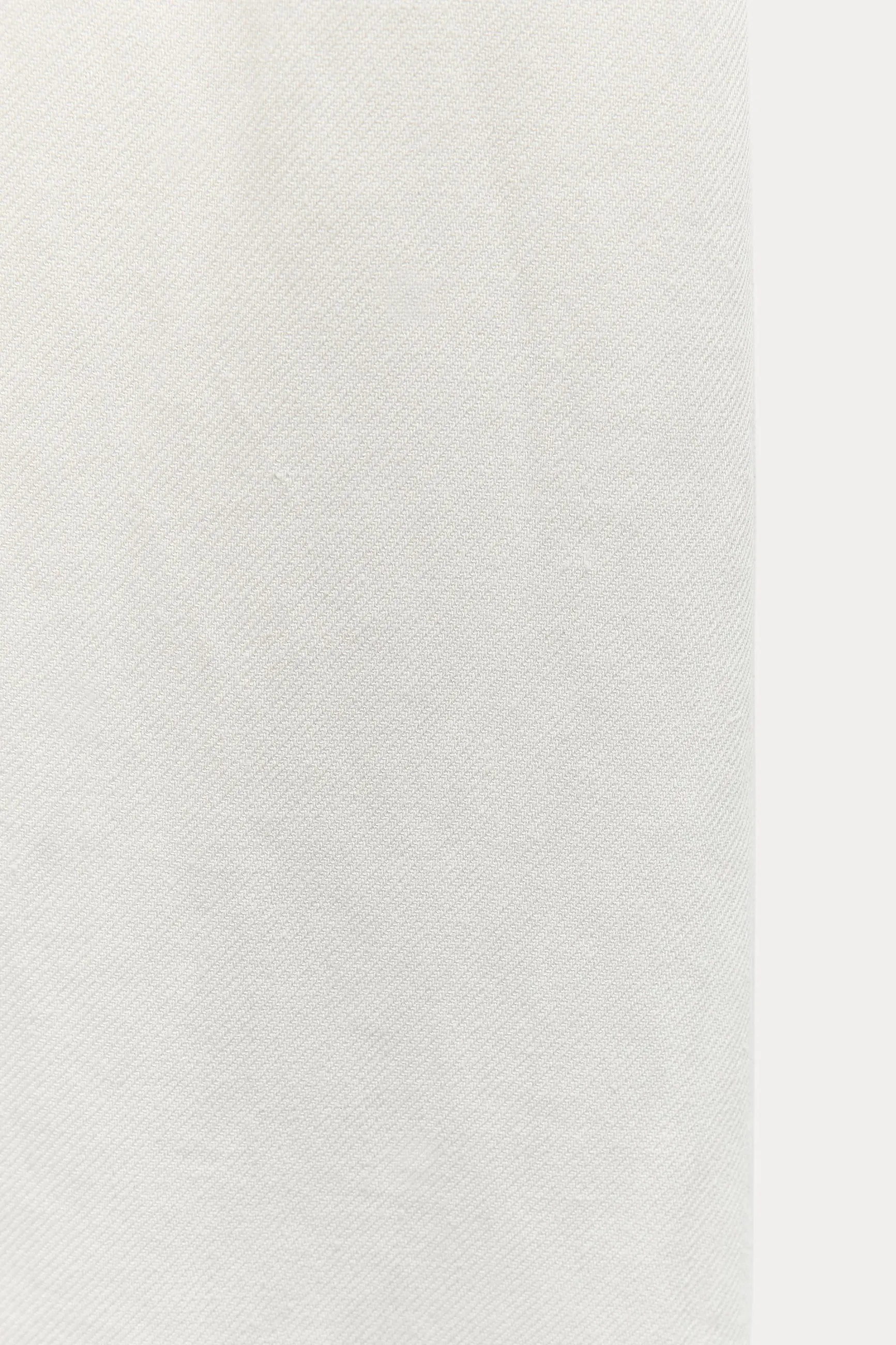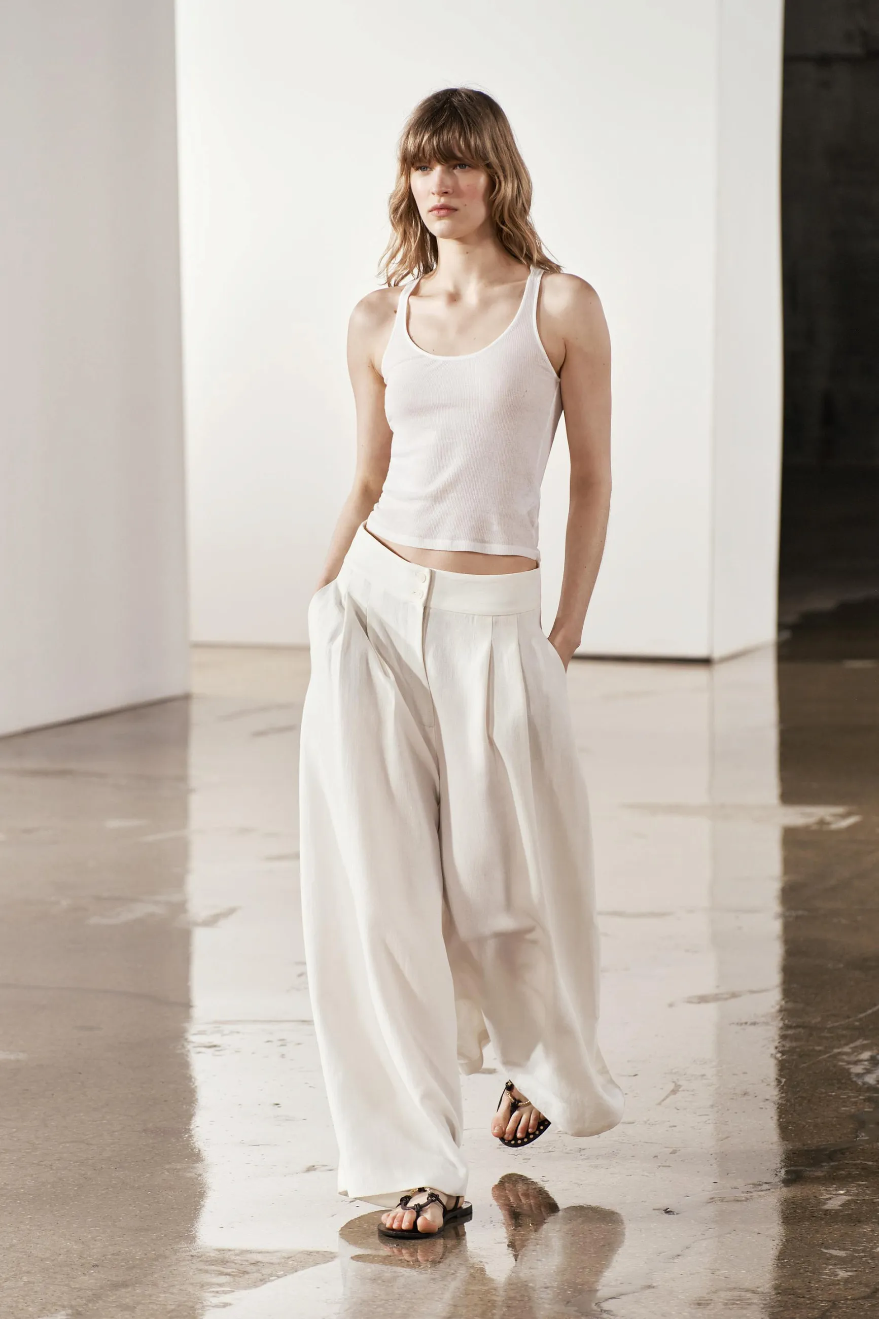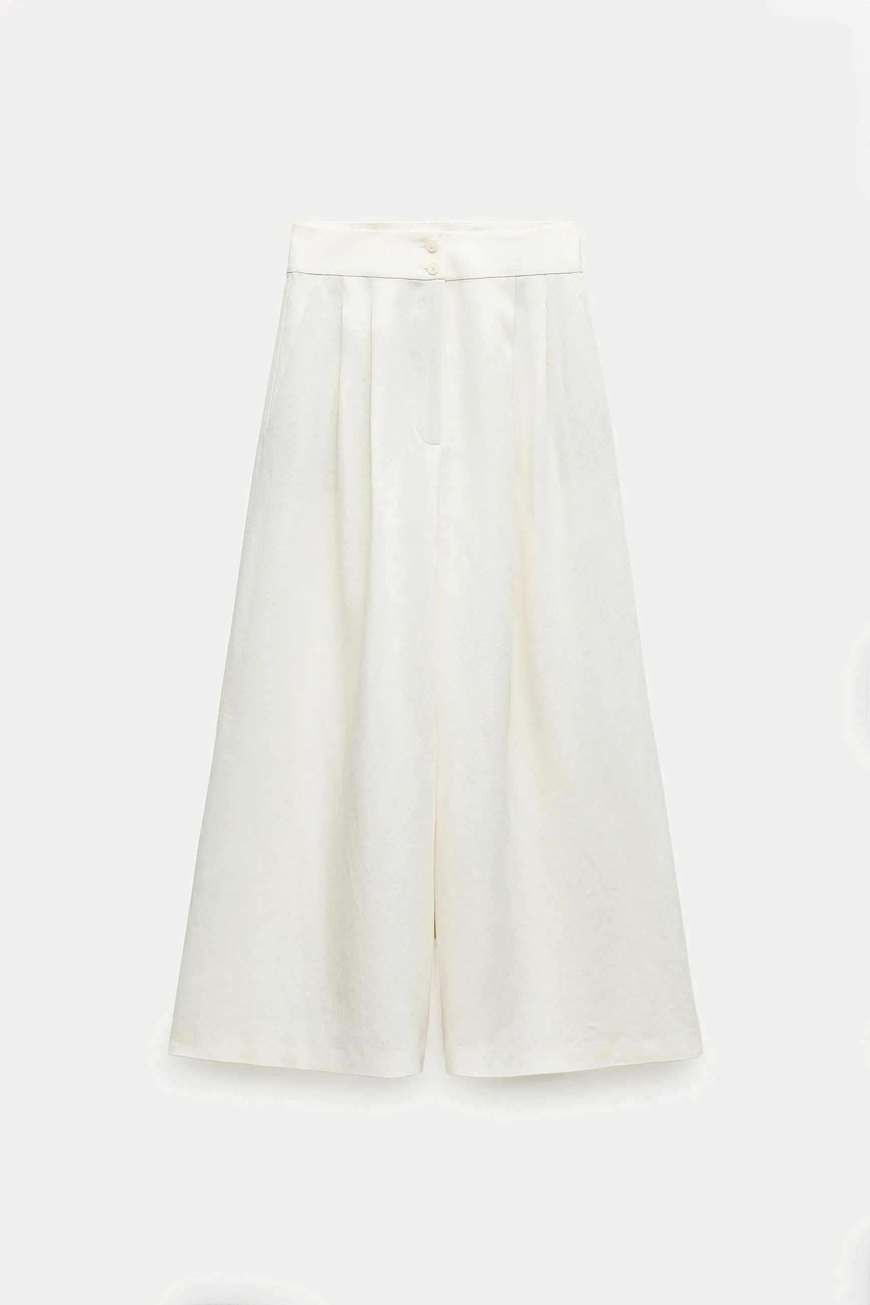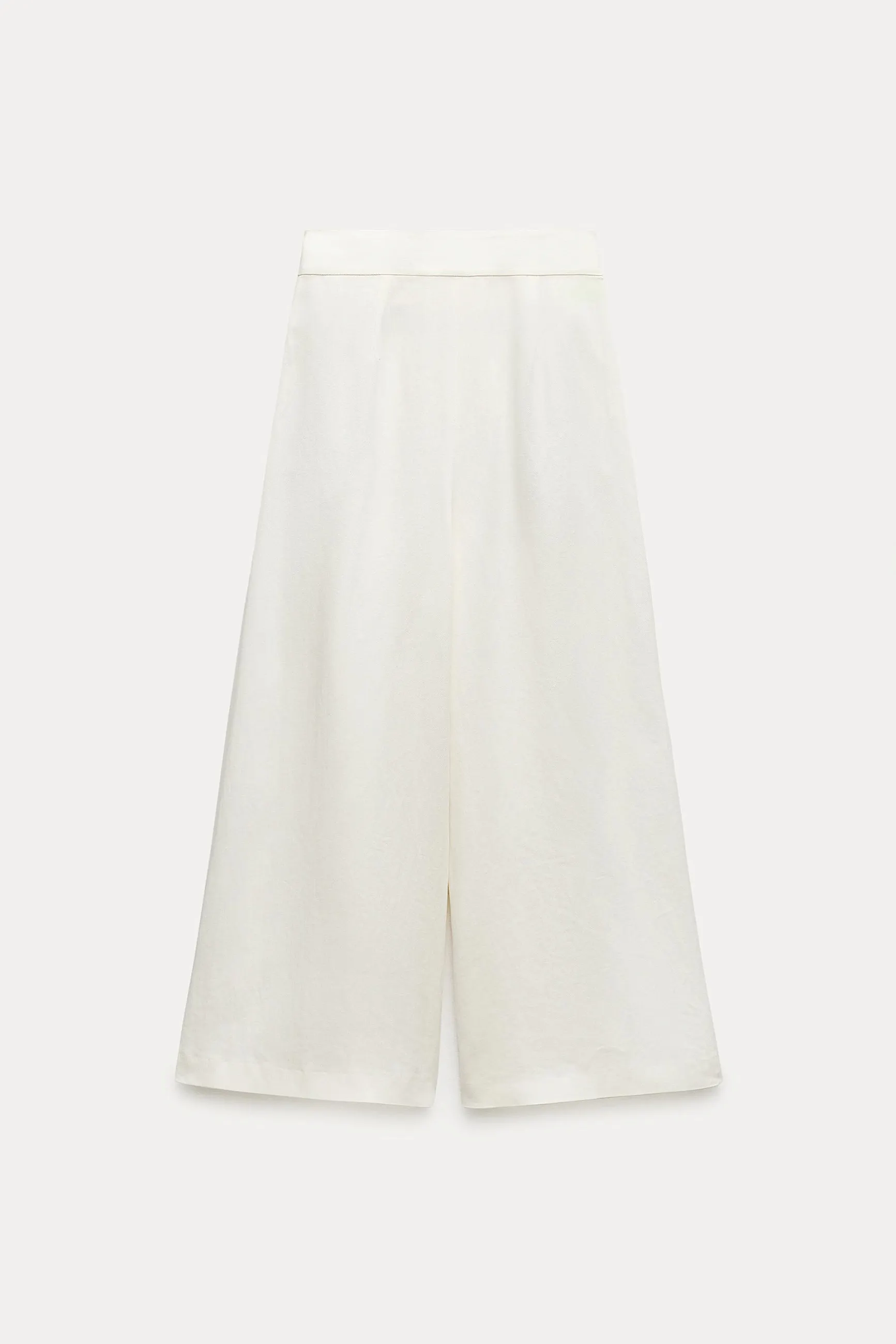 Брюки средней посадки из смесового льна. Боковые карманы. Вытачки спереди. Модель с широкими штанинами. Застежка на молнию и пуговицу спереди.