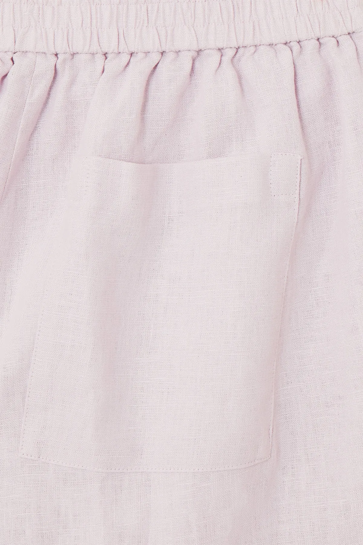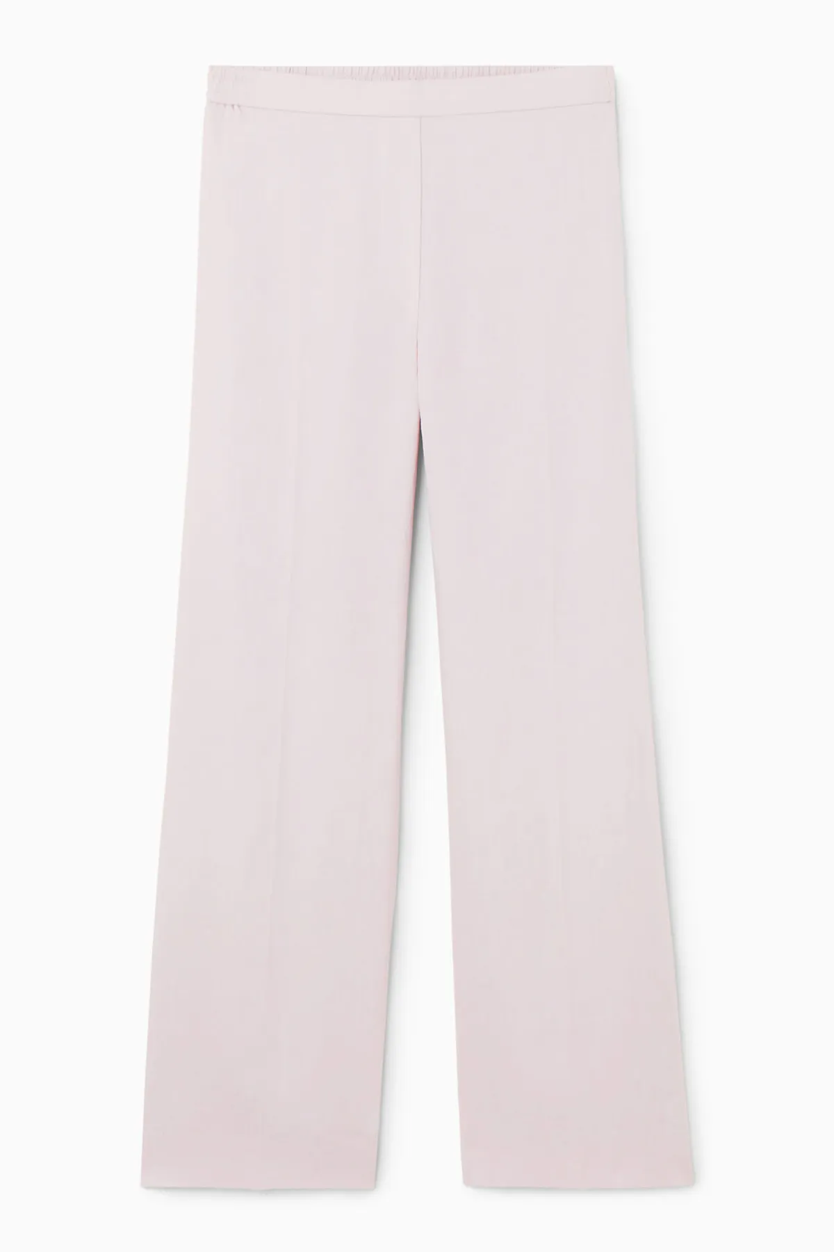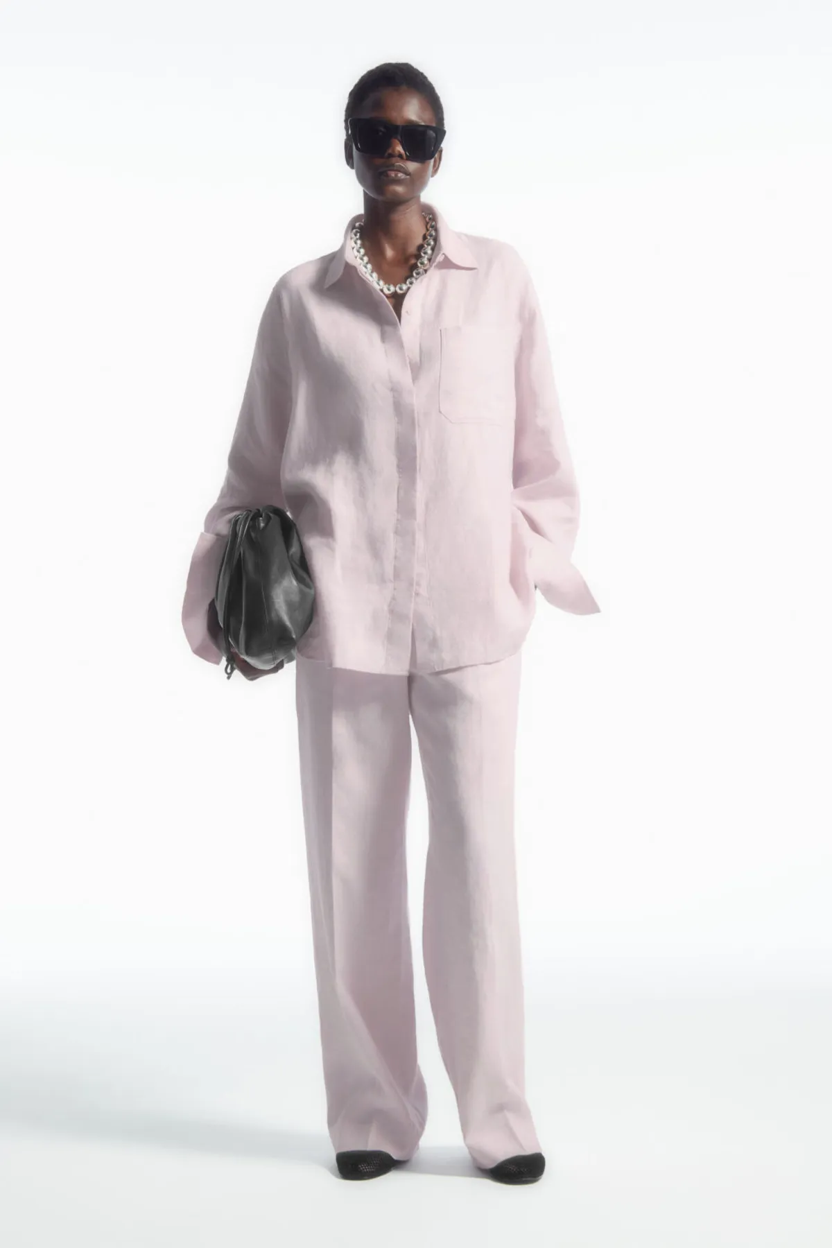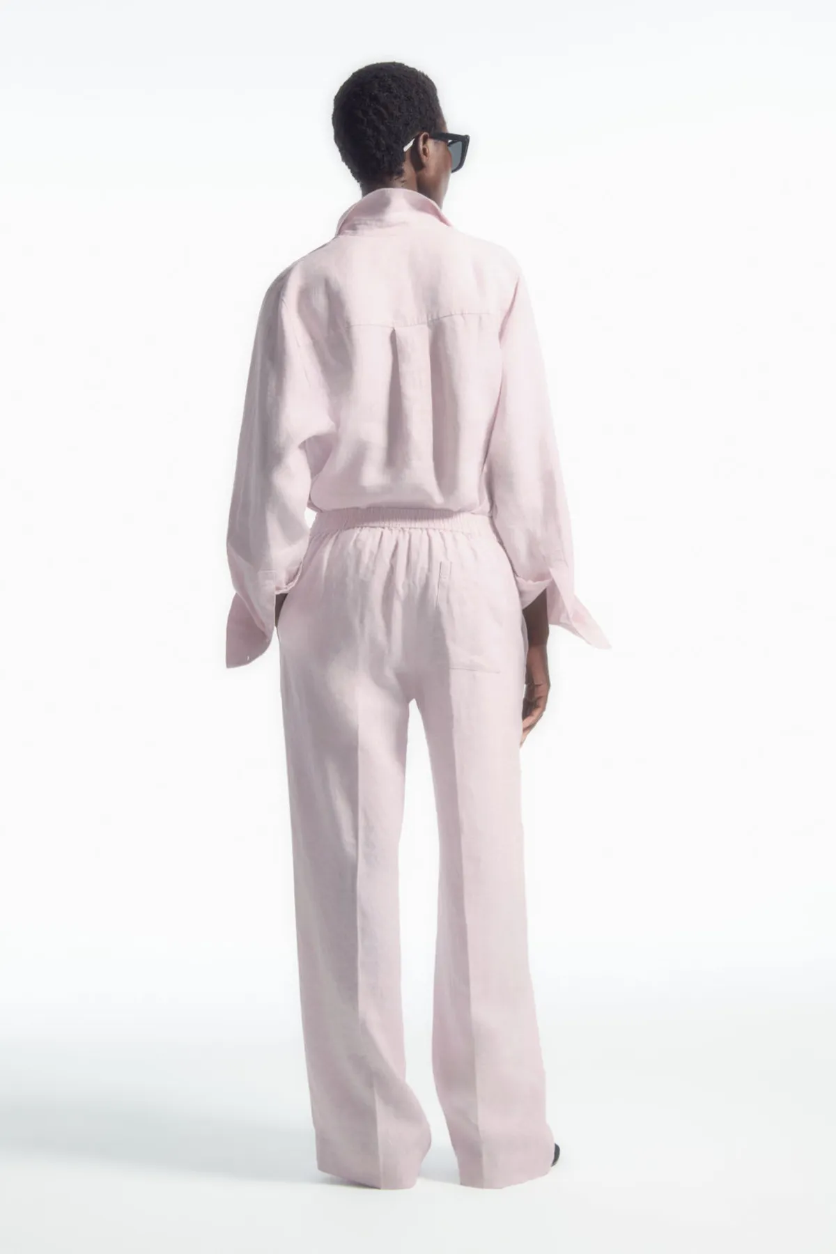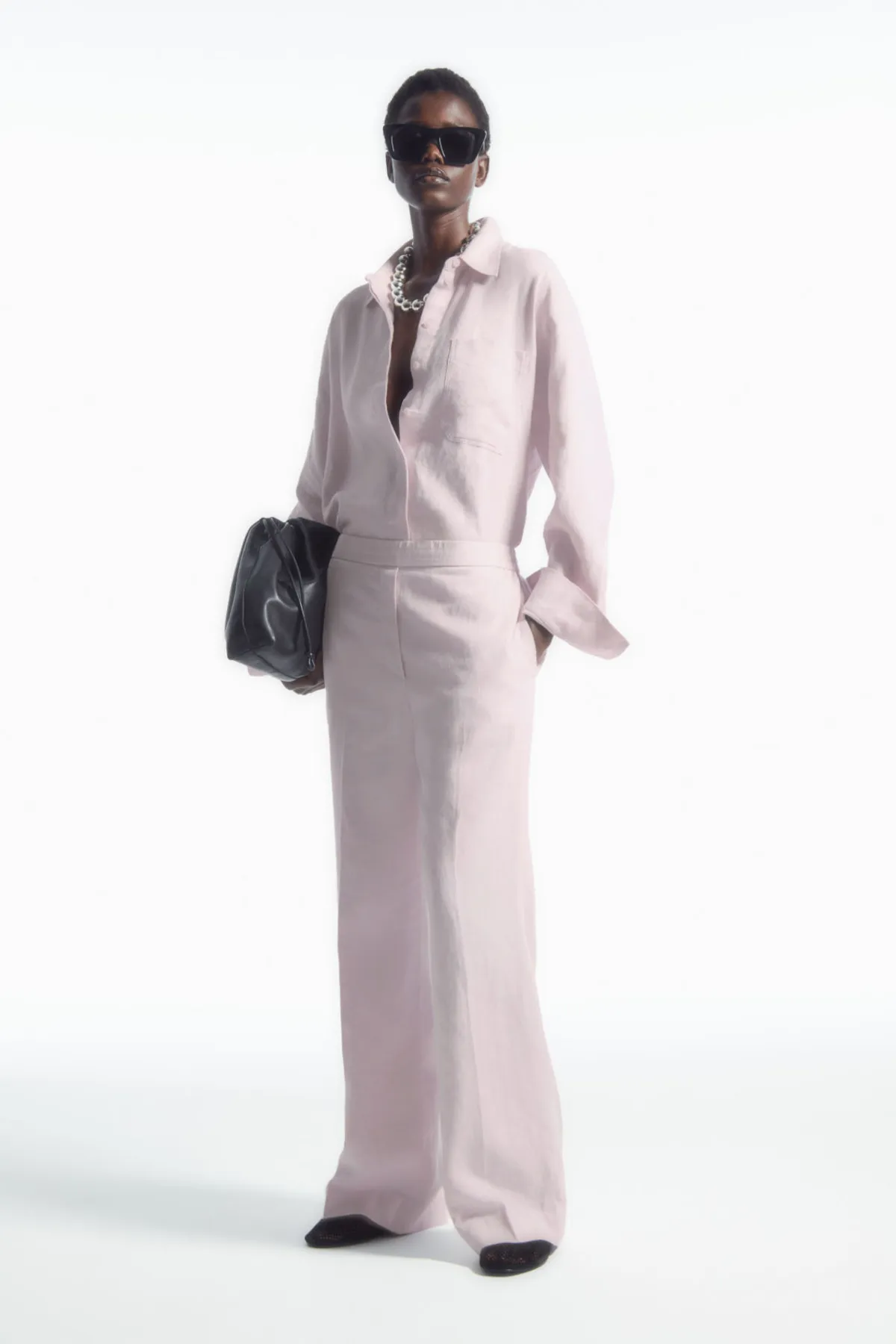 Эти сшитые на заказ брюки, взятые из архивов COS, были обновлены для предстоящих теплых месяцев. Они изготовлены из естественно дышащего льна, имеют прямые длинные брючины, облегающие обувь, частично эластичный пояс, запрессованные складки и несколько карманов. Создайте их в комплекте с соответствующими рубашками с короткими или длинными рукавами.