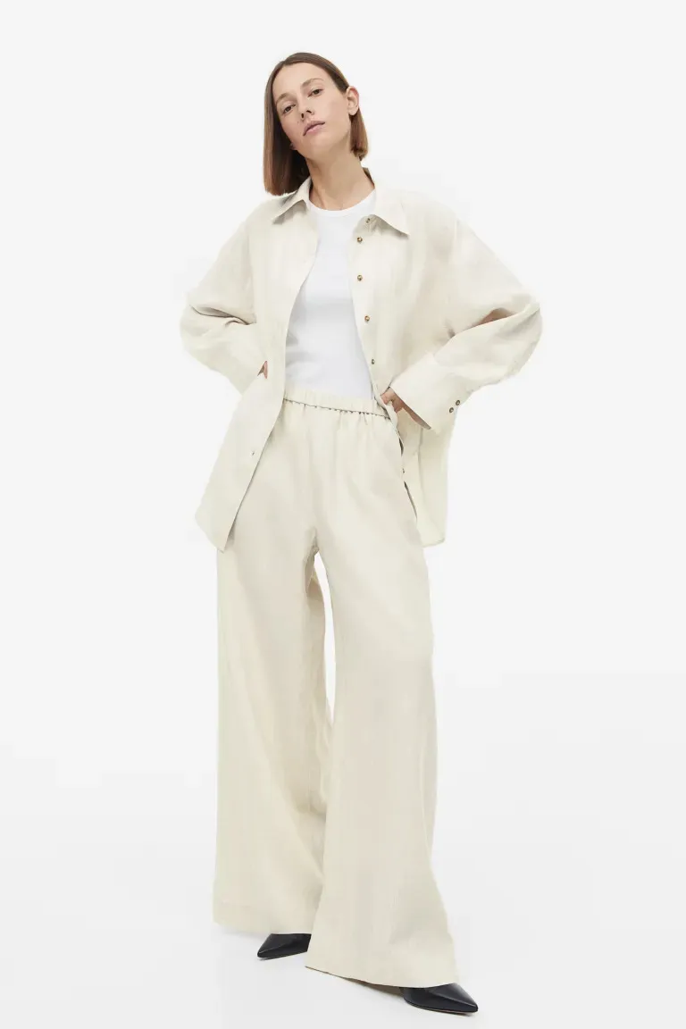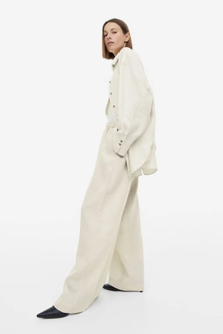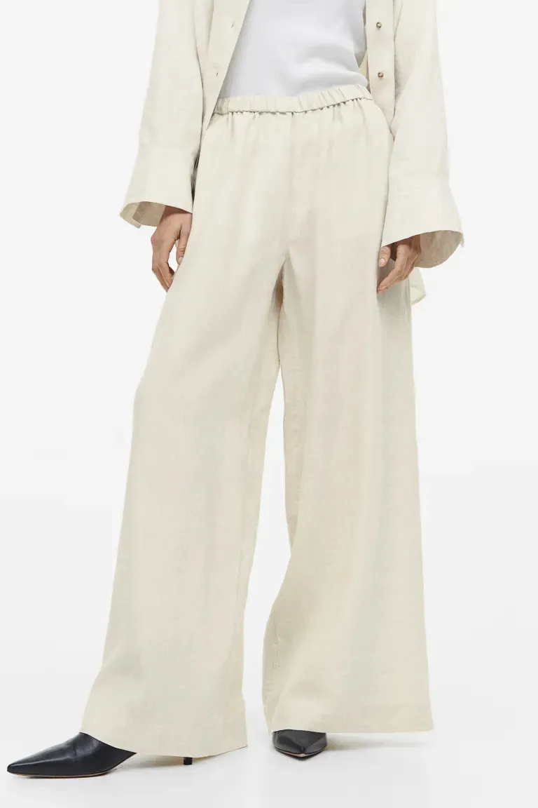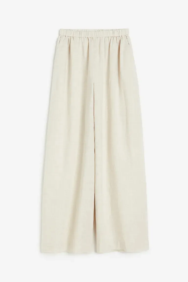 Льняные брюки свободного кроя. Высокая талия на потайной резинке, косые боковые карманы и широкие прямые брючины. Создайте комплект с подходящей рубашкой.