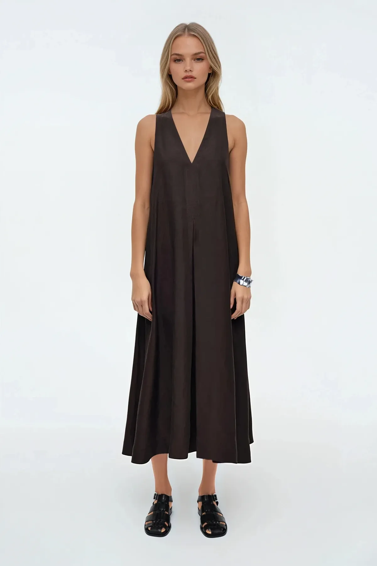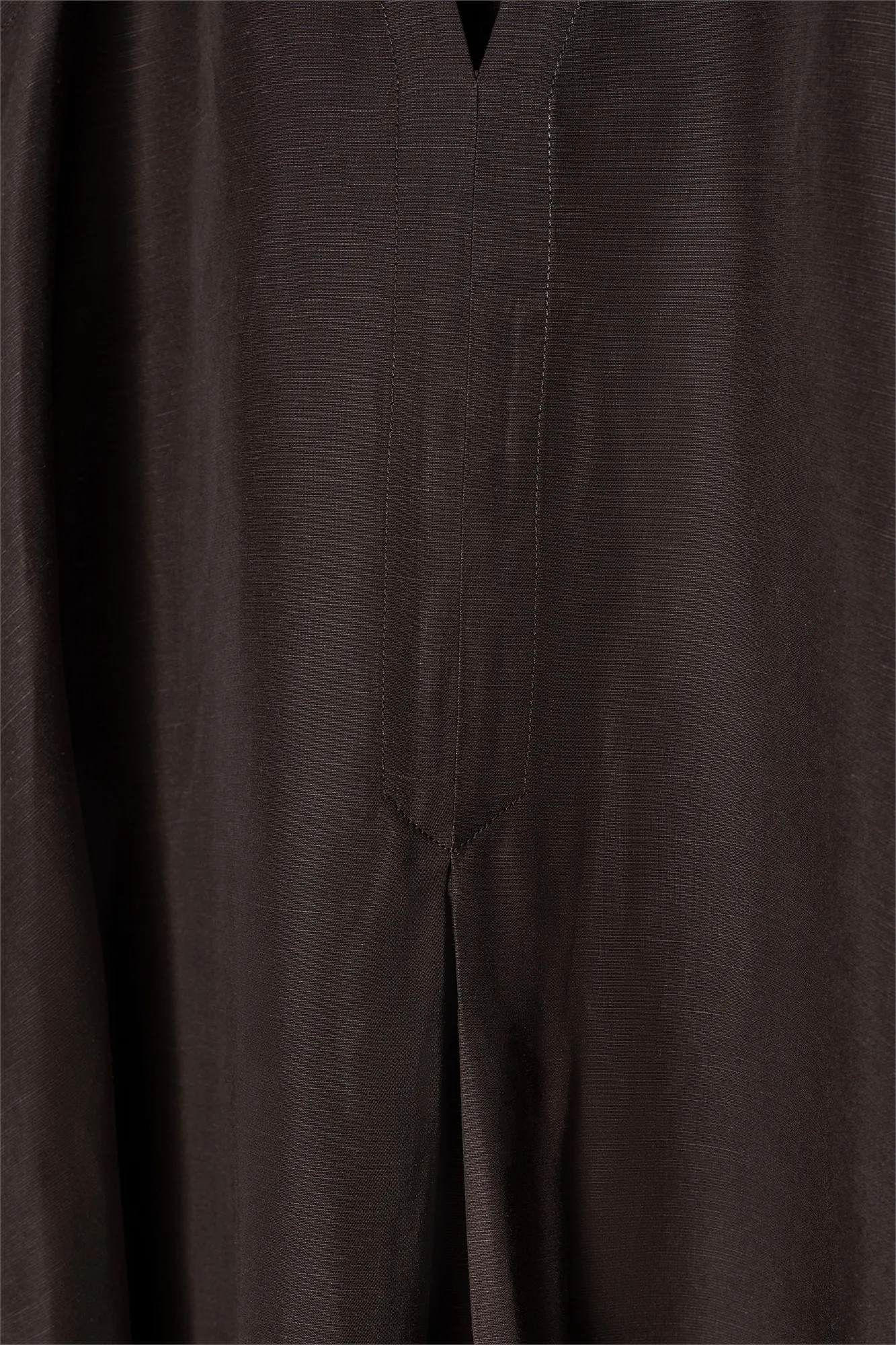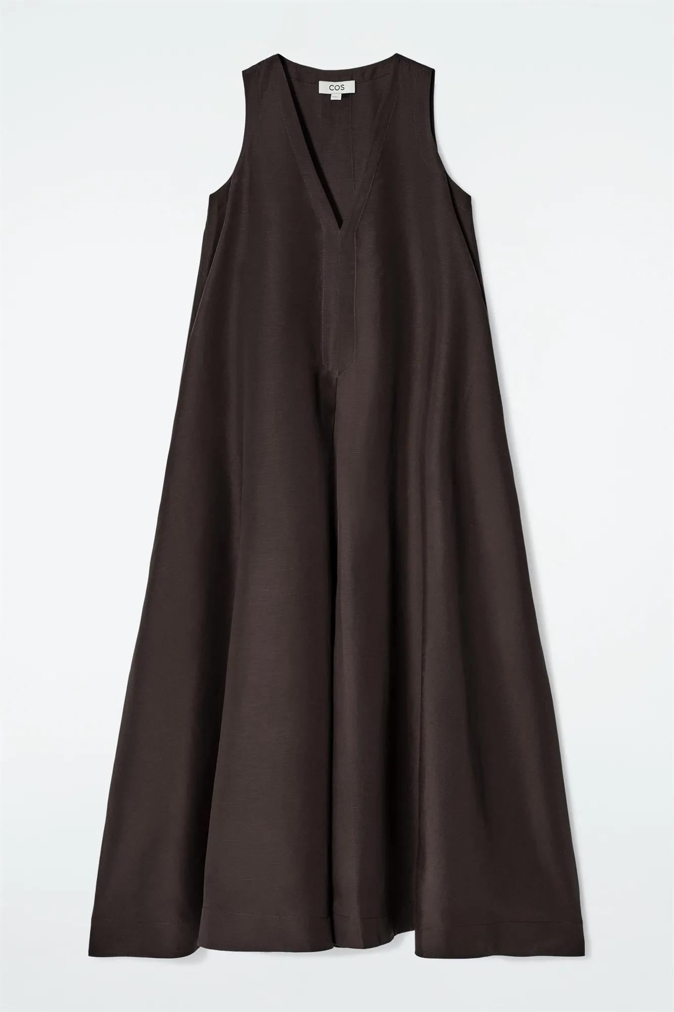 Это простое макси-платье выполнено из легкой, струящейся смеси лиоцелла TENCEL™ и льна, которая красиво драпируется. Модель А-силуэта имеет V-образный вырез и плиссировку, придающую ей объем.