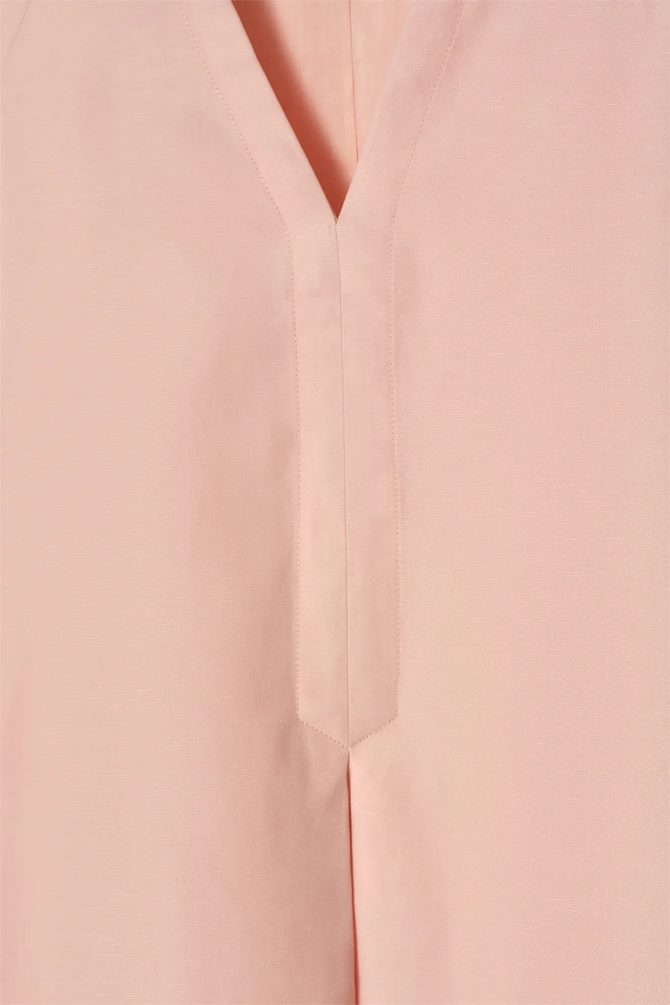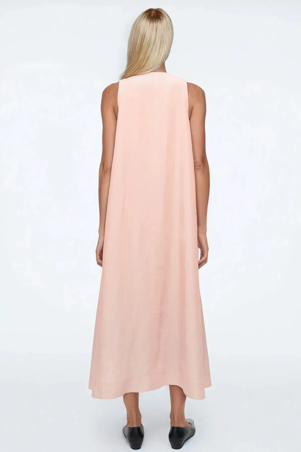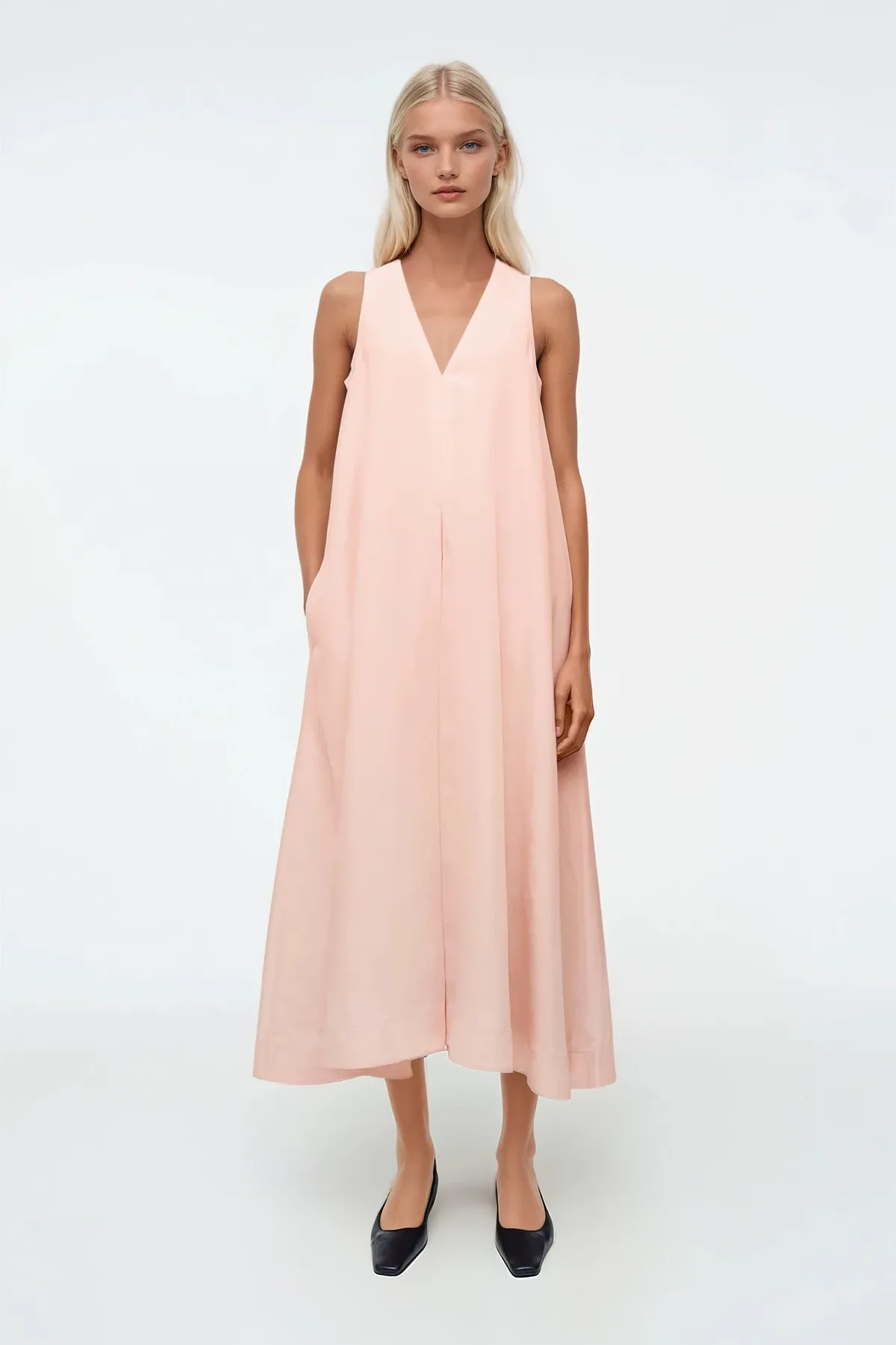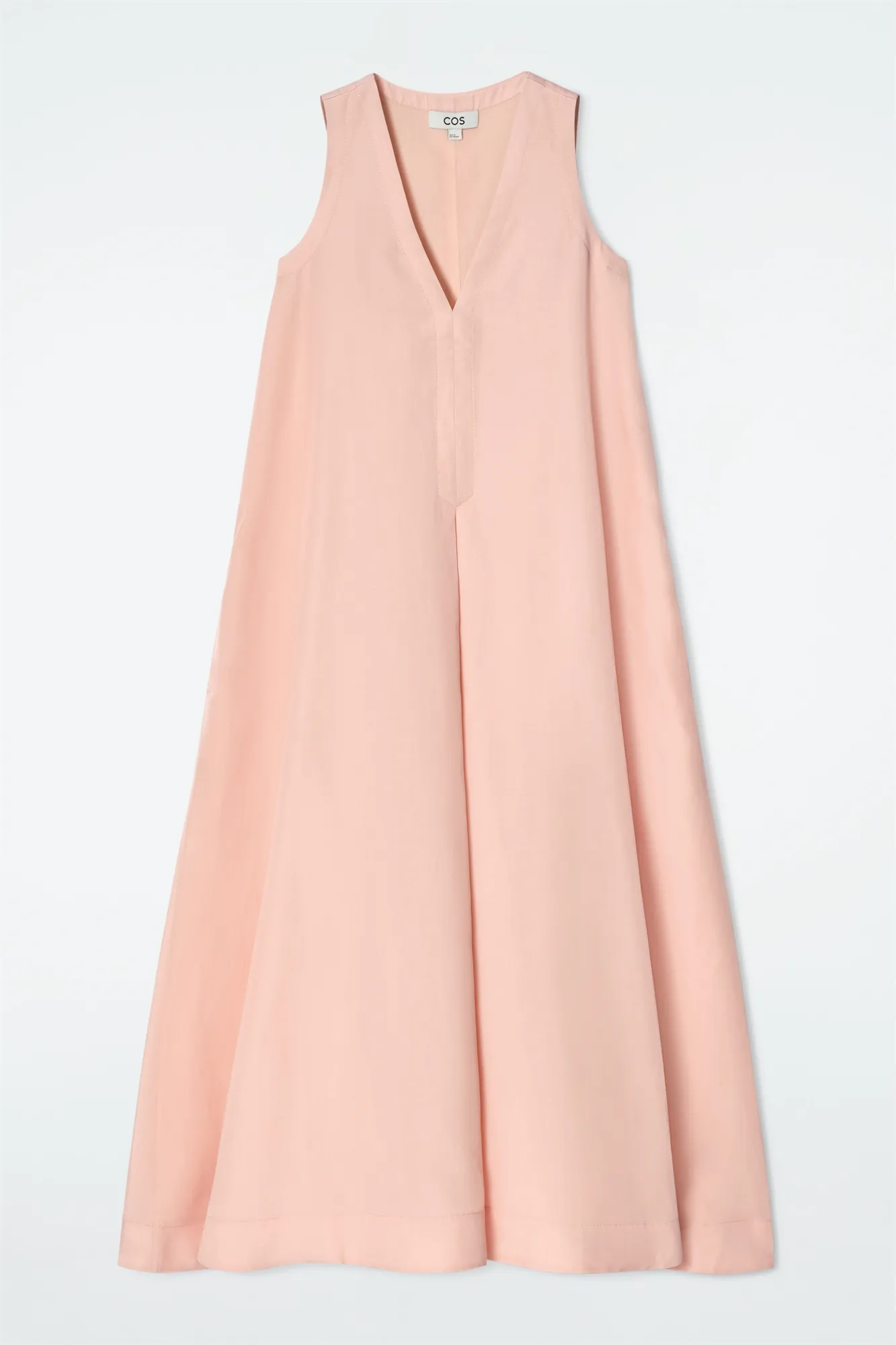 Это простое макси-платье выполнено из легкой, струящейся смеси лиоцелла TENCEL™ и льна, которая красиво драпируется. Модель А-силуэта имеет V-образный вырез и плиссировку, придающую ей объем.