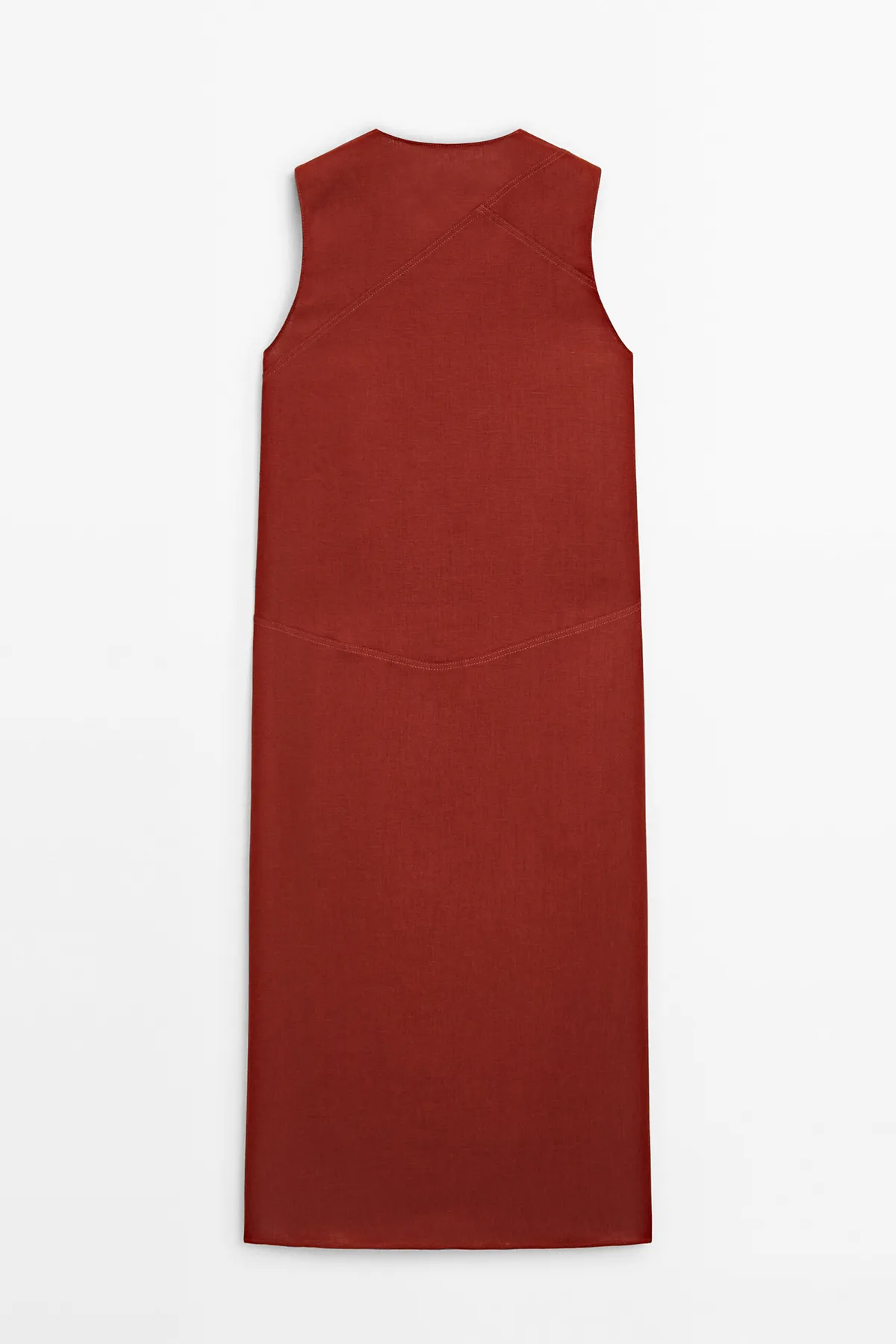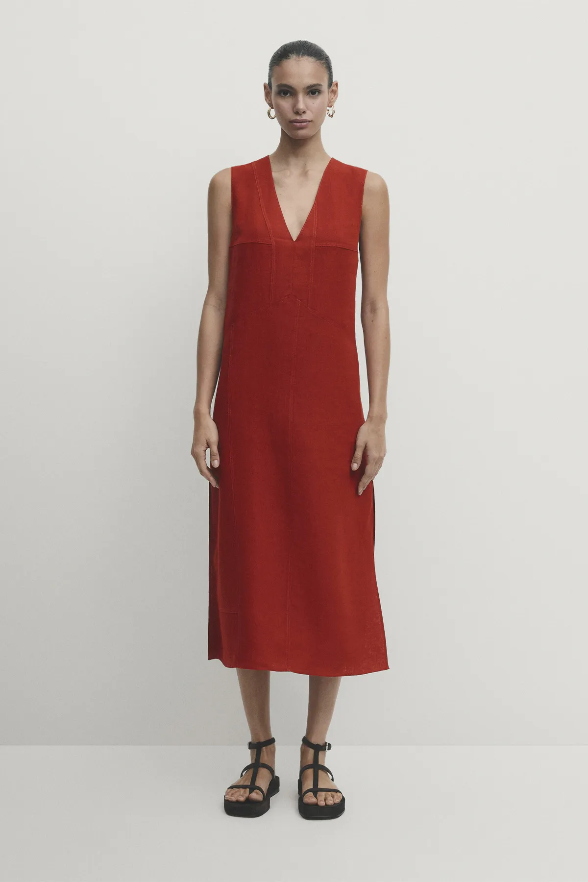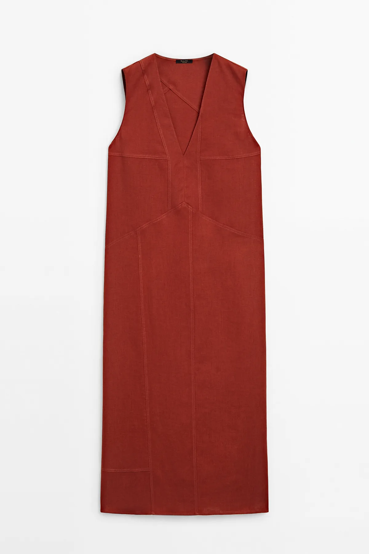 Платье миди с V-образным вырезом и декоративной строчкой. Изготовлено из 100% льна. Контрастный шов в тон. Длина миди. V-образный вырез. Без рукавов. Разрезы по бокам снизу.