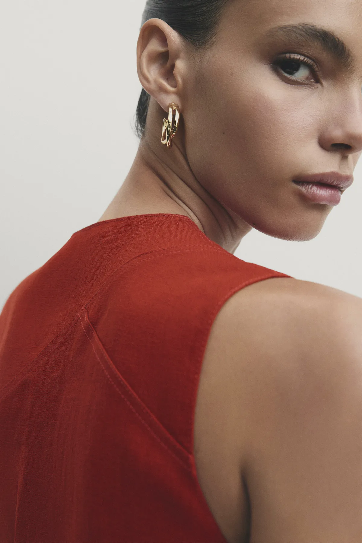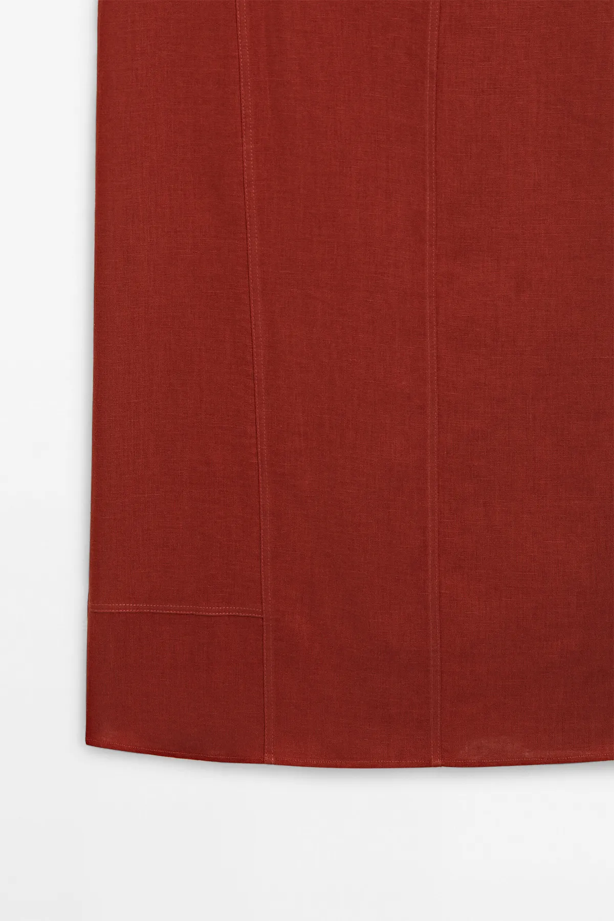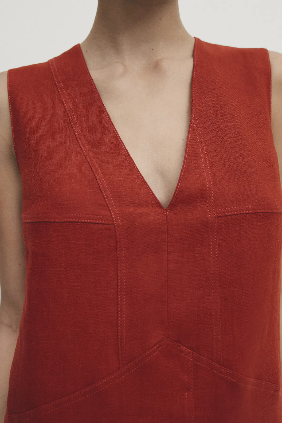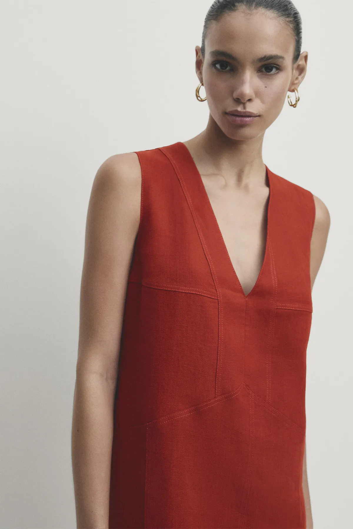 Платье миди с V-образным вырезом и декоративной строчкой. Изготовлено из 100% льна. Контрастный шов в тон. Длина миди. V-образный вырез. Без рукавов. Разрезы по бокам снизу.