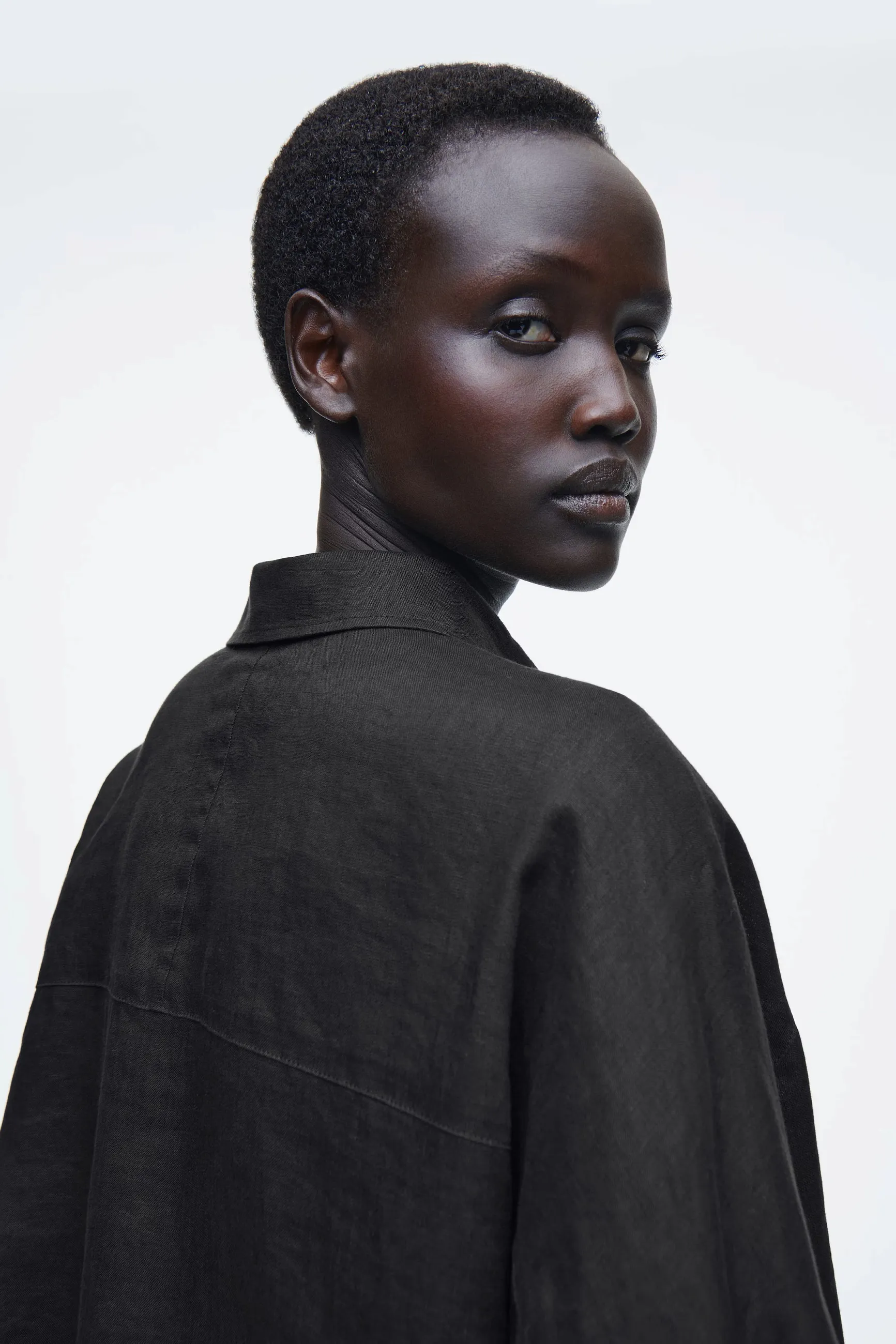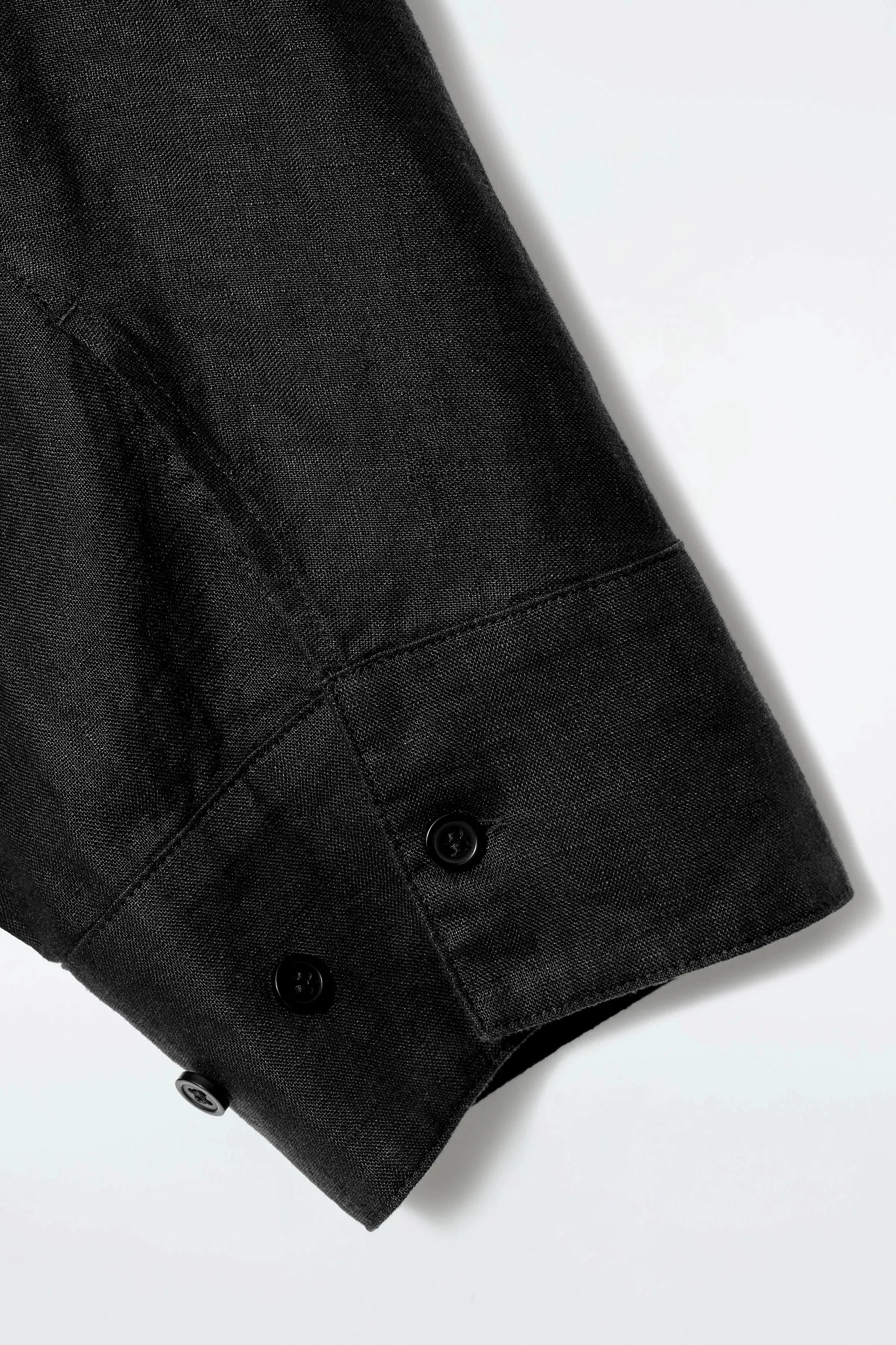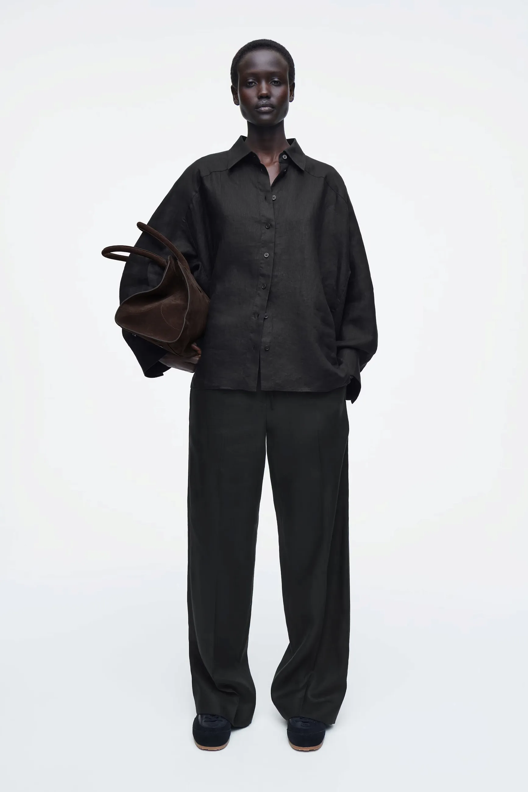 Эта рубашка свободного кроя oversize выглядит очень благородно благодаря льняному материалу и черному оттенку. А рукава реглан и декоративная прострочка по периметру изделия делает силуэт аккуратным и собранным.