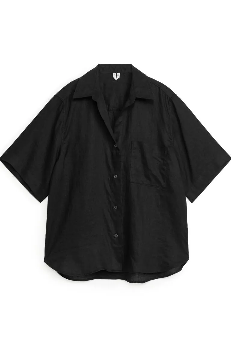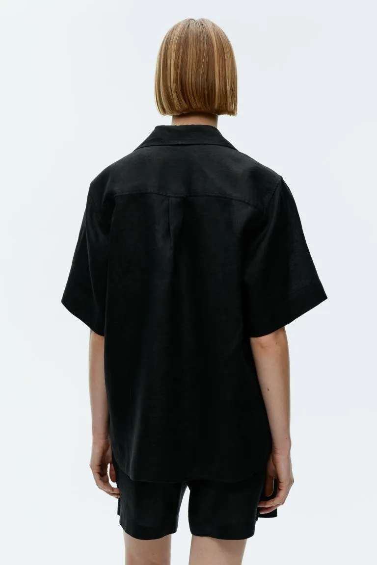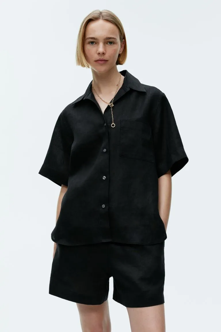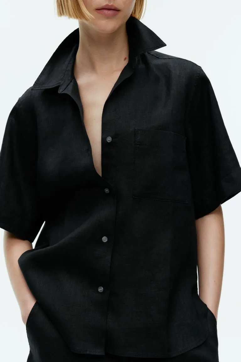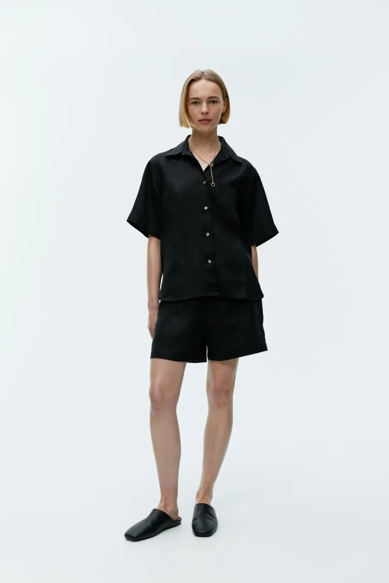 Непринужденная льняная рубашка из чистого льна. Модель с короткими рукавами, кубинским воротником и одним нагрудным карманом. Изогнутый подол. Пуговицы выполнены из перламутра, т.е. это означает, что изделие содержит нетекстильные части животного происхождения.
