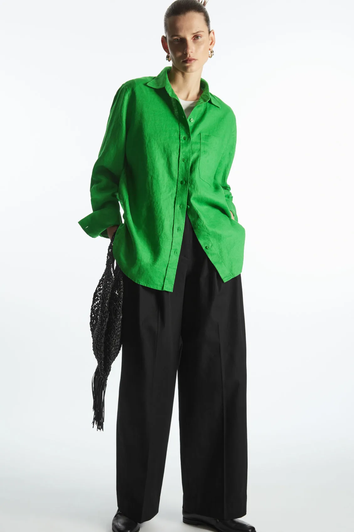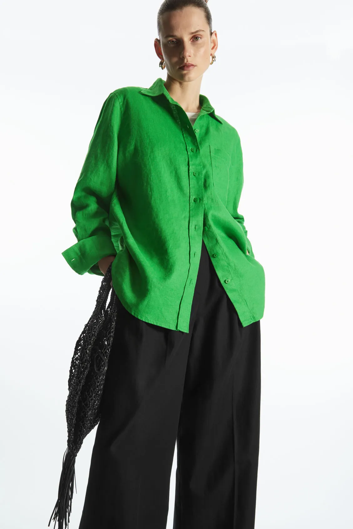 Эта ярко-зеленая рубашка изготовлена из легкого дышащего льна с натуральной текстурой. Свободный крой идеально подходит для ношения поверх майки в теплые дни. Детали дизайна включают остроконечный воротник, накладной карман и закругленный многоуровневый низ.