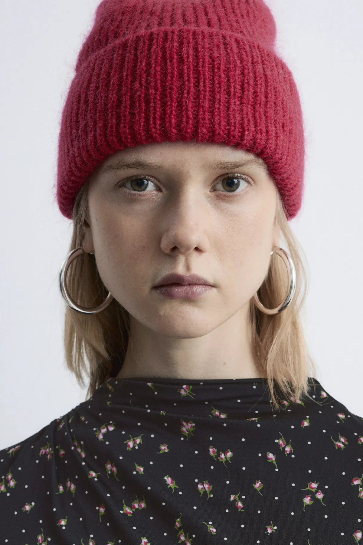 Эта шапка-бини из смеси мягчайшего мохера и шерсти, связанная в рубчик, отличается классическим дизайном. Широкие поля можно носить как в сложенном, так и в разложенном виде.