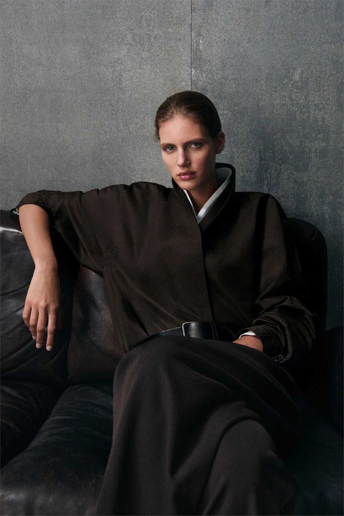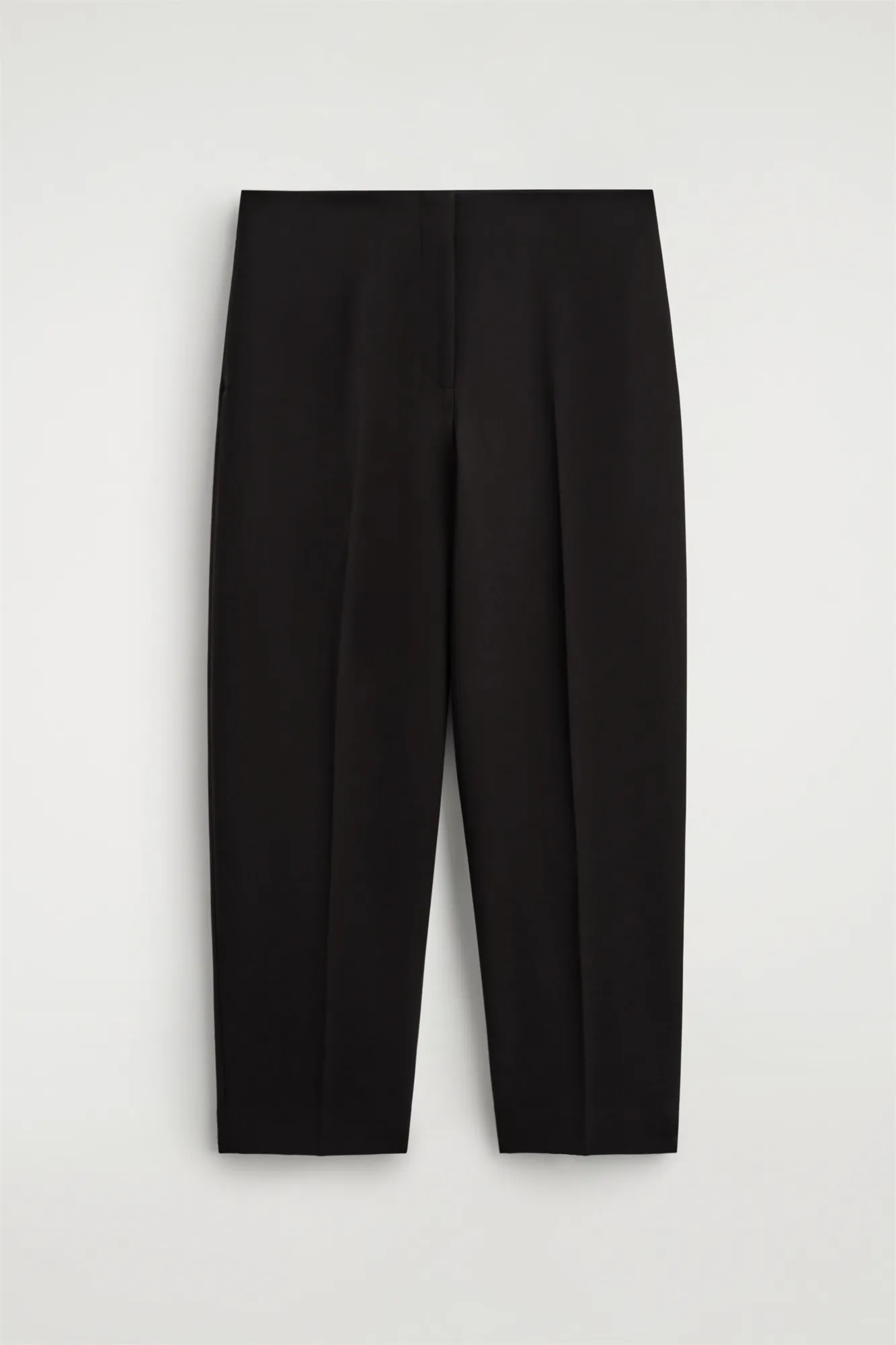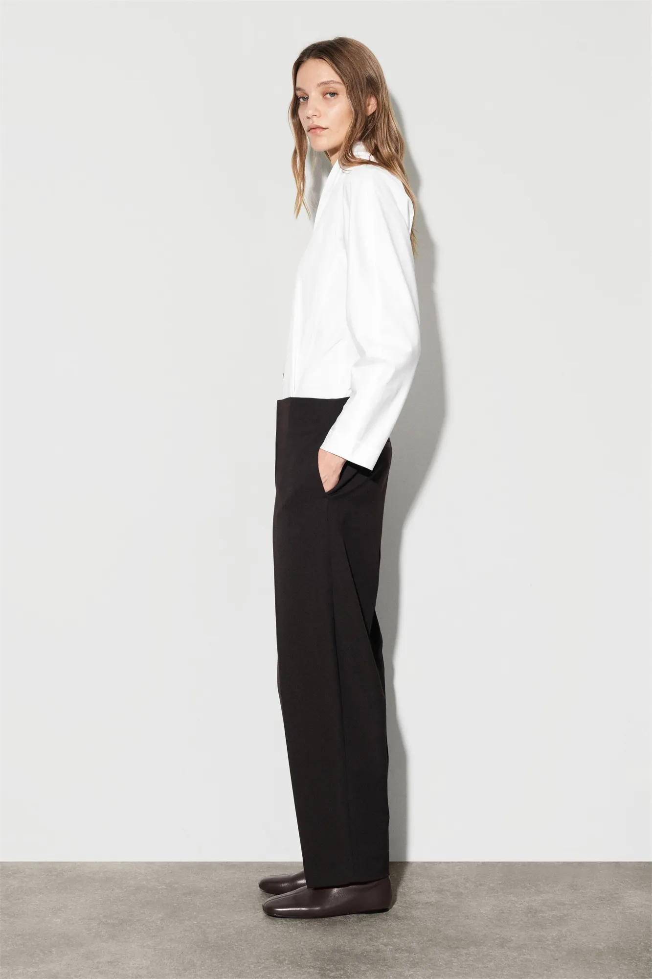Эти современные брюки сочетают в себе классическую форму бочкообразных ног COS и изысканный пошив. Они выполнены из мягкой шерстяной смеси RWS в насыщенном цвете эспрессо и имеют заутюженные складки и тонкие карманы.