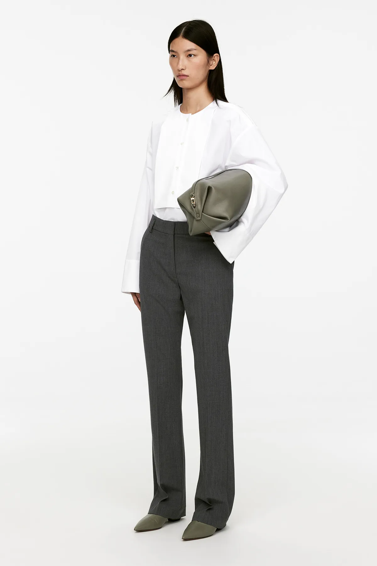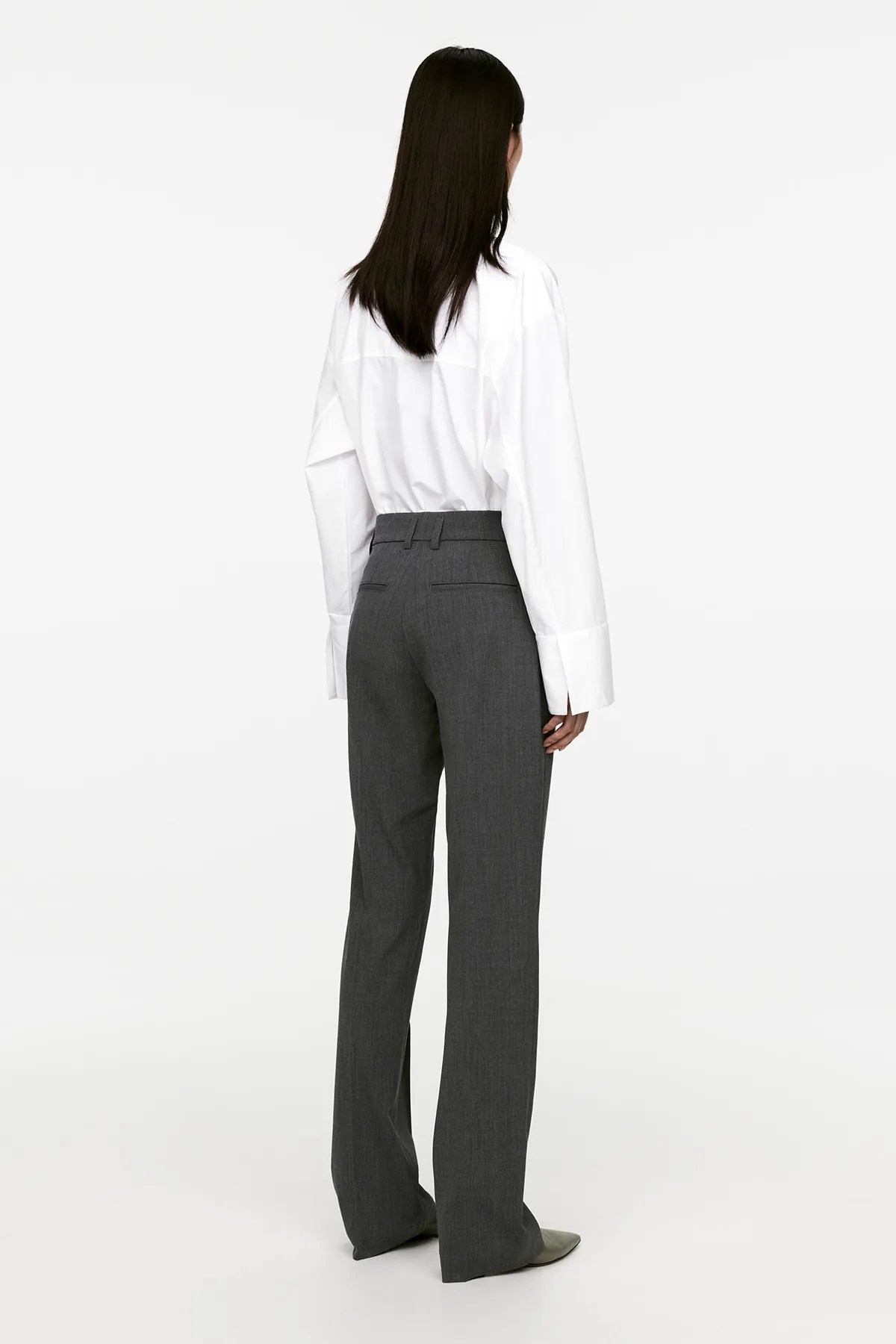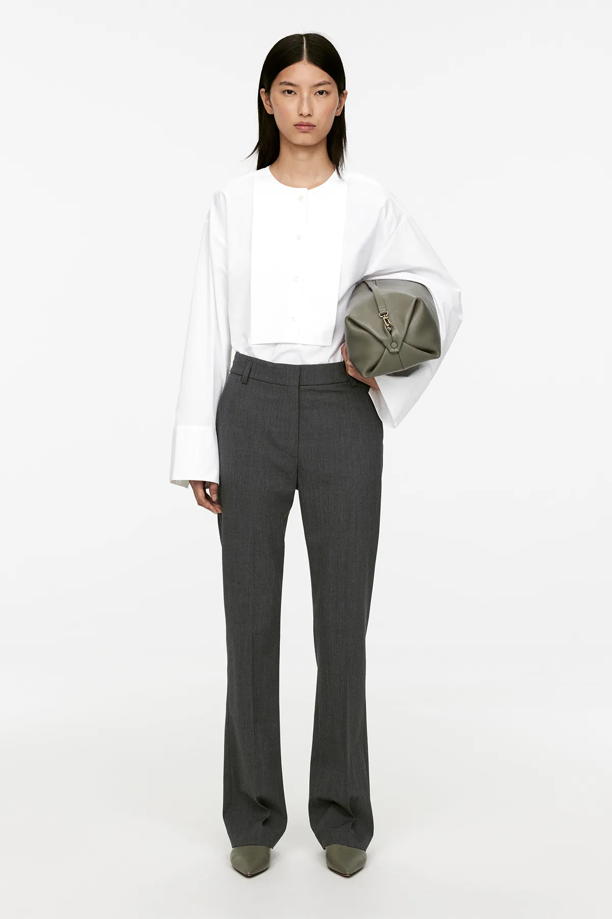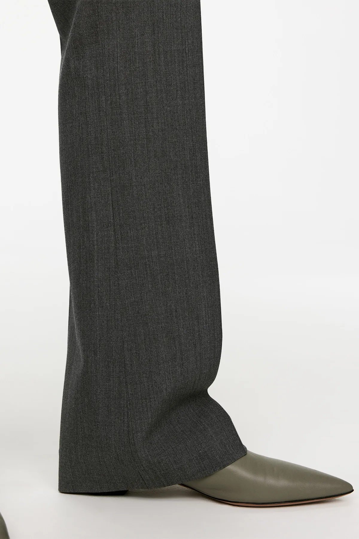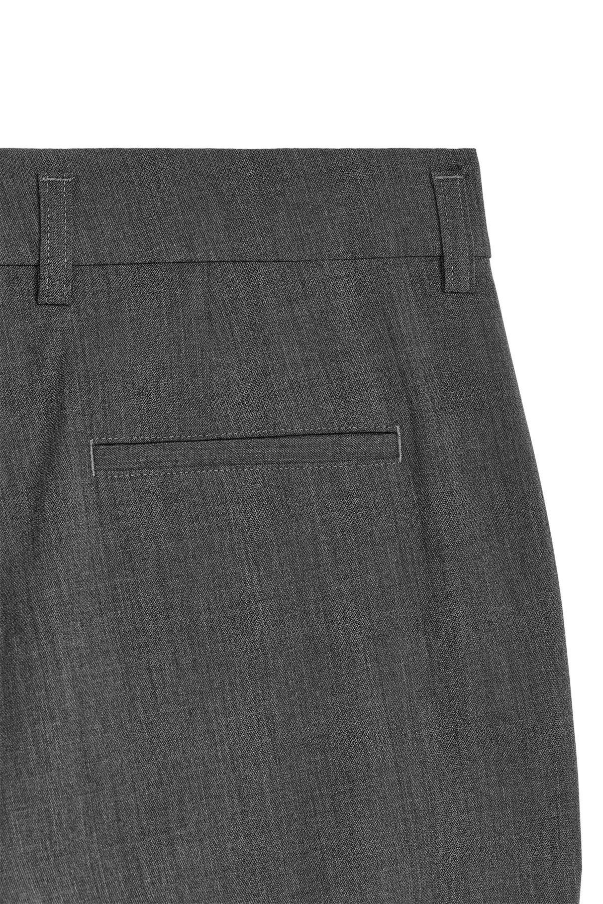 Брюки по фигуре из шерсти с добавлением эластана для эластичности. Спереди и сзади заложены складки, а талия средней высоты. Ткань содержит 98% шерсти RWS (TE-00047206). Изделия, сертифицированные по стандарту Responsible Wool Standard (RWS), содержат шерстяное волокно с ферм, прошедших независимую сертификацию по требованиям к защите животных и управлению земельными ресурсами.