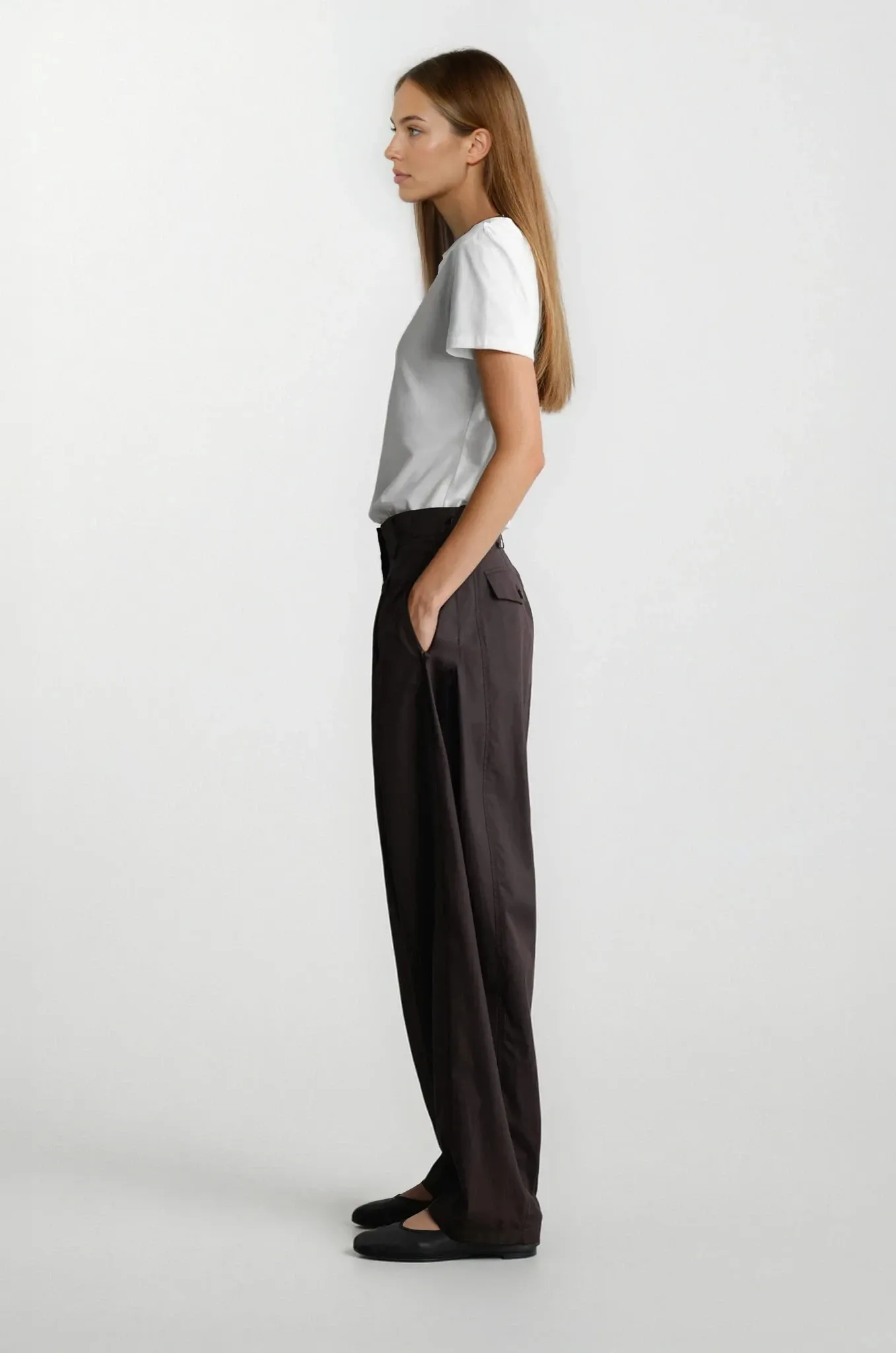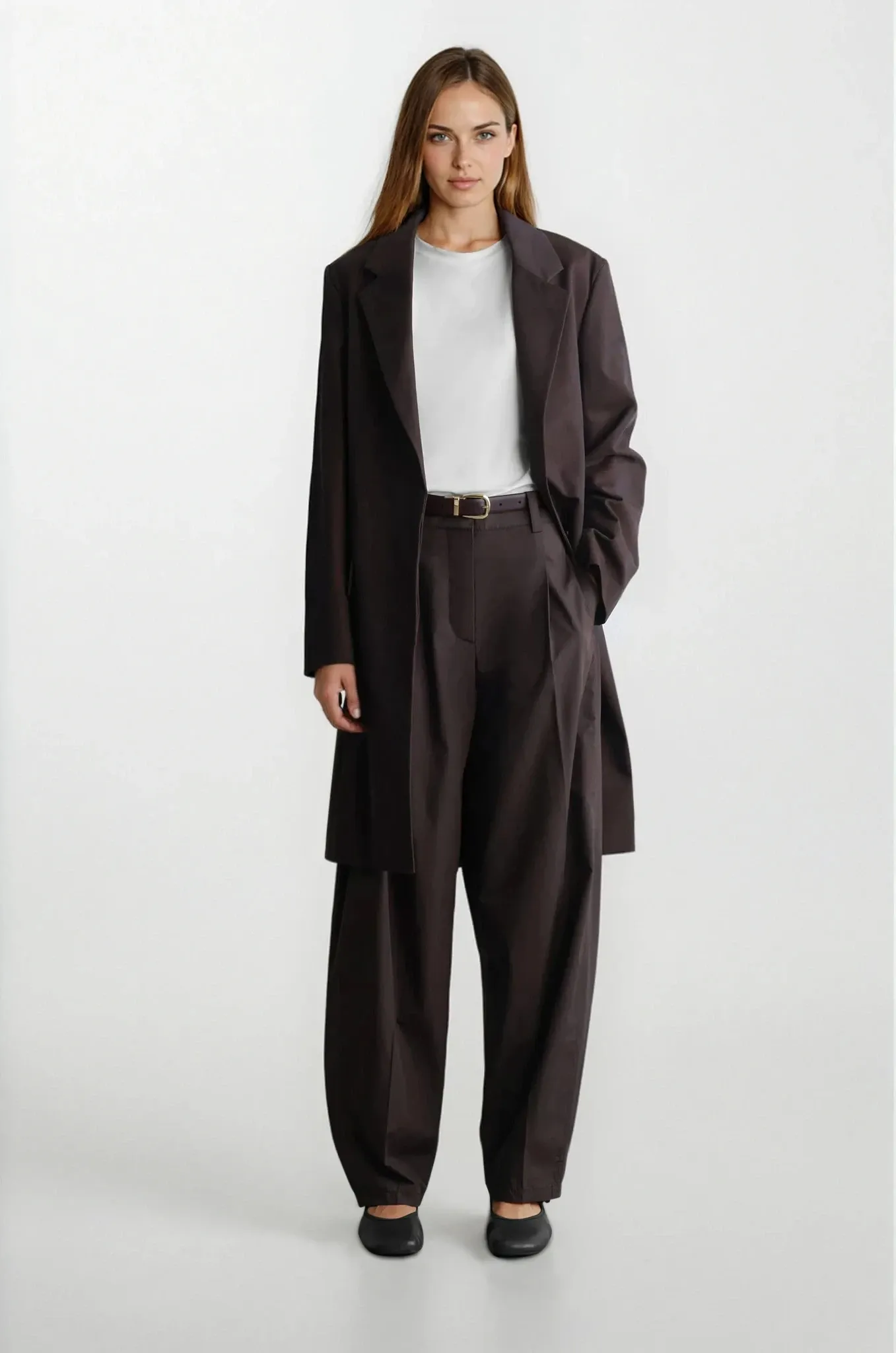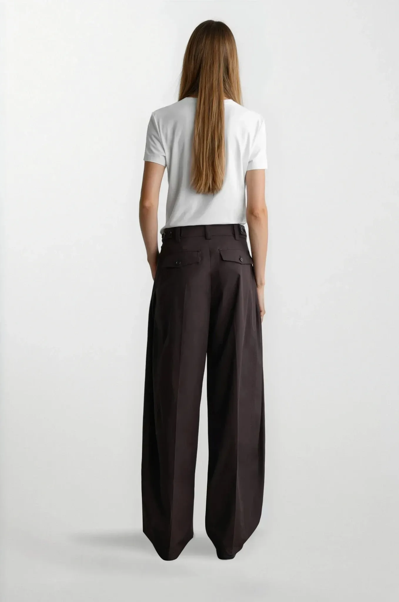 Брюки-бочонки — визитная карточка женской коллекции. Изготовленные из высококачественного пима-хлопка, эти брюки отличаются скульптурным силуэтом, складками и хлястиками на пуговицах на талии. Носите их с футболкой.
