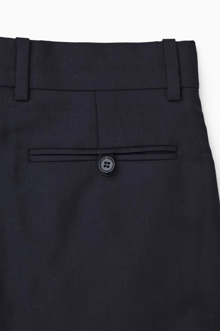 Эти элегантные брюки классического темно-синего цвета с заниженной талией выполнены в стиле 2000-х годов. Они изготовлены из эластичной шерсти, имеют прямой крой, характерные складки по центру и внутреннюю петлю на поясе для регулировки посадки. Завершите образ подходящим пиджаком.