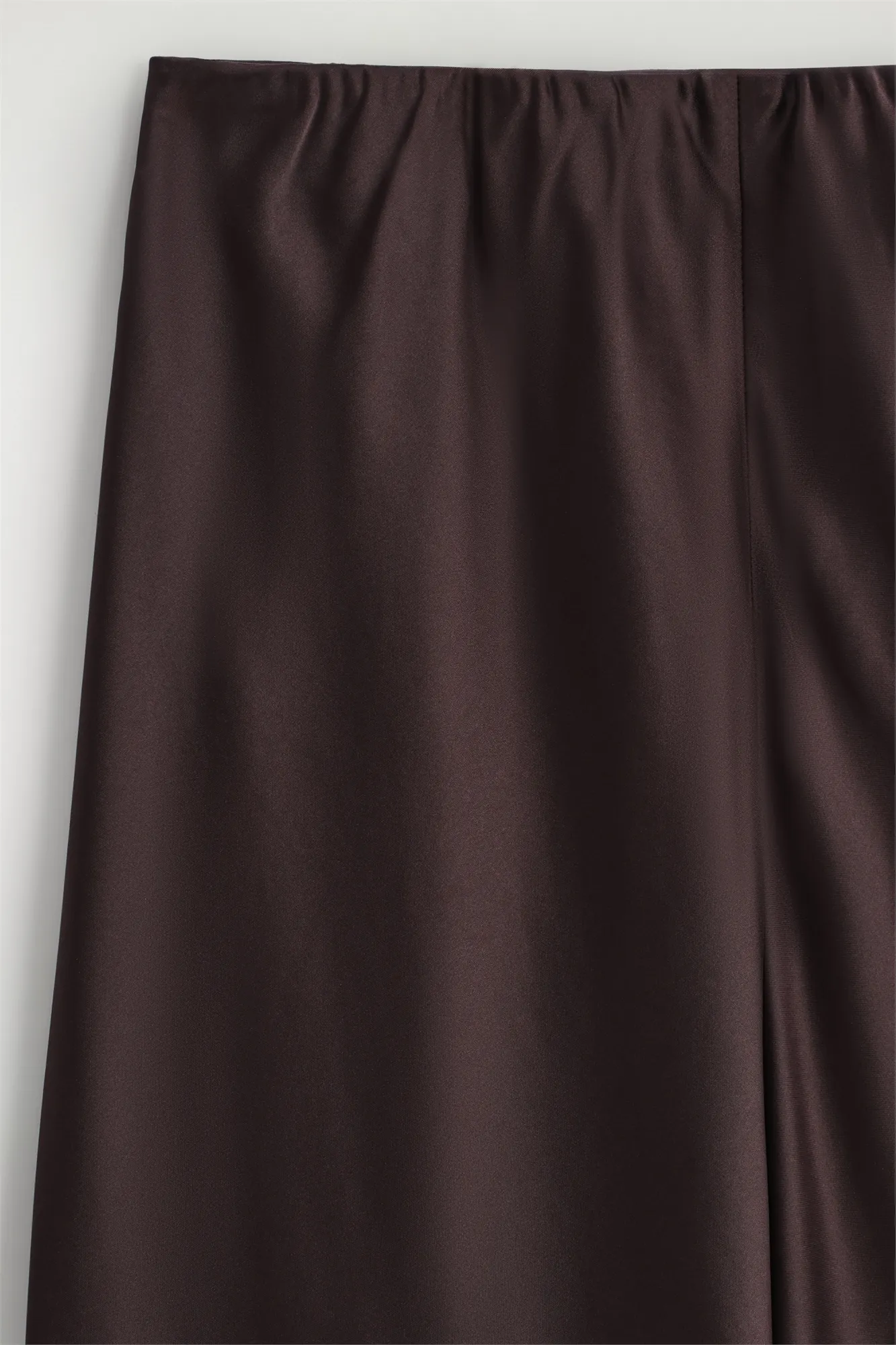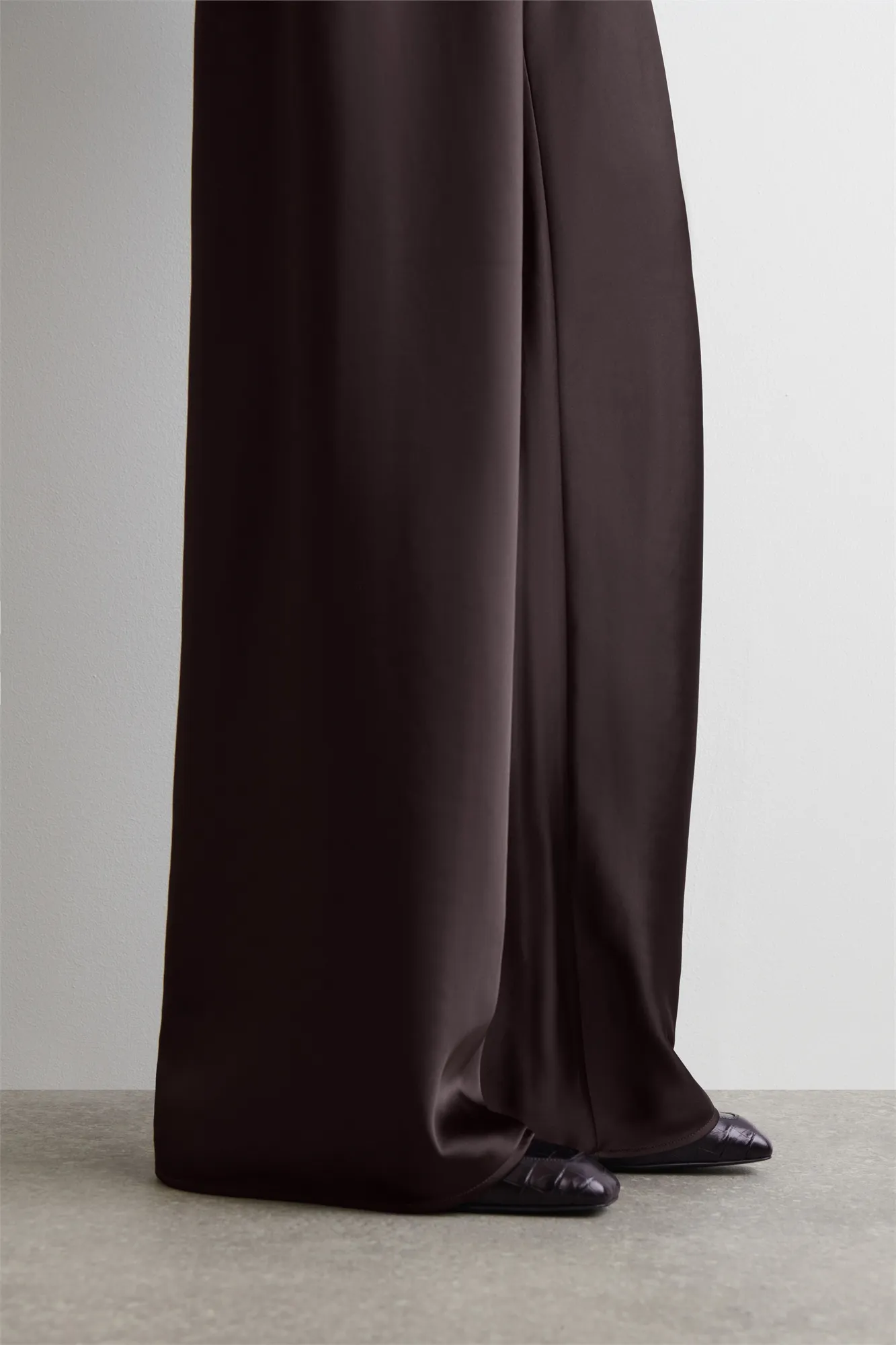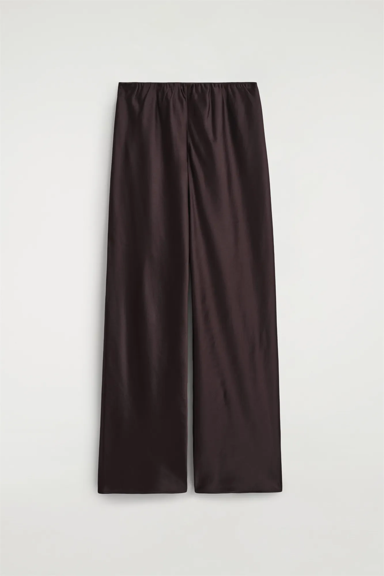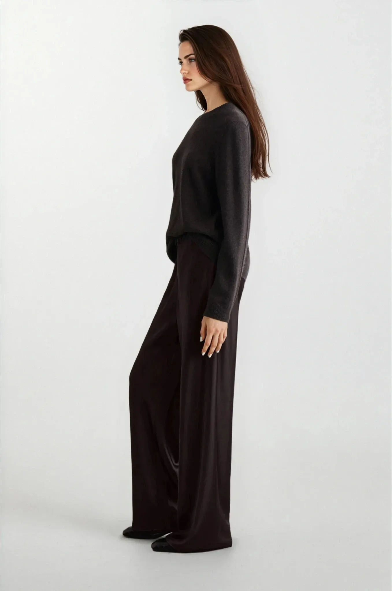 Эти современные темно-коричневые брюки изготовлены из мягкого атласа с легким блеском. У них широкие штанины и эластичный пояс.