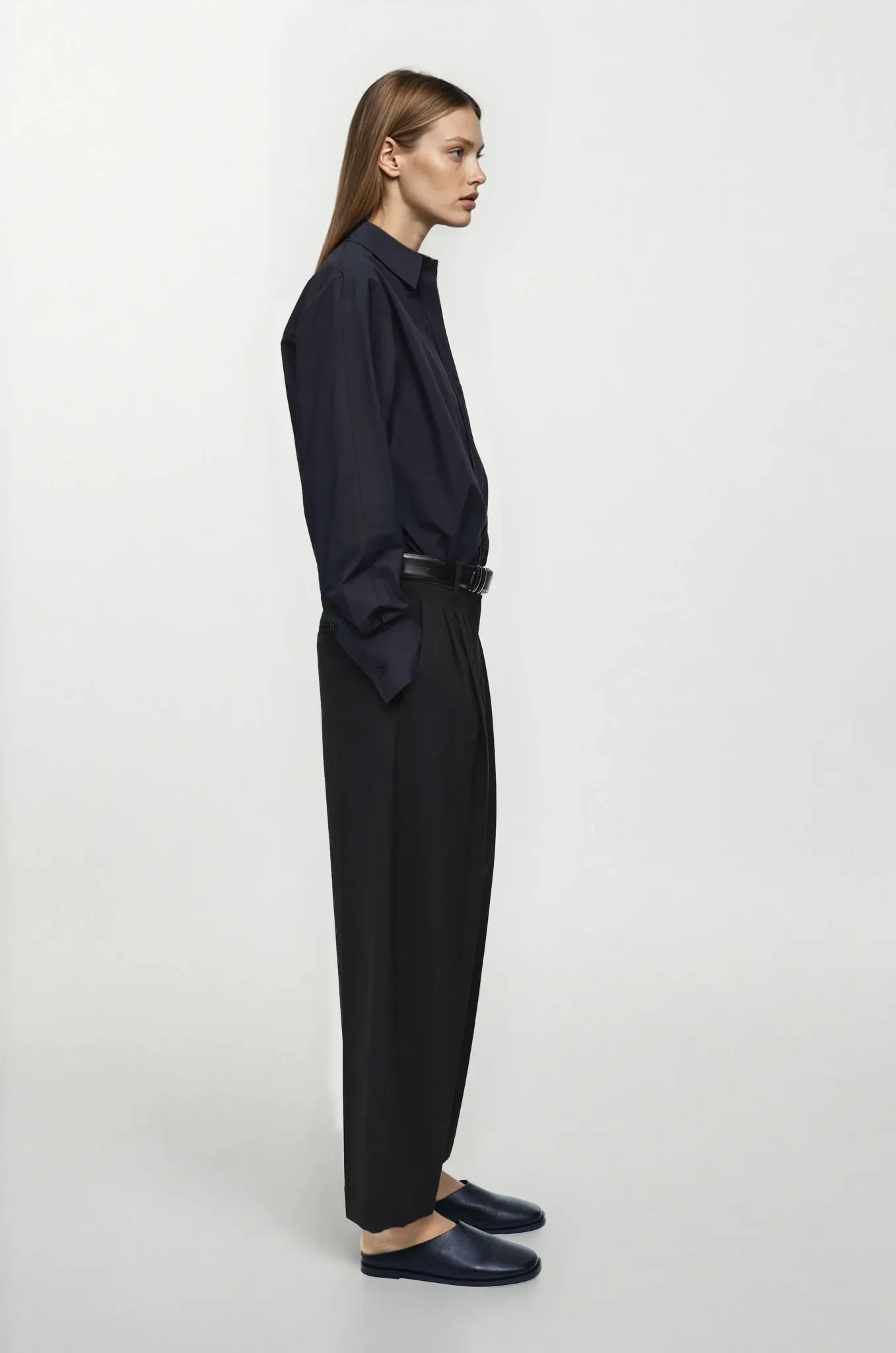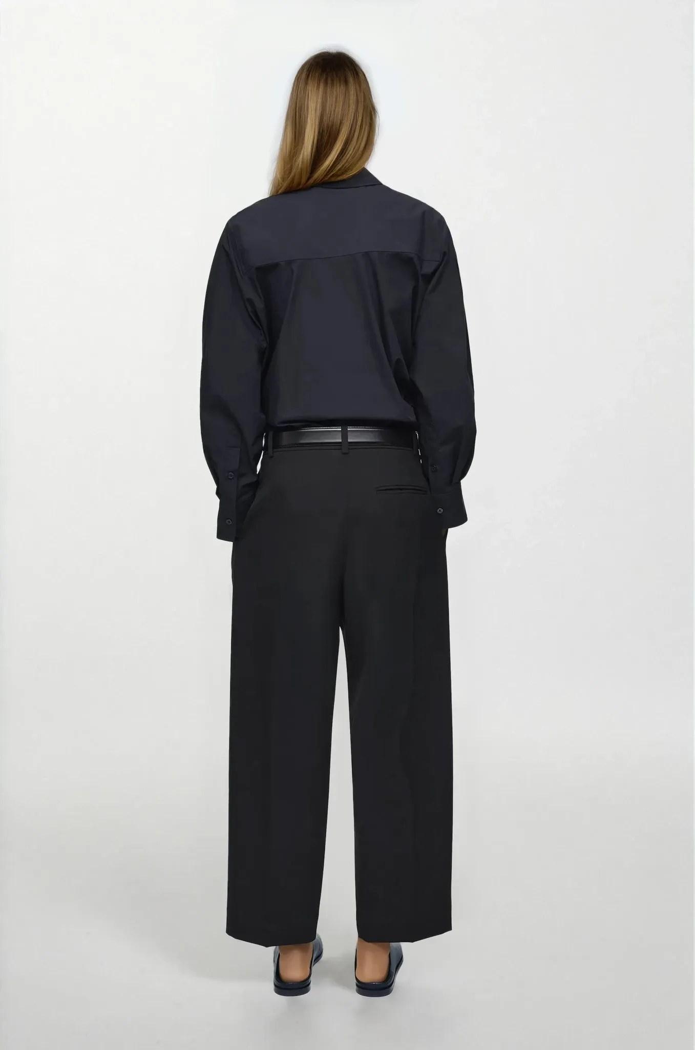 Эти брюки имеют форму бочкообразной штанины, которая добавит направленный штрих к повседневному гардеробу. Они предлагаются в классическом черном цвете и сшиты из шерстяной саржи со складками и укороченными краями, которые обрамляют вашу обувь. Брюки дополнены наклонными карманами, шлевками для ремня и прорезным карманом сзади.