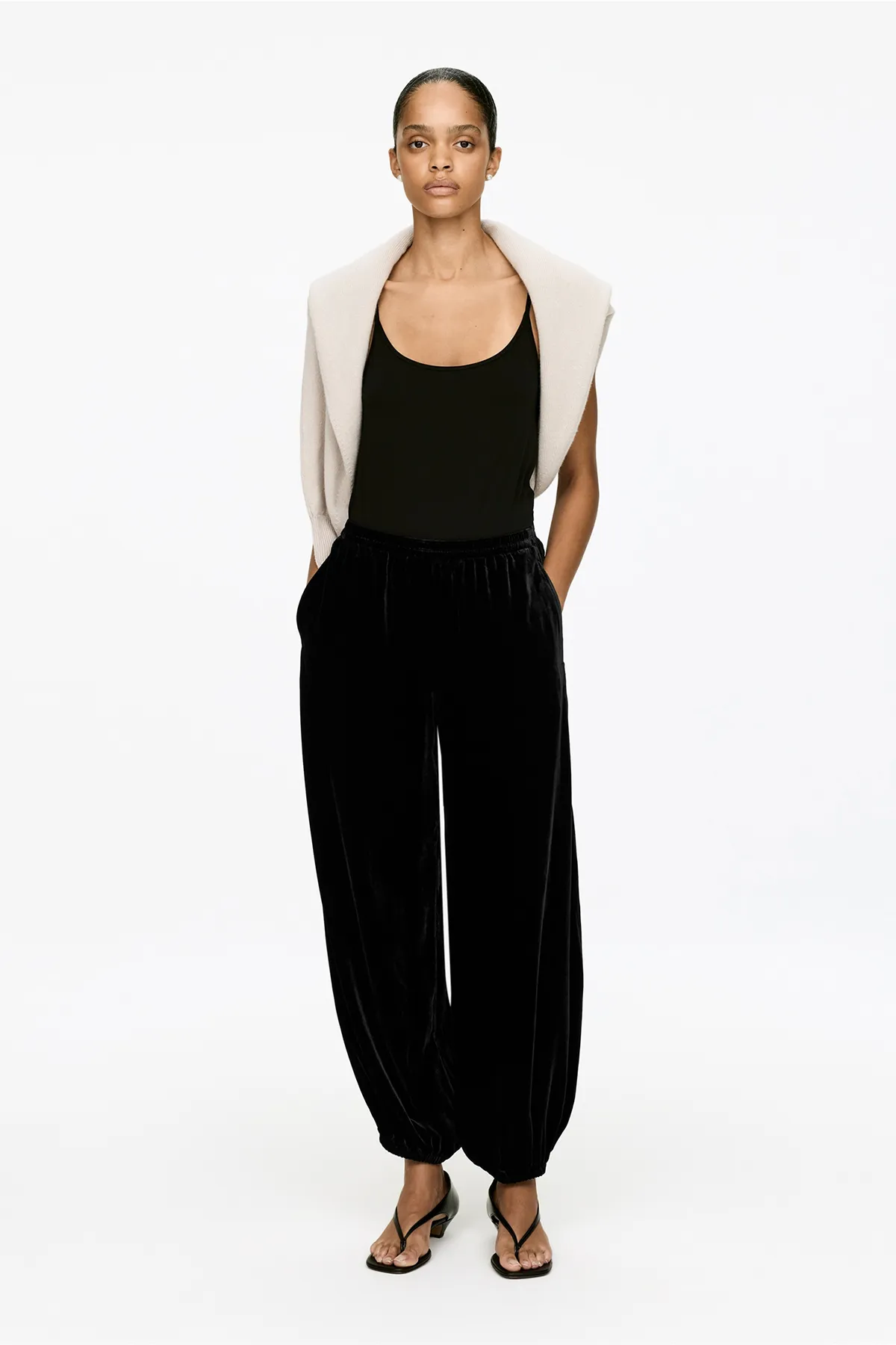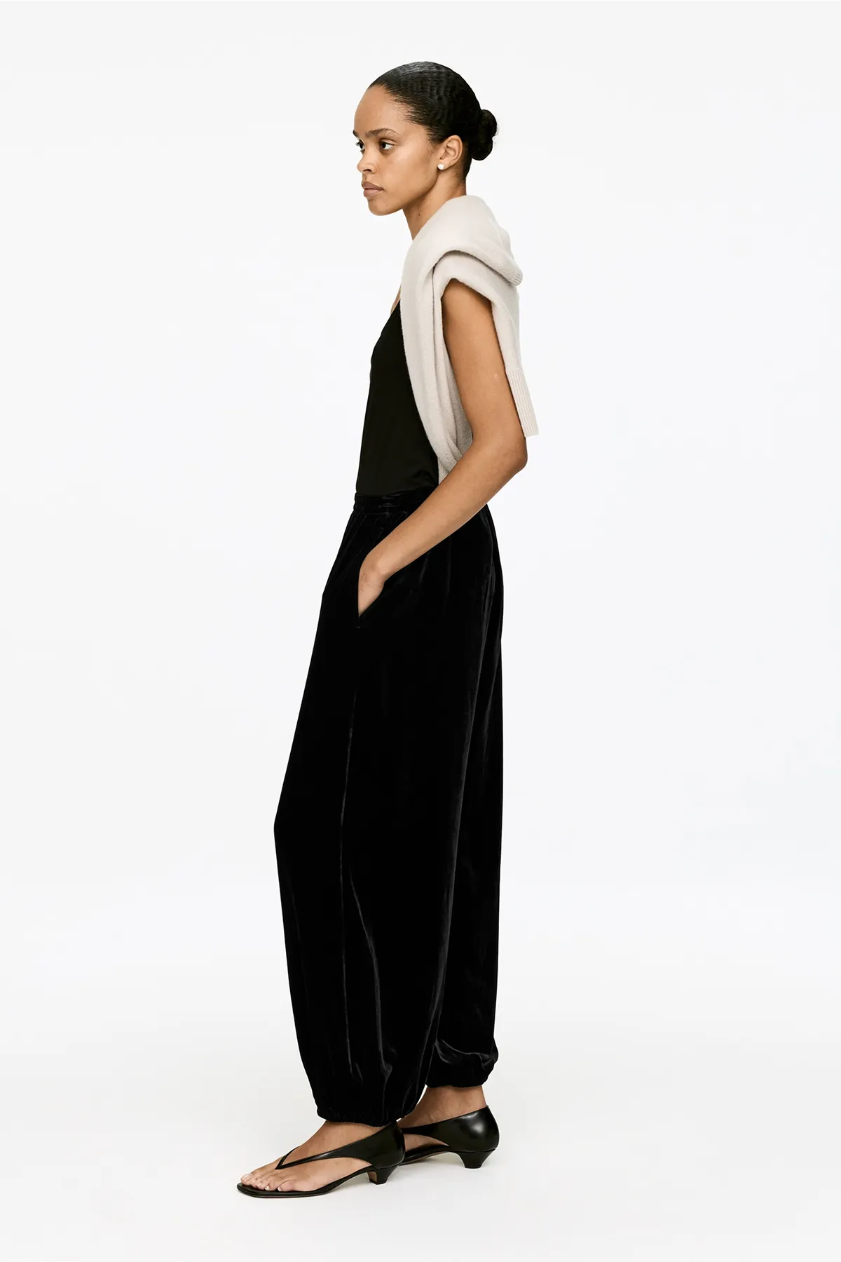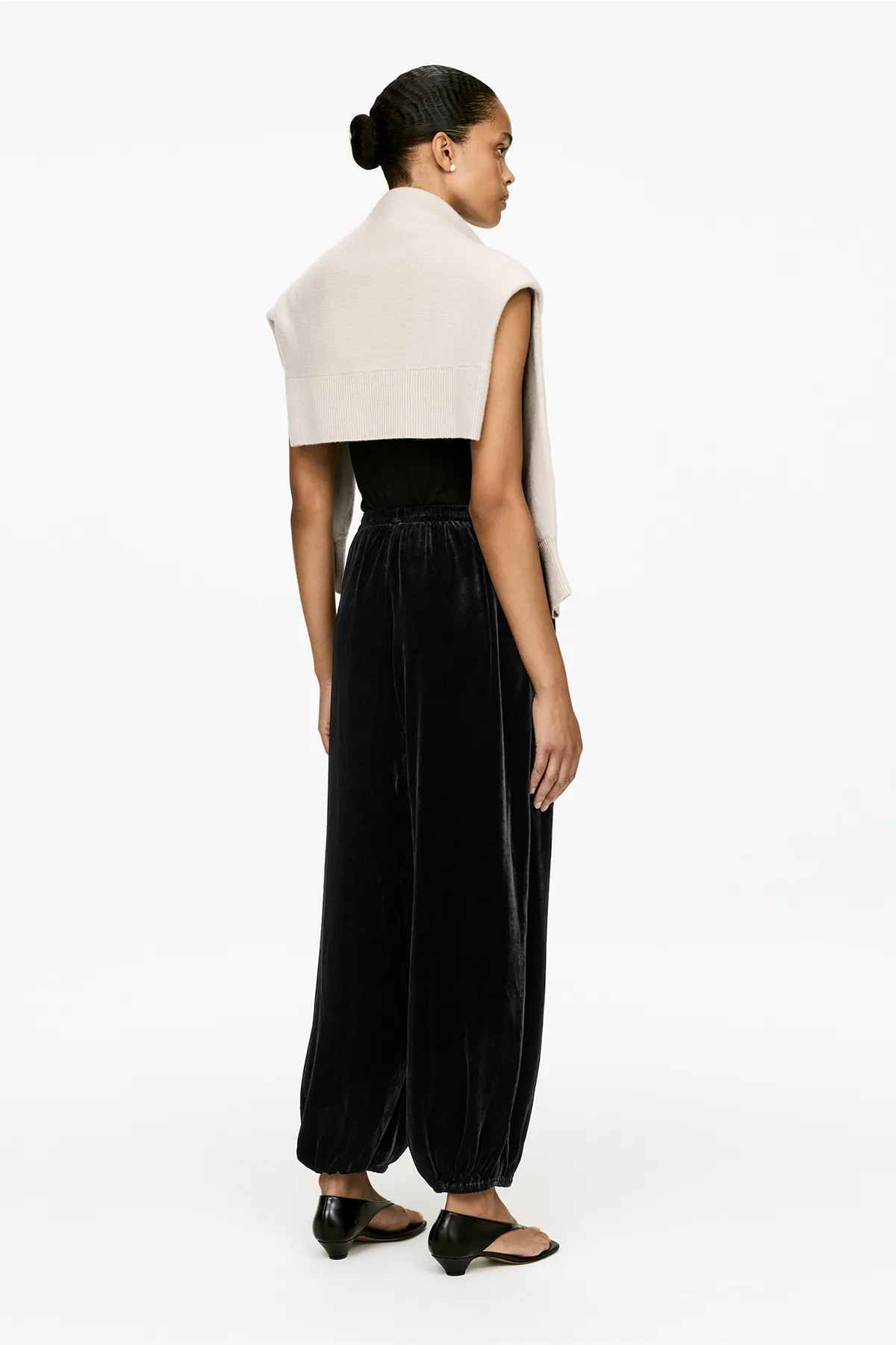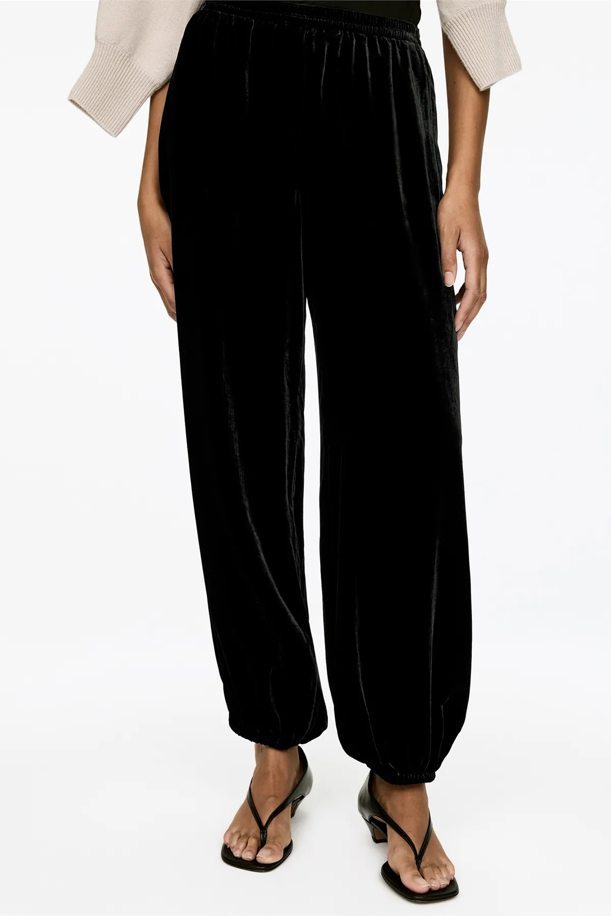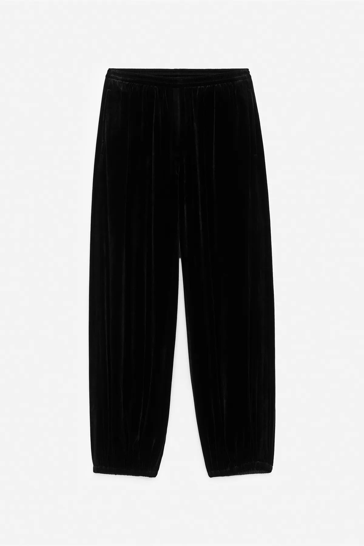 Свободные брюки из смеси вискозы и шелка. Дизайн включает боковые карманы, эластичный пояс и пышные штанины.